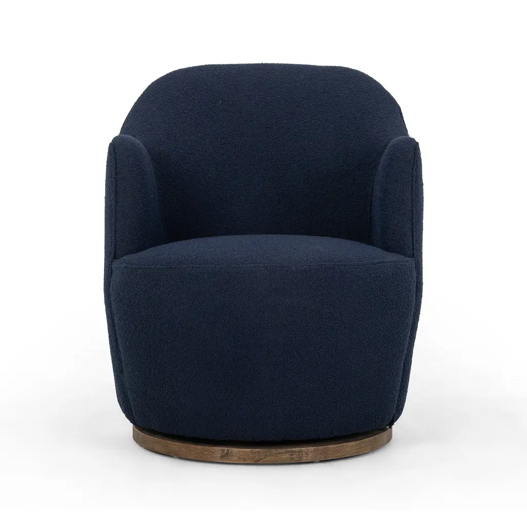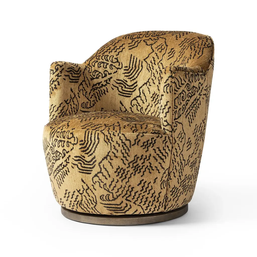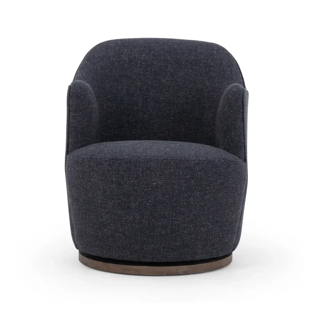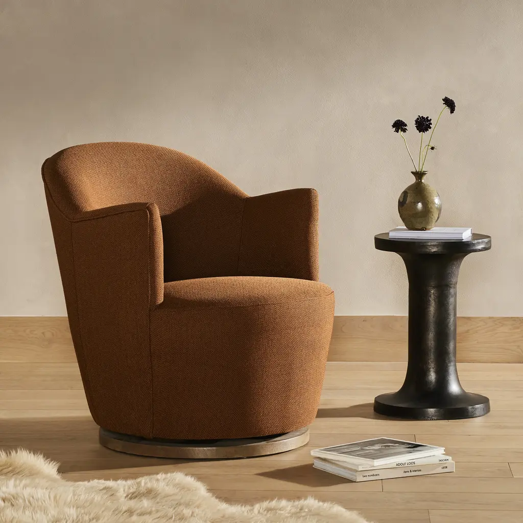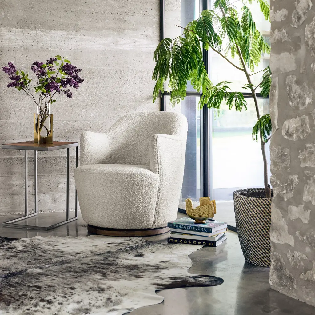 A contemporary statement piece, the Aurora Swivel Chair from Four Hands is an intriguing yet inviting drum-style lounge chair design. Its distressed natural wood swivel base perfectly balances the feminine form and boasts an eco-friendly build with durable Fiqa fabrics, made from fully recyclable materials that are stain-resistant, water-repellent and antimicrobial for easy cleaning. Highlights