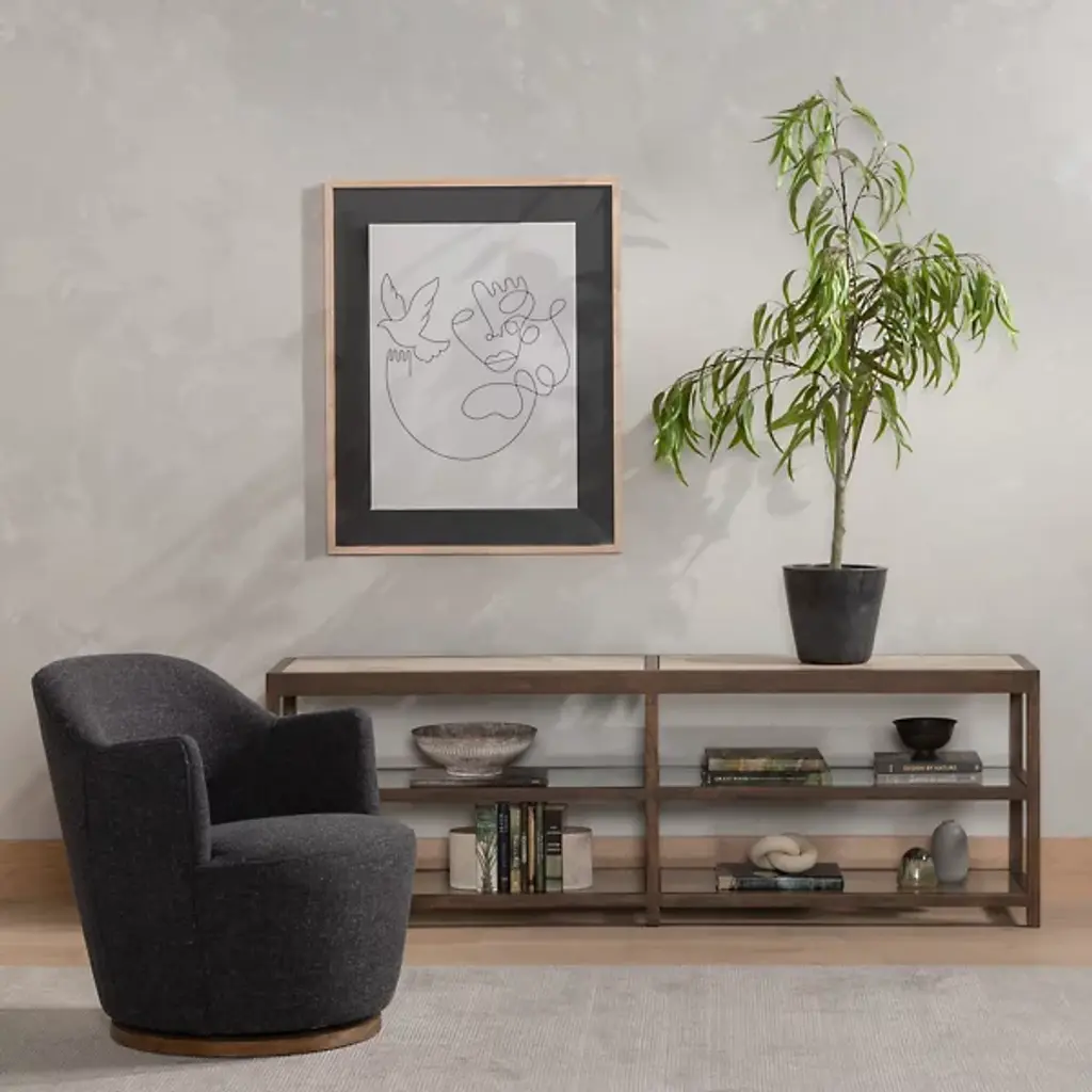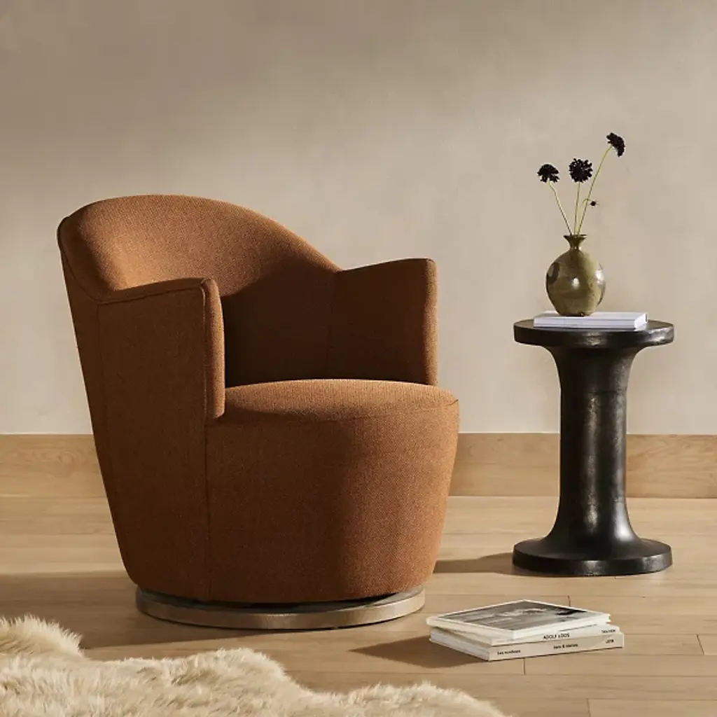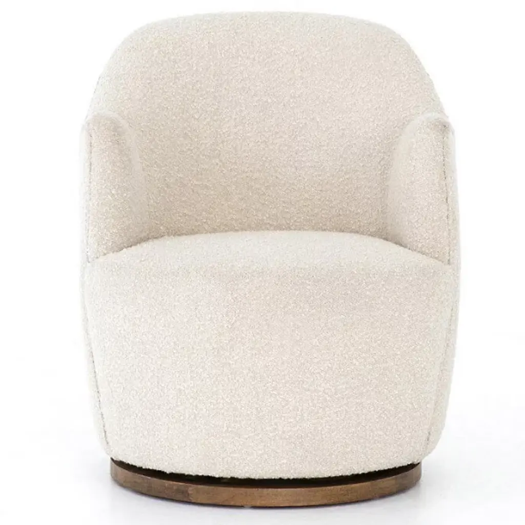 Intriguing yet inviting, the Aurora Swivel Chair from Four Hands is upholstered in a soft, textural, off-white bouclé, offering comfort and style. The natural parawood base features a 360-degree swivel, adding a modern twist to its elegant, feminine design. This versatile piece brings a touch of sophistication to any space, blending its unique form with practical functionality for a seating option that’s both chic and comfortable. Perfect for adding a fresh, contemporary vibe to your decor.