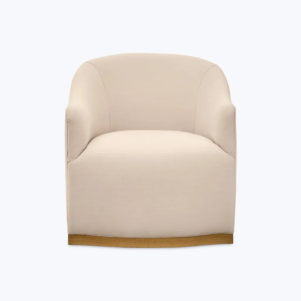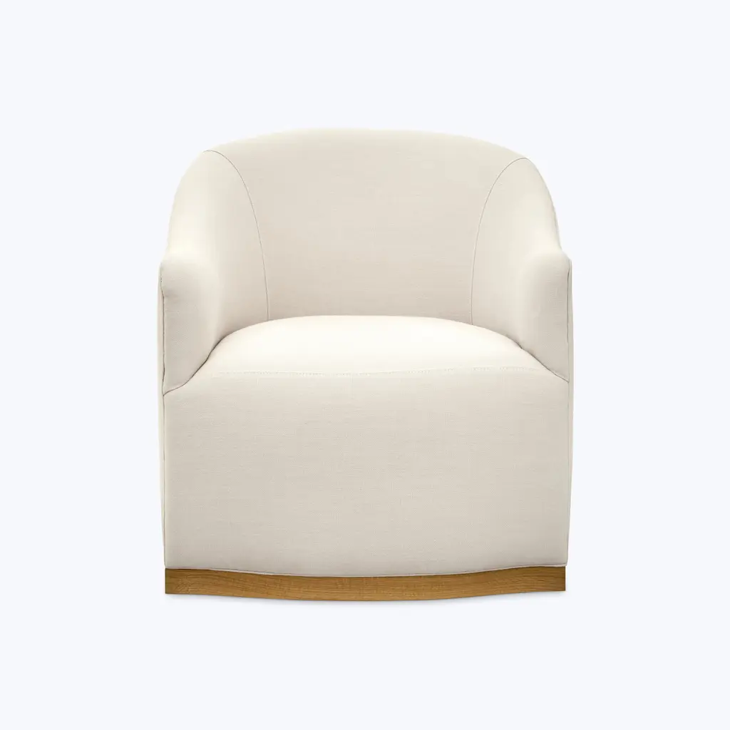 The Ava Wood Plinth Swivel Chair by Cisco Home brings sculptural elegance and quiet luxury into perfect balance. Refined, inviting, and beautifully proportioned, Ava is designed for those who appreciate seating that feels as artful as it is comfortable. Its soft curves and tailored tight seat create a silhouette that feels effortless from every angle, making it an ideal piece for open concept living rooms, reading corners, and modern lounge spaces. Handcrafted in the USA, the Ava Chair is built on a solid FSC certified wood frame, reflecting Cisco Home’s commitment to responsible materials and enduring craftsmanship. The chair rests on a dramatic wood plinth swivel base, a defining feature that grounds the design while giving it a subtle floating effect. This sculptural foundation adds depth and dimension, transforming Ava from a simple accent chair into a room-anchoring statement. The smooth, seamless swivel offers fluid movement that enhances conversation and flow within the room, making Ava as functional as it is beautiful. As the New York home of Cisco Home, abc carpet and home offers a curated palette of materials, tones, and textures that elevate Ava’s refined presence. Whether styled in warm neutrals, rich earthy shades, or soft coastal hues, the Ava Wood Plinth Swivel Chair brings warmth, sophistication, and quiet confidence to any room. A timeless expression of design and comfort, Ava is an heirloom-quality chair meant to be lived with, cherished, and admired for years to come.