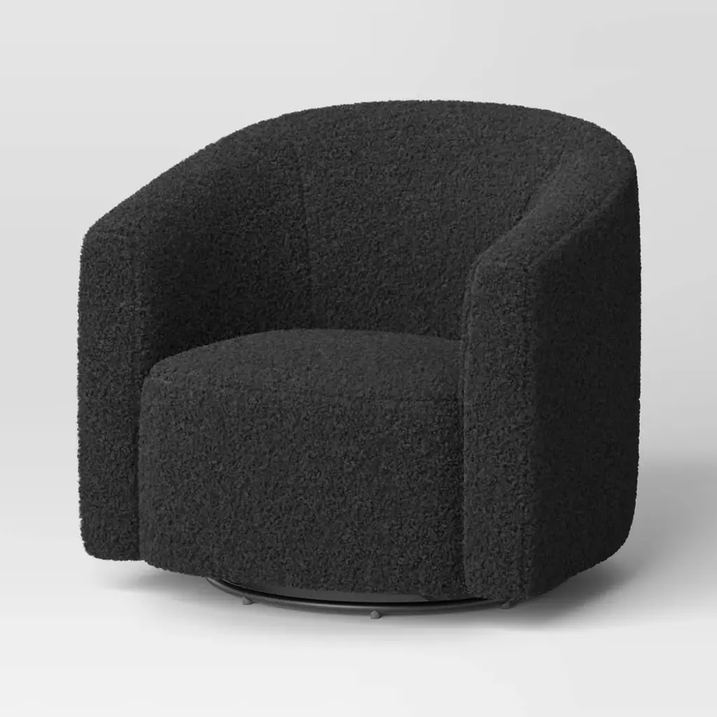 Accent your home with the soft style of this Aveline Large Scale Faux Shearling Swivel Chair from Threshold™. Dressed in chic faux-shearling textured upholstery, this barrel-style accent chair looks at home in an array of styles, while the cushioning elevates the sitting experience with padded comfort. Plus, it swivels on a round metal base for versatility. Whether you use it in your bedroom or place it in a corner to create a reading nook, this upholstered chair adds a comfy seating spot with a dash of statement style. Threshold™: Quality & Design / Casual classics for house and home.