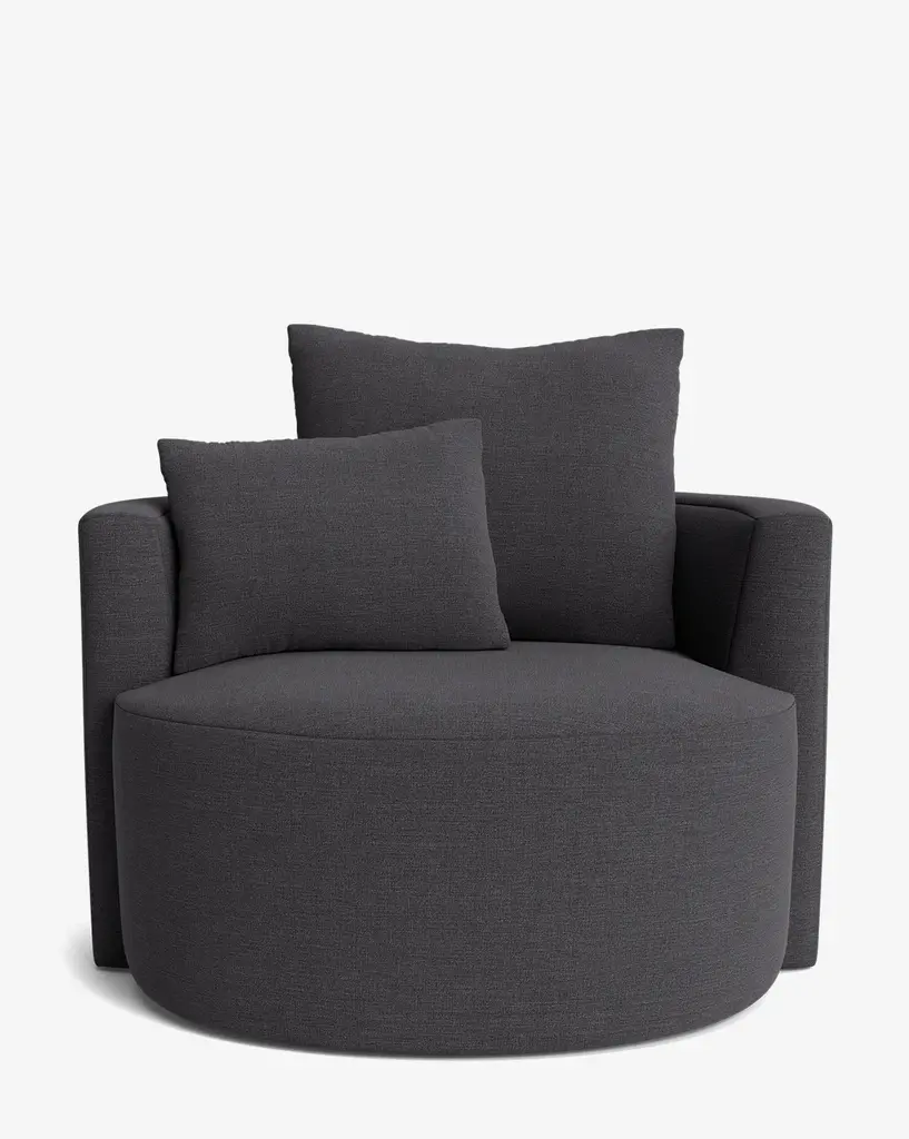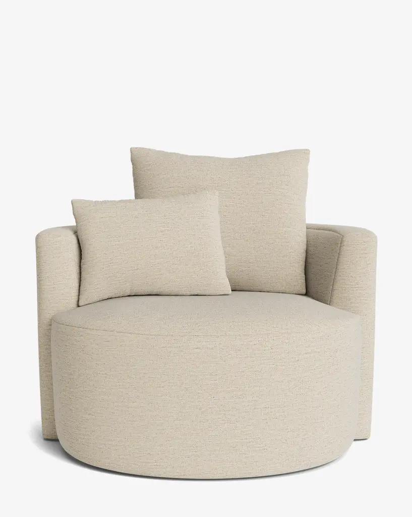 Balancing modern design with approachable comfort and designer details, our Banbury Upholstered Swivel Chair was designed with luxury in mind. Featuring feather blend cushions and pillows within its round structure, the swivel chair is full and inviting. The chair is customizable in a wide array of fabrics, allowing you to personalize your space.