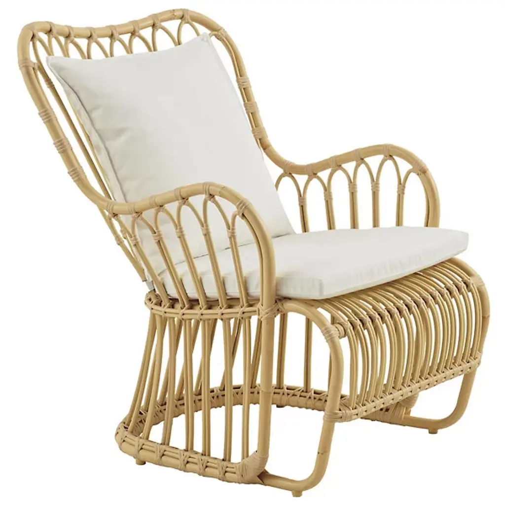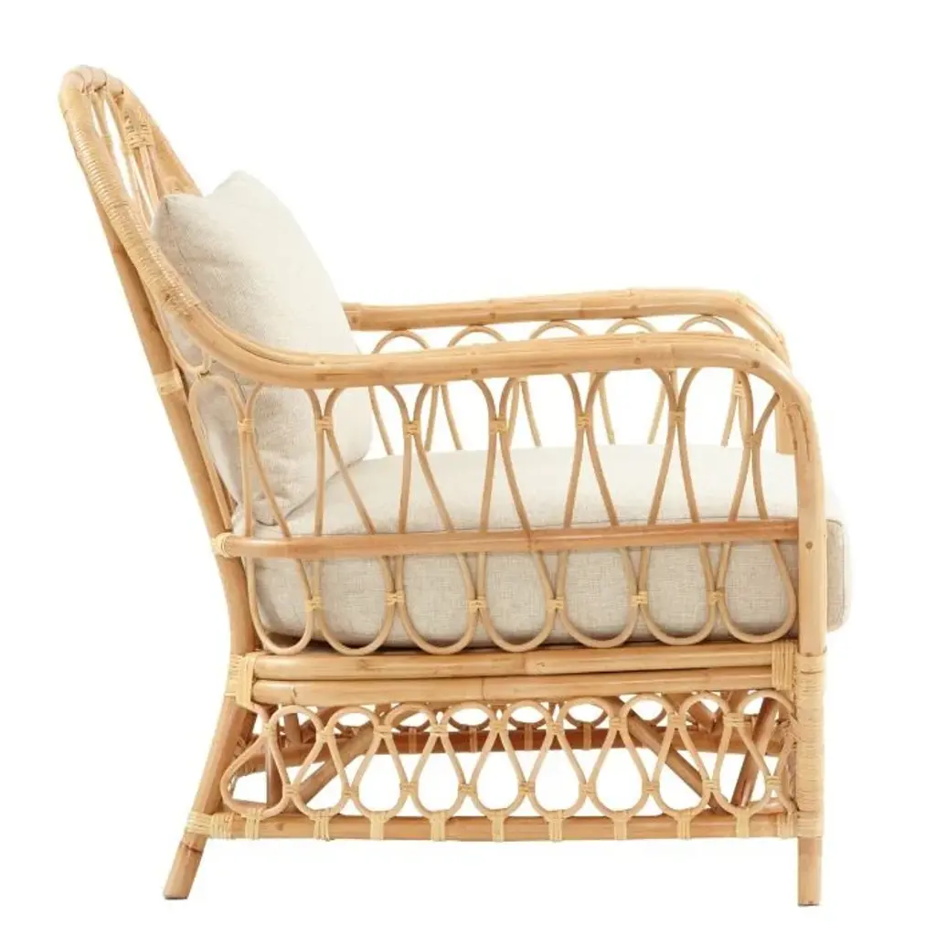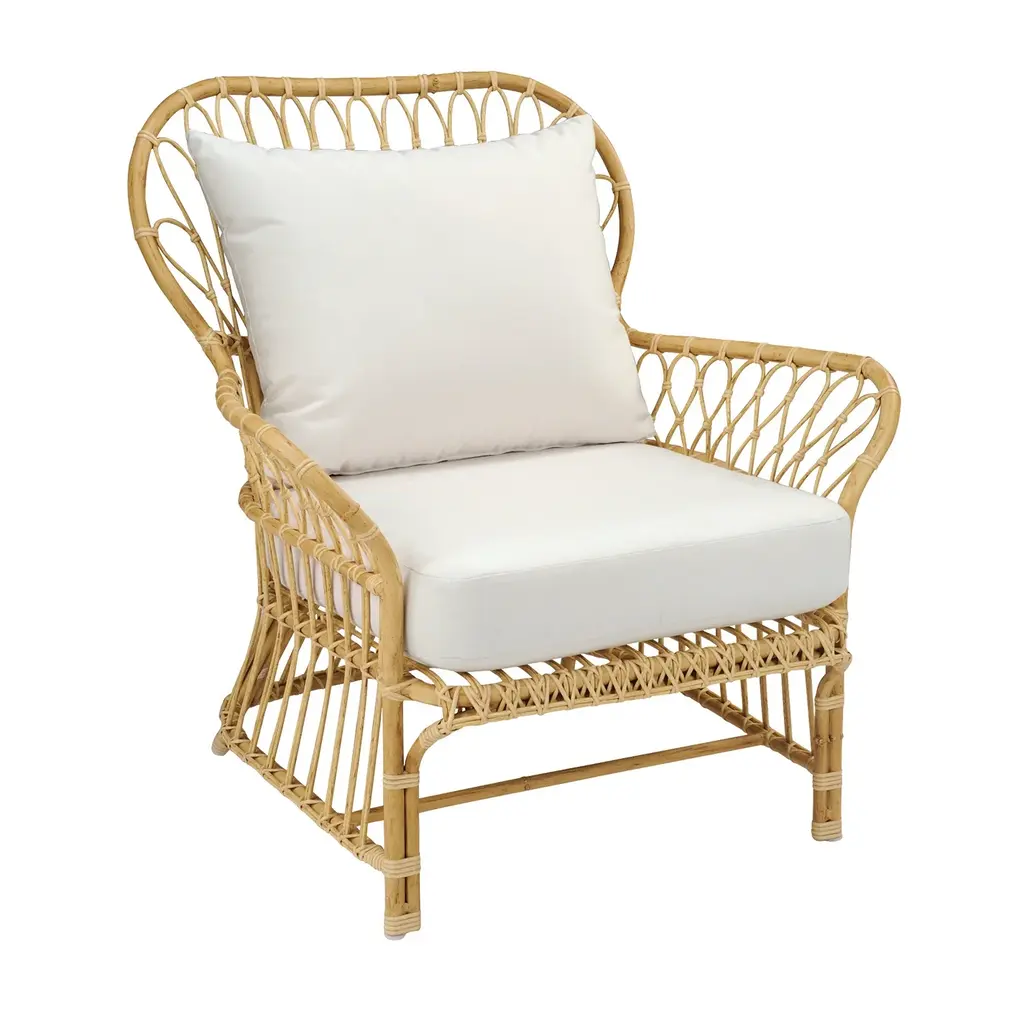 So welcoming ... This natural rattan club chair, with a plush cream colored seat and back cushion, will update a space with a sophisticated relaxed vibe. What a fantastic choice in a contemporary setting.