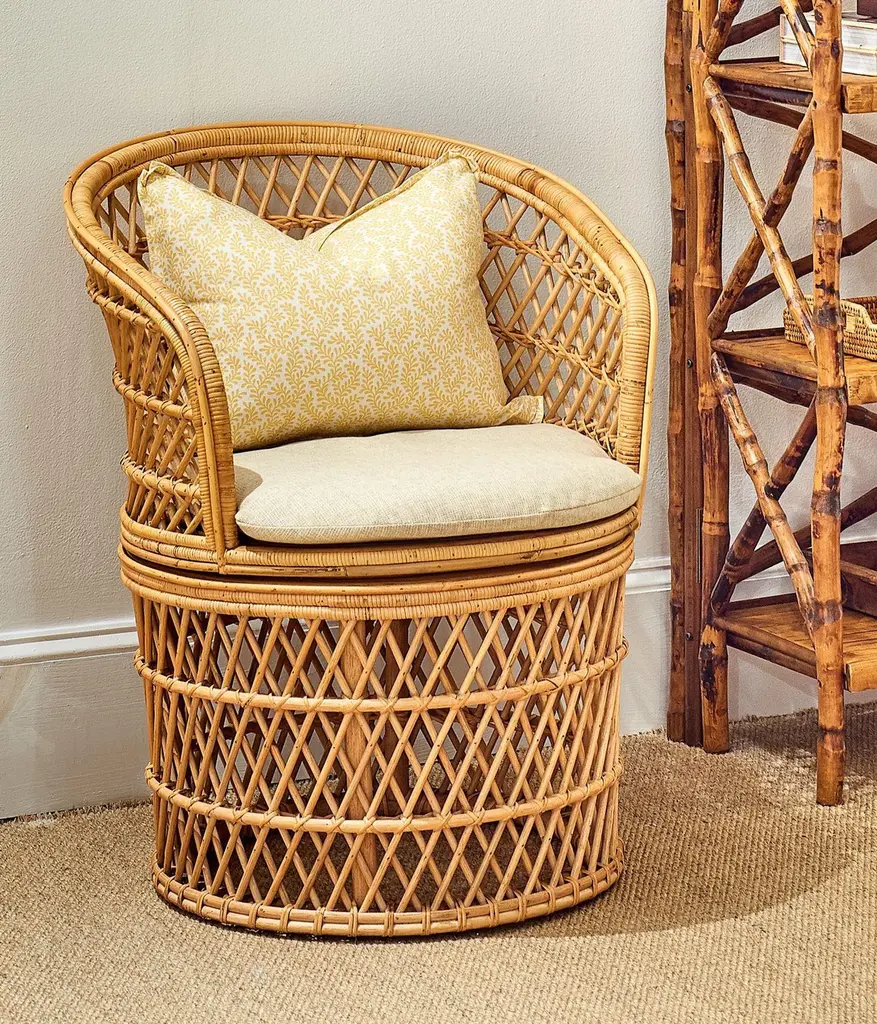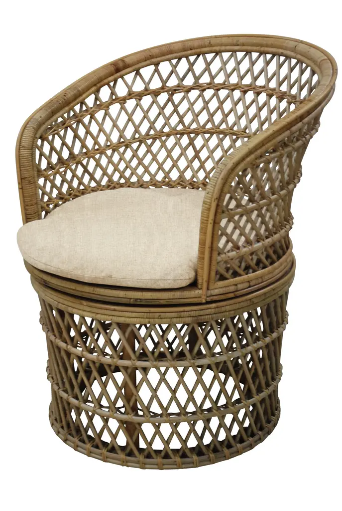 Our pieces are handmade with care, however, we cannot take custom requests. Barrel Swivel Chair. Woven Rattan. Color - Natural; Cushion Color - Cream. Chair weight limit 225.