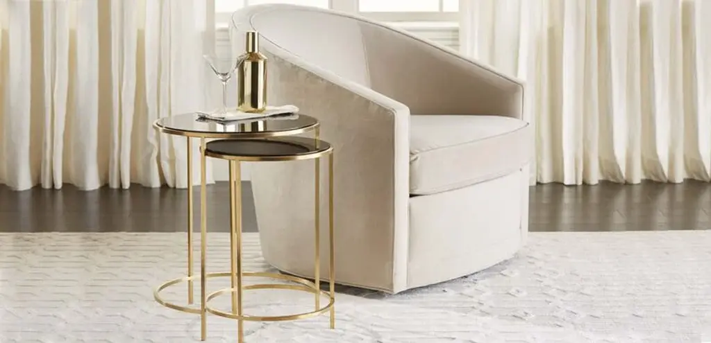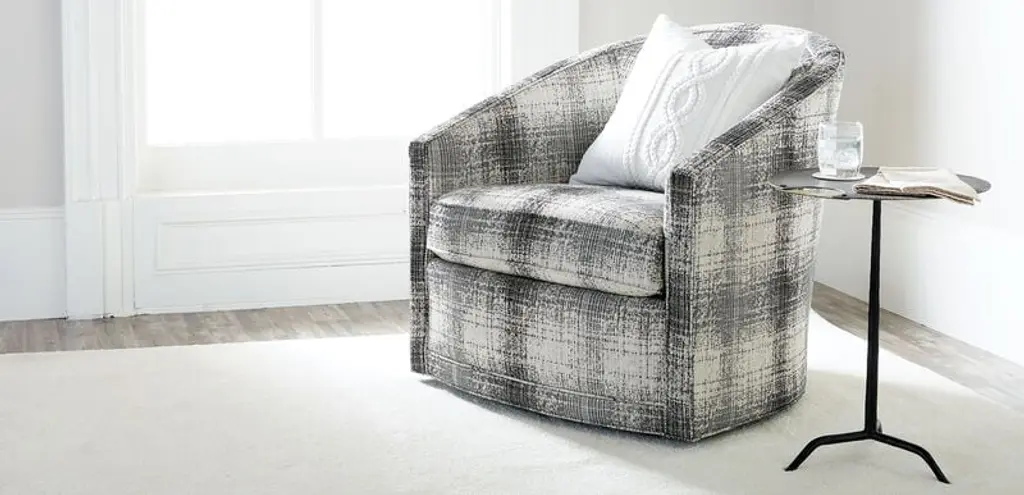 Take Baylee for a spin! With its clean-lined curves and swivel base, this barrel-back swivel chair is the perfect go-to piece for any room. We love its distinctive art deco notes; you’ll love this barrel-style swivel chair's sheltering silhouette. Baylee’s beauty truly is in the details: Welted on both sides, its arms wrap up and around its tight barrel-back; custom options include contrast welting and nailhead trim. Simple yet elegant, stylish and inviting, Baylee is your own movable comfort zone. Get this barrel swivel chair upholstered in your favorite fabric; also available in luxurious leather and in Quick Ship.