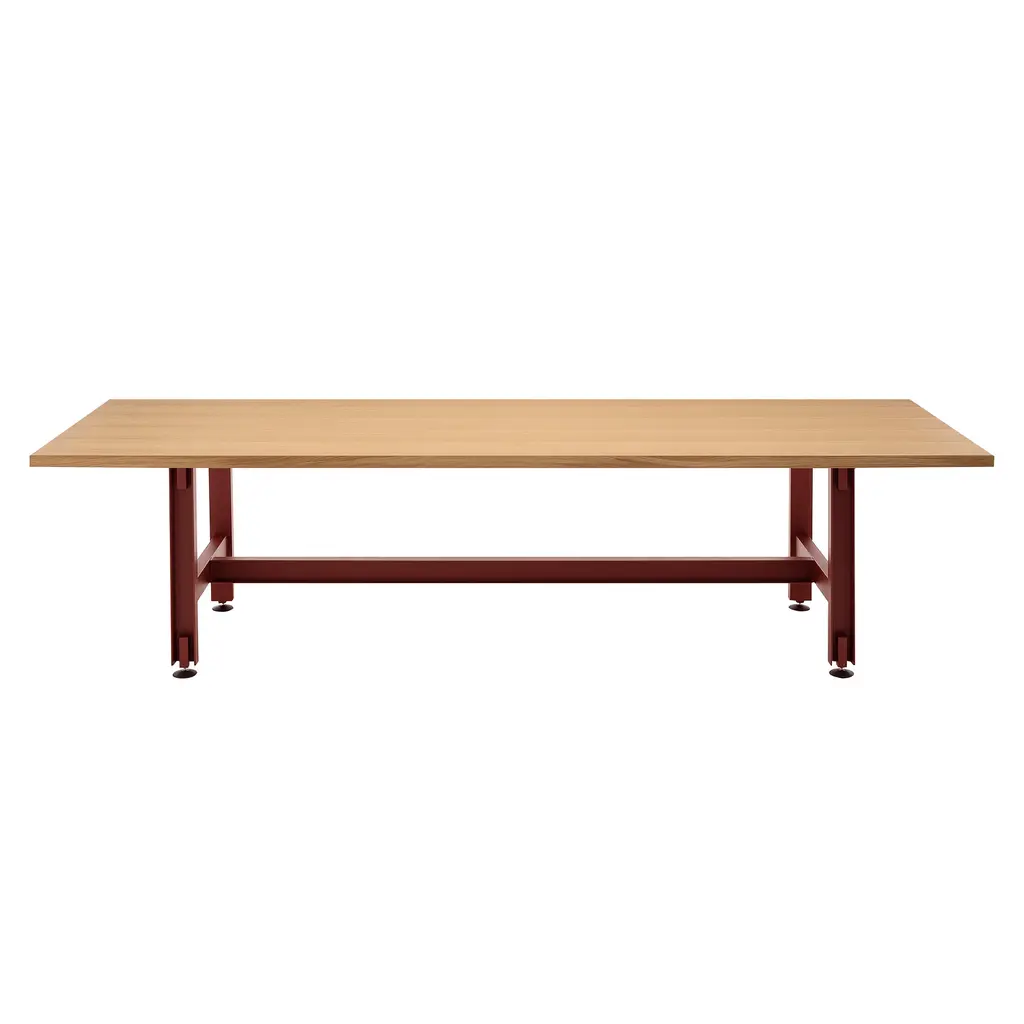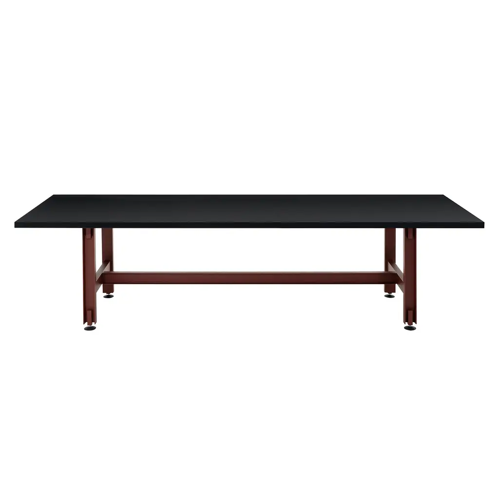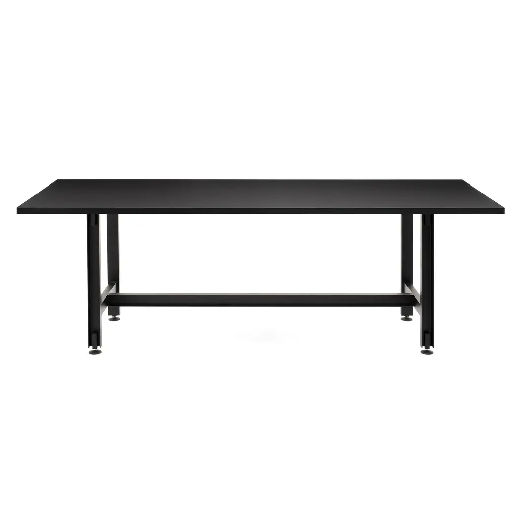 “The working environment is no longer about meeting rooms, task chairs and desk systems,” says Established & Sons director Sebastian Wrong. In turn, designer Konstantin Grcic conceives his multitasking Beam Table, equally at home in an artisan workshop, a gallery, or a live-work space. Based on a durable construction icon, rolled steel I beams form the structure, coated in a fine-textured powder coat in either black or red oxide and sitting on adjustable round feet that help protect the floor beneath. (Optional lockable swivel castors are available.) The expansive solid-lipped tabletops are offered in matte oak veneer, high-pressure laminate in black and in black Fenix, a heat- and scratch-resistant, premium surface material.