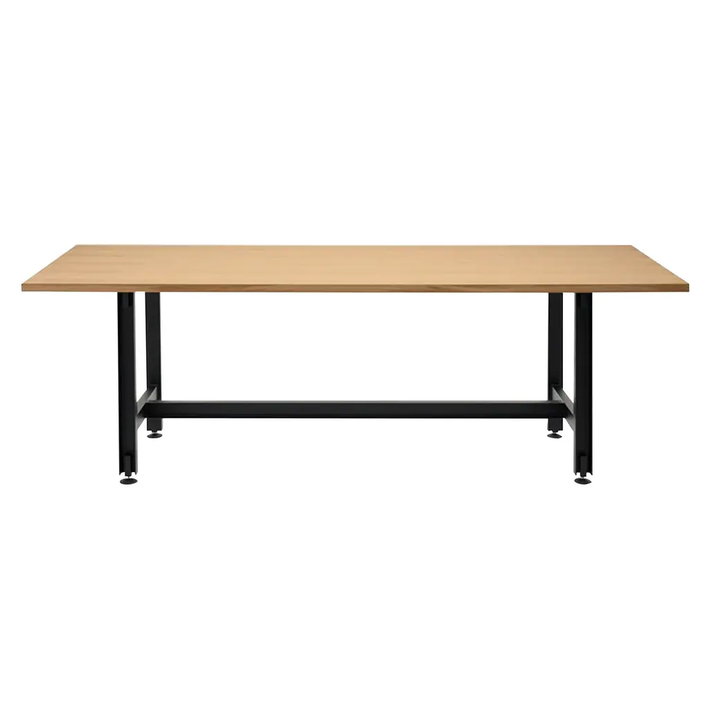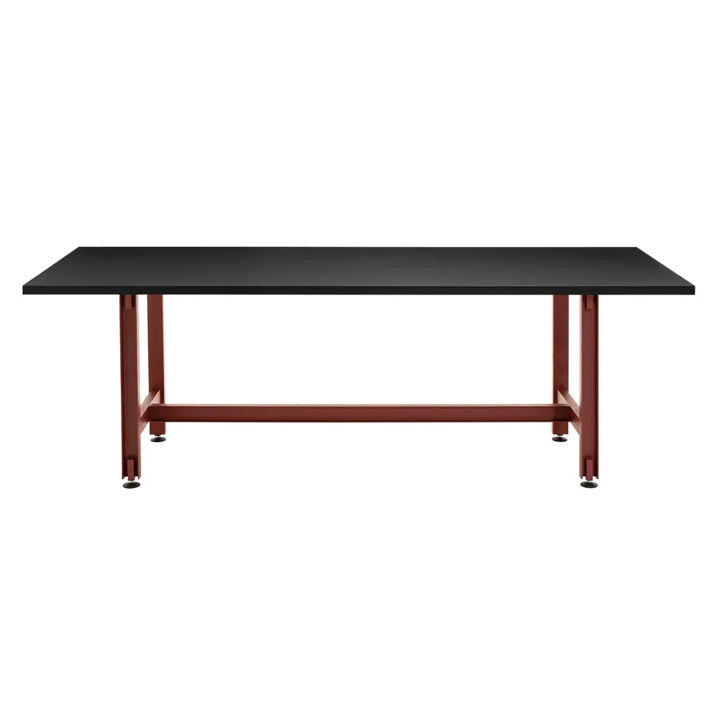 “The working environment is no longer about meeting rooms, task chairs and desk systems,” says Established & Sons director Sebastian Wrong. In turn, designer Konstantin Grcic conceives his multitasking Beam Table, equally at home in an artisan workshop, a gallery, or a live-work space. Based on a durable construction icon, rolled steel I beams form the structure, coated in a fine-textured powder coat in either black or red oxide and sitting on adjustable round feet that help protect the floor beneath. (Optional lockable swivel castors are available.) The expansive solid-lipped tabletops are offered in matte oak veneer, high-pressure laminate in black and in black Fenix, a heat- and scratch-resistant, premium surface material.