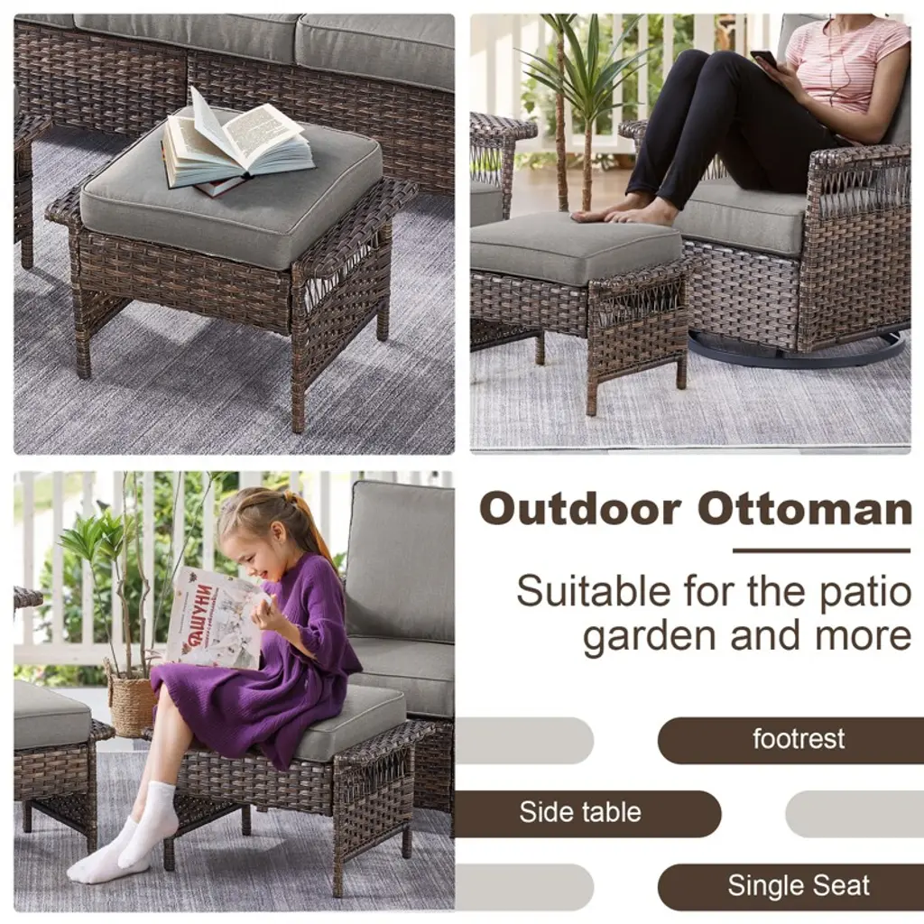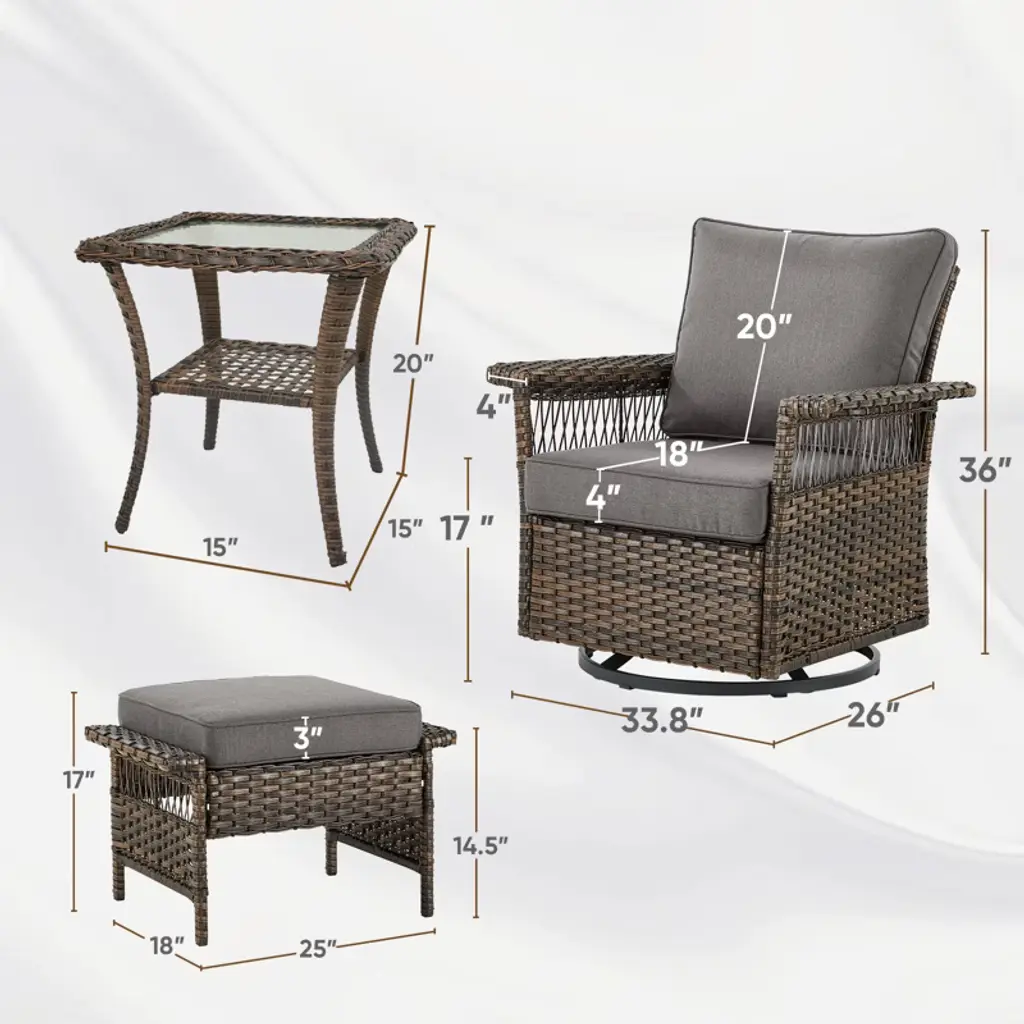 Crafted for unparalleled outdoor relaxation, our swivel rocking chair set seamlessly blends durability with sophisticated comfort. The resilient PE wicker construction and powder-coated steel frame ensure lasting performance in any weather, while the innovative hollow design beneath armrests and along the waistline delivers exceptional airflow for cool summer lounging. Its distinctive inverted trapezoidal backrest combines elegant aesthetics with ergonomic support, complemented by generously proportioned 5.11-inch armrests that exceed standard dimensions for superior comfort. The high-performance olefin fabric cushion covers offer premium breathability, UV protection, and water resistance, specifically engineered for outdoor use. Experience the perfect harmony of form and function with our Seagull wicker chair ¨C your ultimate solution for stylish, comfortable outdoor living.