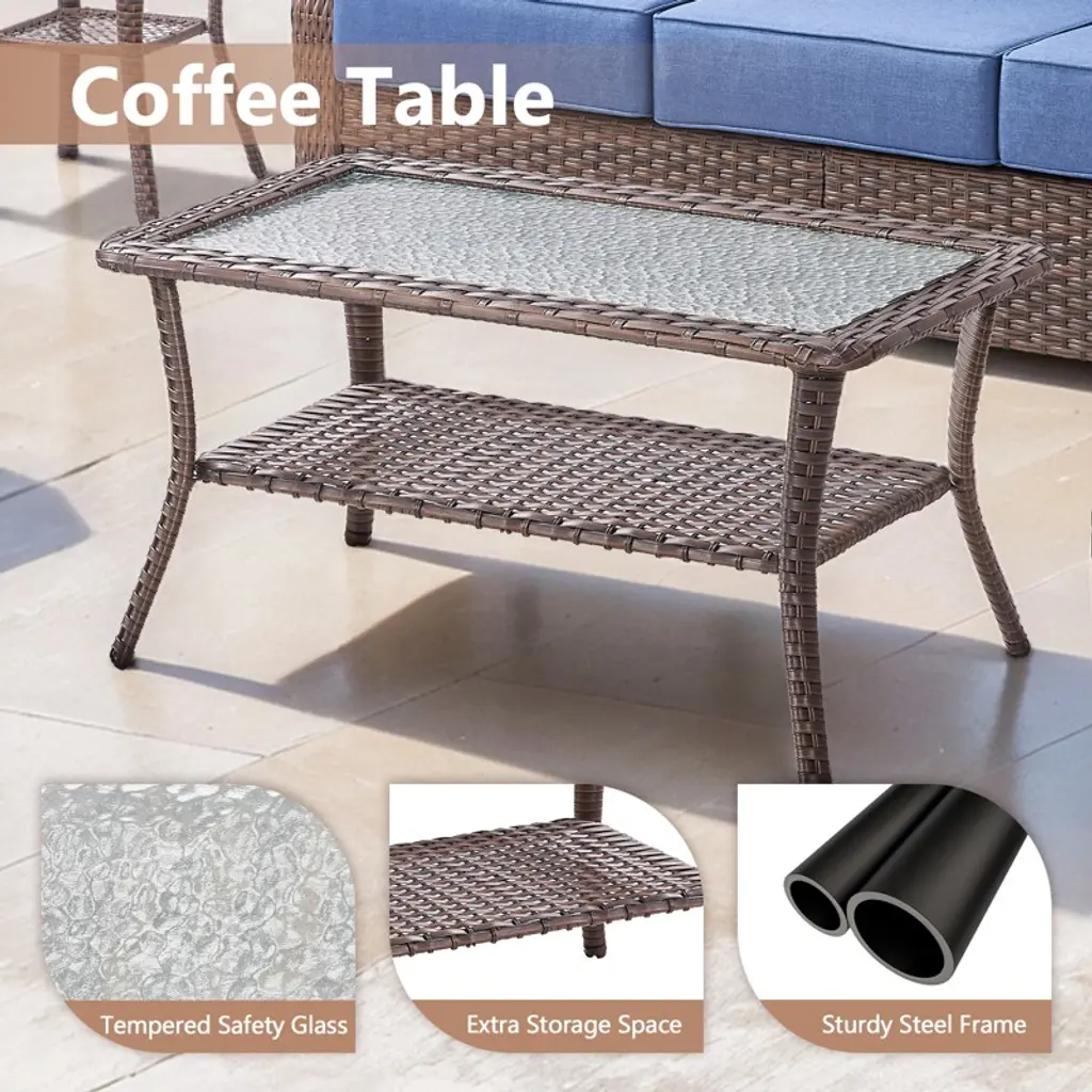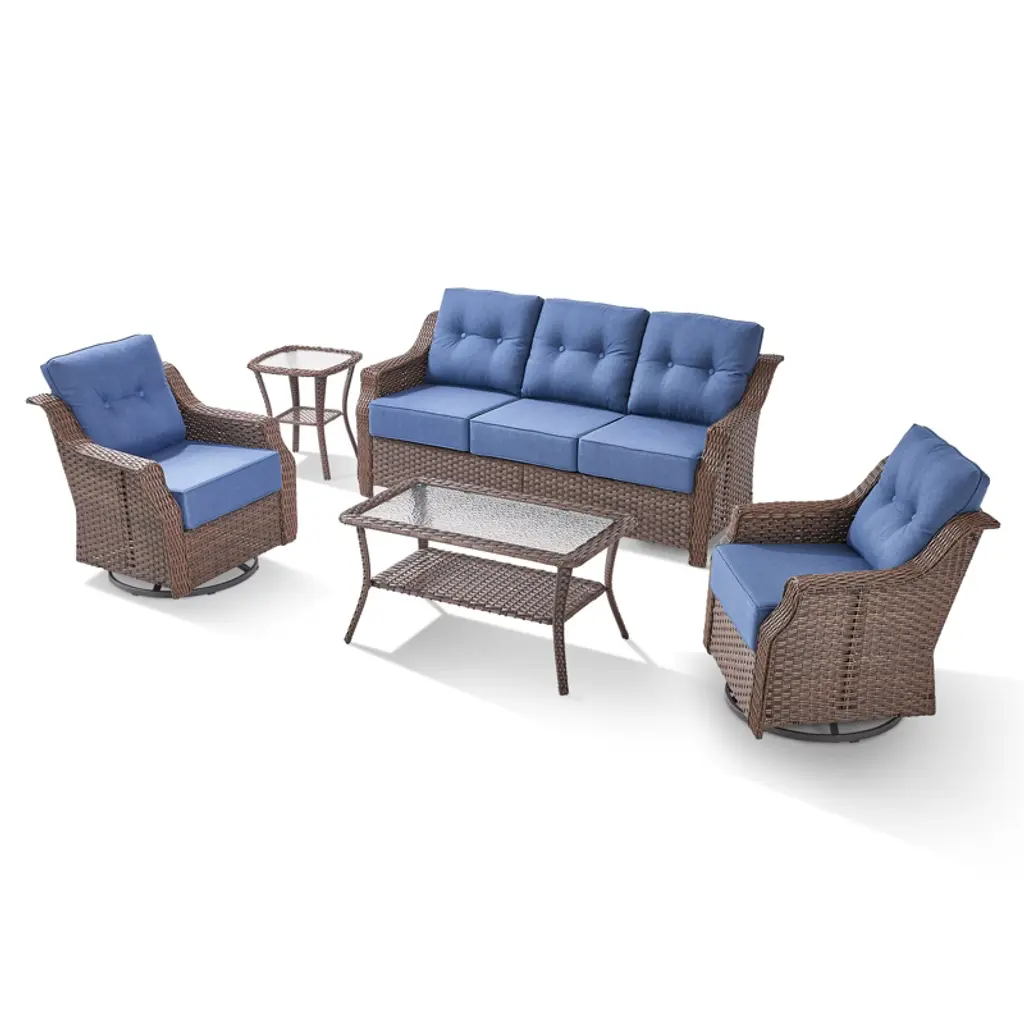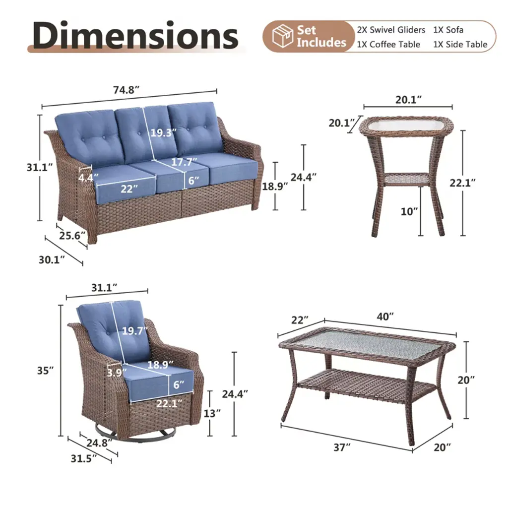 Upgrade your outdoor space with the Belord 5-Piece Wicker Lounge Set. This stylish collection includes a spacious sofa and two swivel chairs with ultra-comfortable 6" thick cushions, plus a matching 2-tier coffee table and end table - all built with durable powder-coated steel frames and weather-resistant resin wicker that withstands sun, rain and temperature changes. The versatile 40" rectangular coffee table features a lower shelf for extra storage. Perfect for entertaining or relaxing in your patio, backyard or poolside.