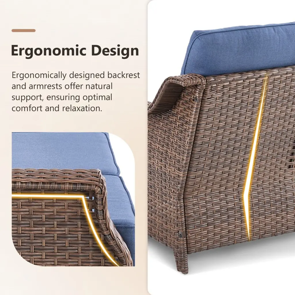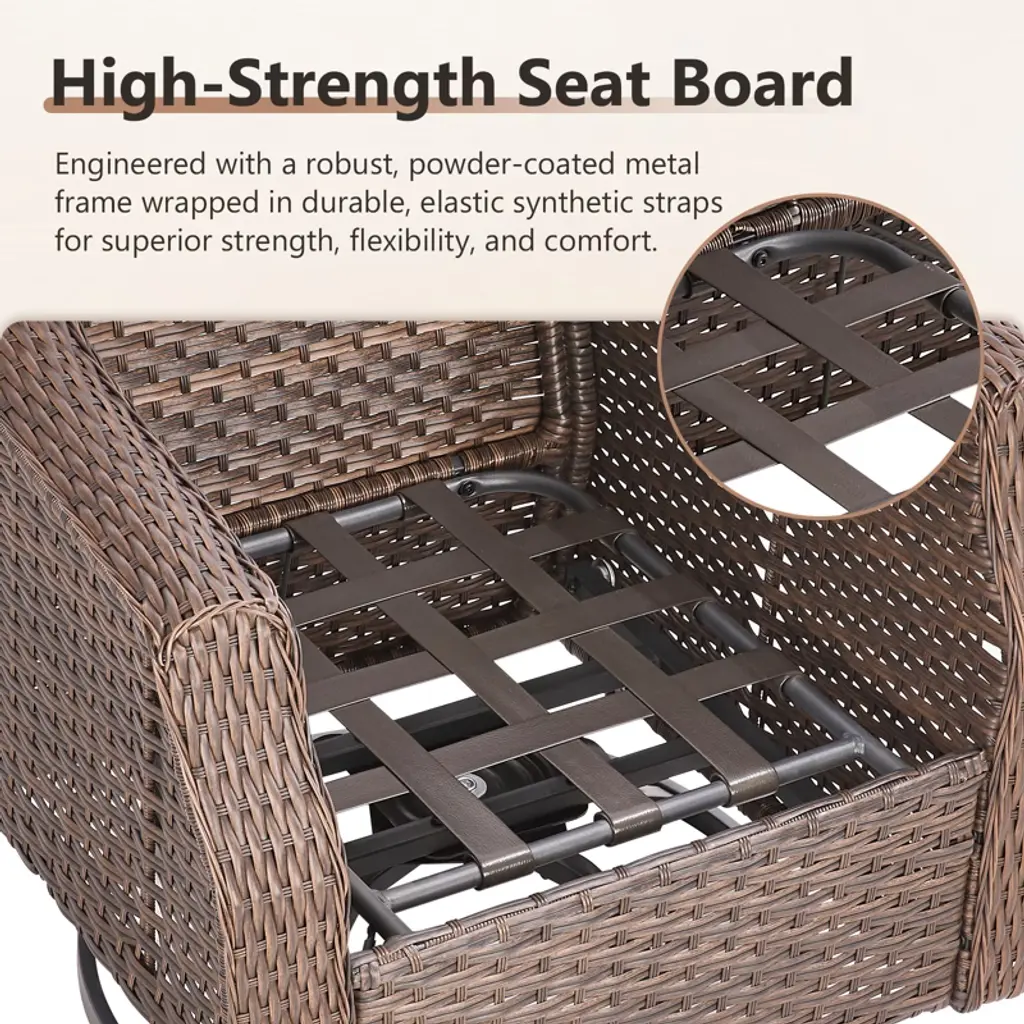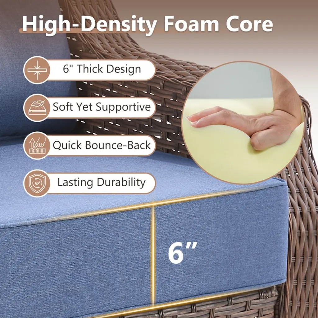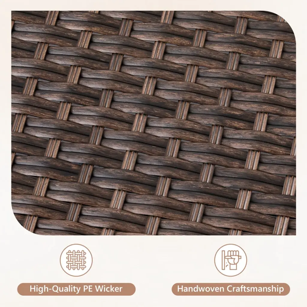 Upgrade your outdoor space with the Belord 5-Piece Wicker Lounge Set. This stylish collection includes a spacious sofa and two swivel chairs with ultra-comfortable 6" thick cushions, plus a matching 2-tier coffee table and end table - all built with durable powder-coated steel frames and weather-resistant resin wicker that withstands sun, rain and temperature changes. The versatile 40" rectangular coffee table features a lower shelf for extra storage. Perfect for entertaining or relaxing in your patio, backyard or poolside.