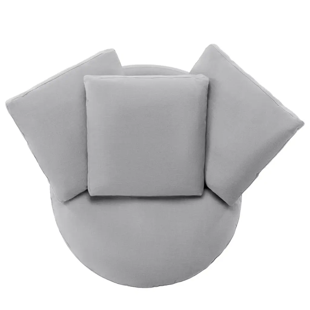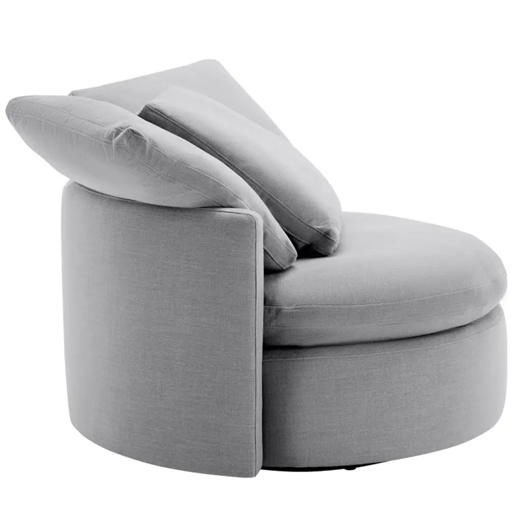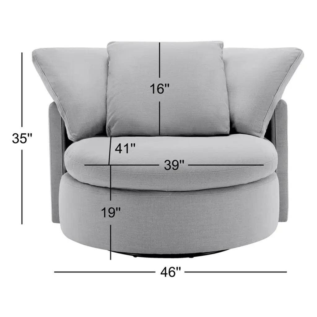 With enough space, this oversized round accent chair features lofty, plush seat cushions so you can lounge in both comfort and style. Understated 360-degree metal swivel base mechanism let you change your focal point without leaving your seat. Equal parts classy and three soft throw pillows, it's the ideal spot to curl up and relax.