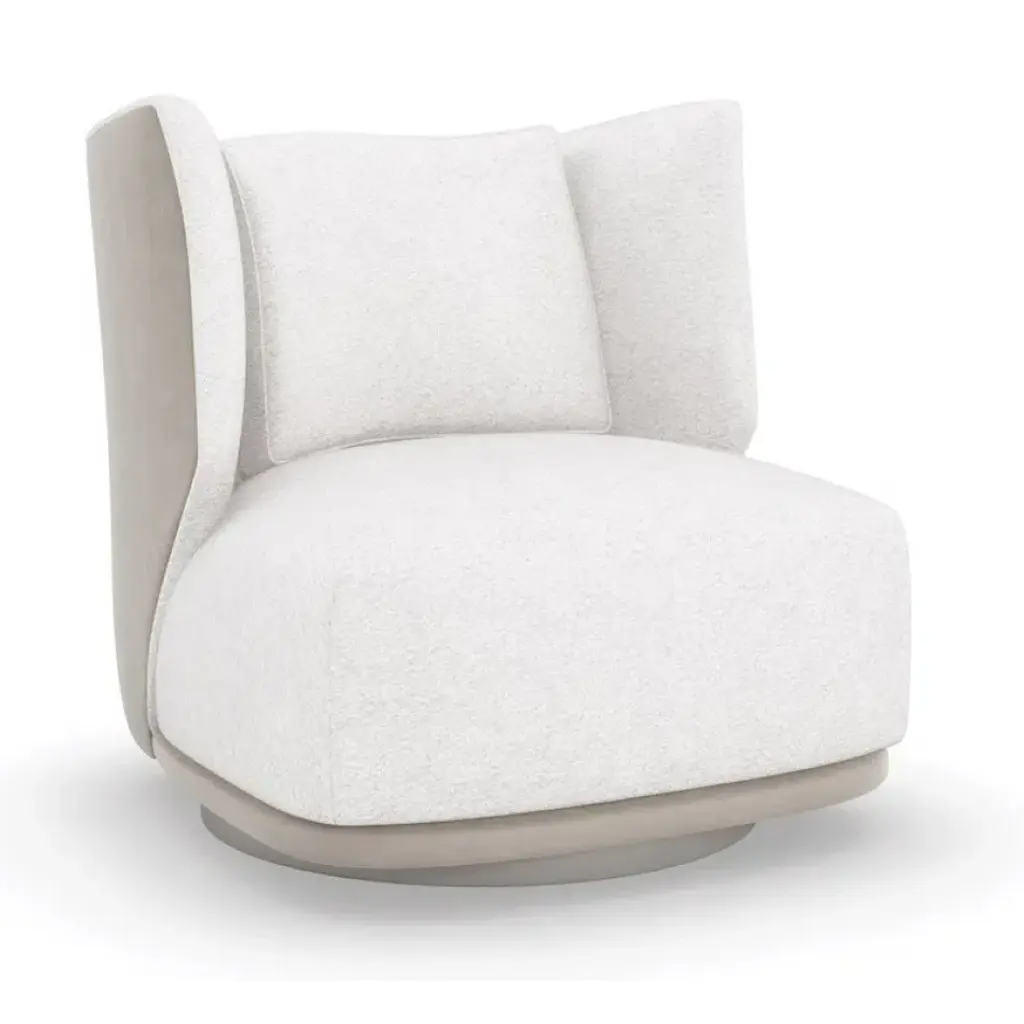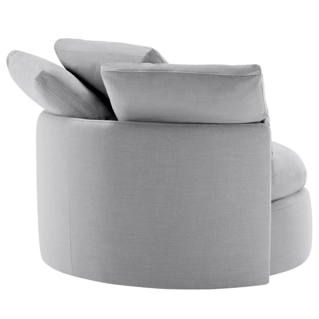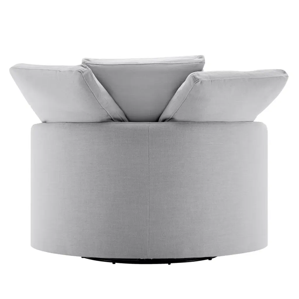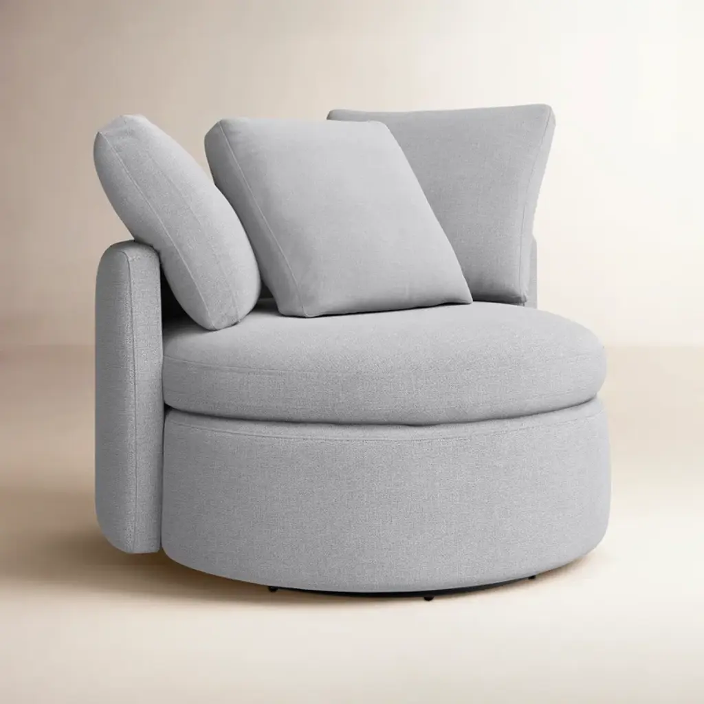 With enough space, this oversized round accent chair features lofty, plush seat cushions so you can lounge in both comfort and style. Understated 360-degree metal swivel base mechanism let you change your focal point without leaving your seat. Equal parts classy and three soft throw pillows, it's the ideal spot to curl up and relax.