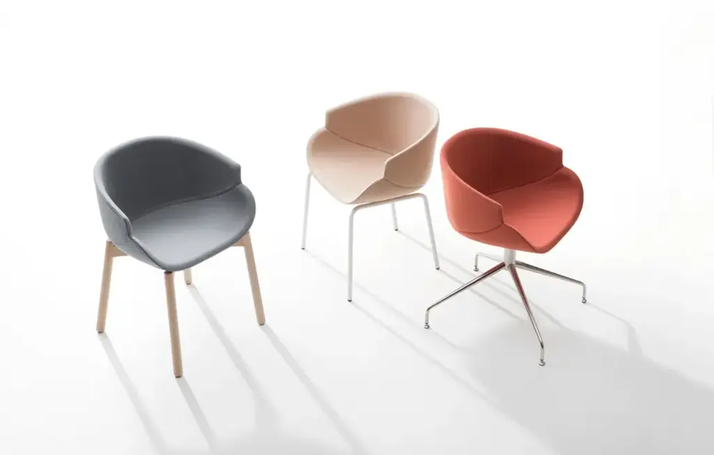 Small armchair with distinctive lines, characterised by a sharp and sinuous groove in the frame which forms two half shells: the seat, soft and inviting, fits against the accentuated and enveloping profile of an ample backrest. The result is a neat and comfortable seat with armrests, perfect for both contract and home environment use. Fully upholstered in fabric or hide, it is available with legs in natural beech, in metal, or the swivelling version with a chrome plated metal spoke base.