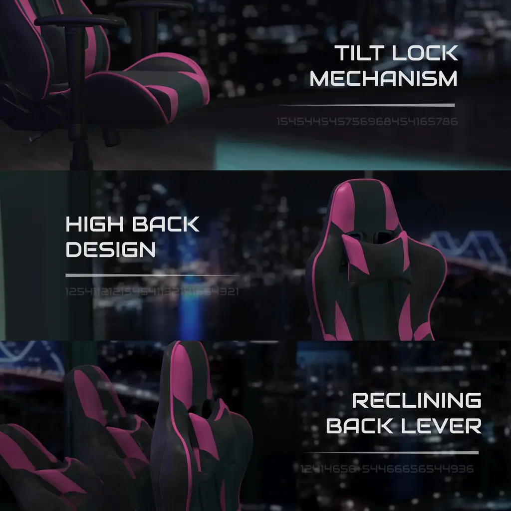 Loading Progress… Welcome to the new era of gaming, brought to you by the Horizon 9ine gaming chair. Juiced up with all the features, including adjustable/removable headrest and lumbar support pillows. The comfort continues with the high-back design dressed out in modern faux leather upholstery. 87° - 145° recline gives you welcomed respite during extended gaming sessions. Pneumatic seat height adjustment, 360° swivel rotation, tilt/tension adjustment knob and sporty dual wheel casters complete the inventory list.