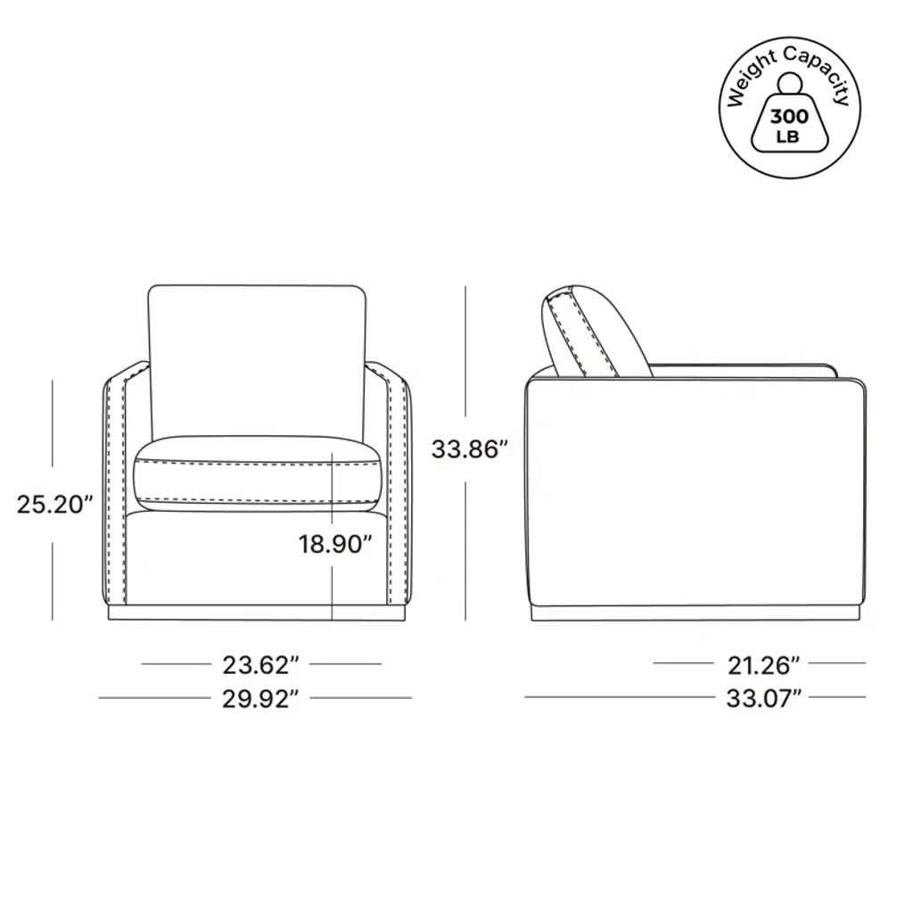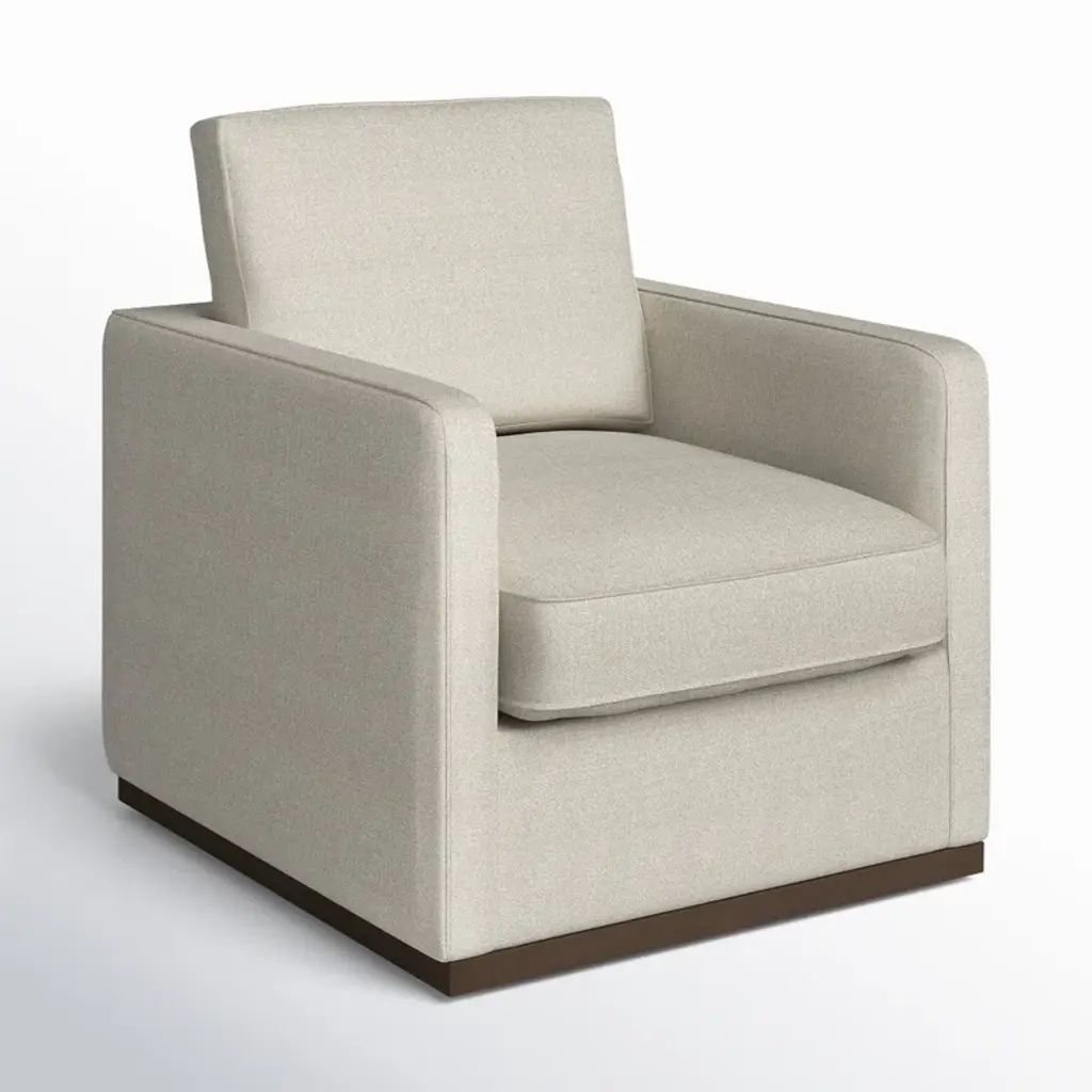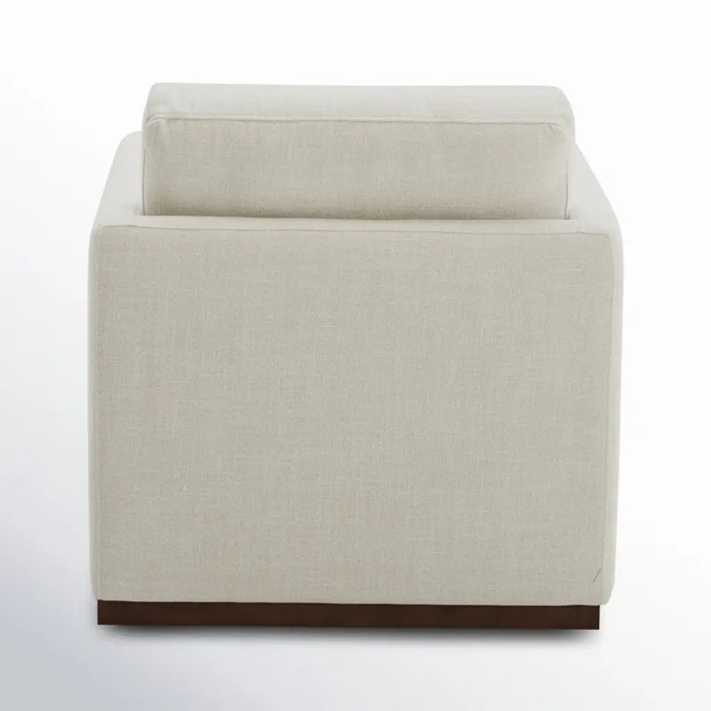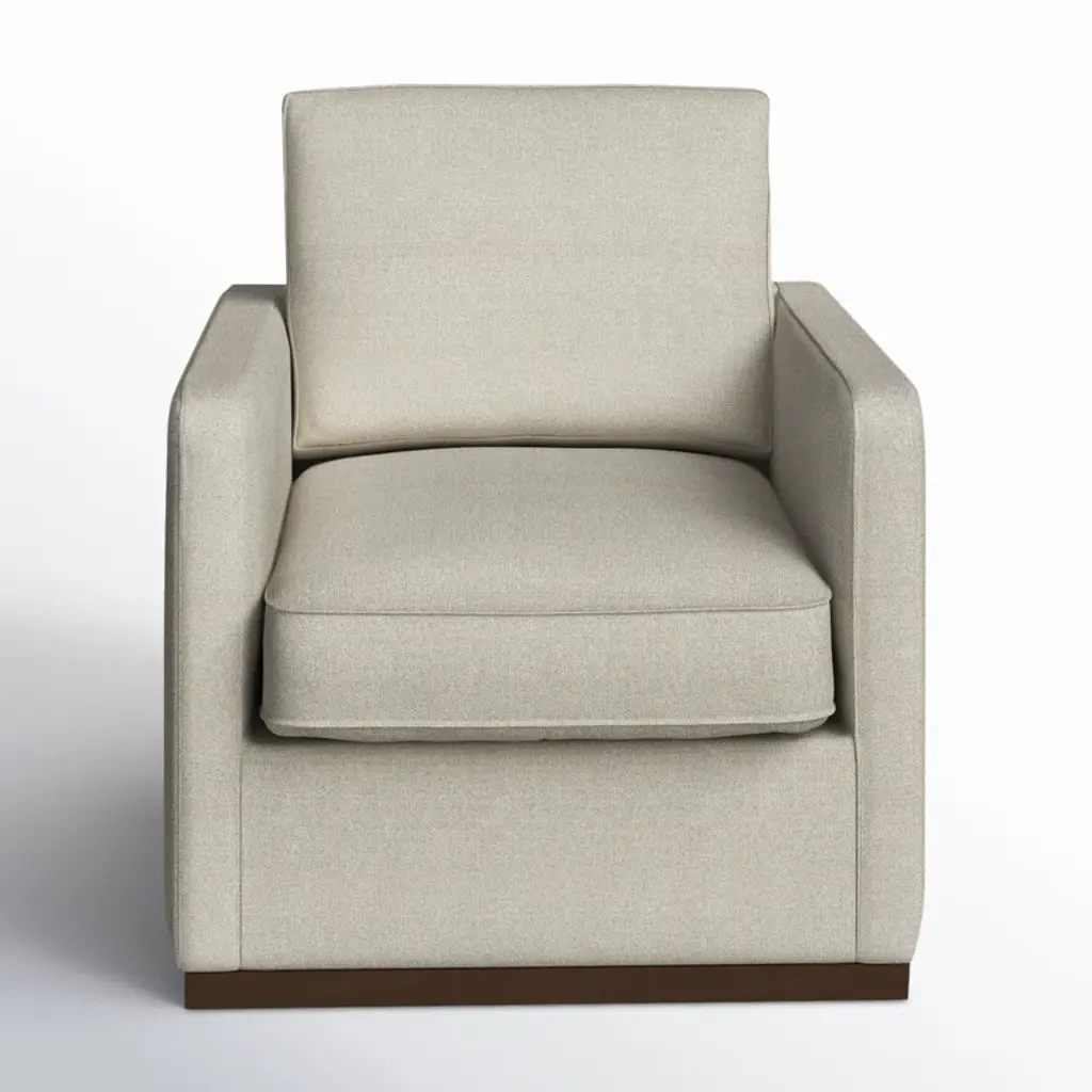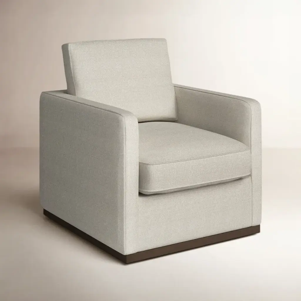 Crafted for comfort and style, this swivel armchair features a solid wood frame, warm walnut base, and smooth 360° rotation. High-density foam and sinuous springs provide a supportive, balanced seat. The neutral fabric pairs effortlessly with any decor, while piped edges and track arms offer a clean, modern finish perfect for living rooms, reading nooks, or office spaces.