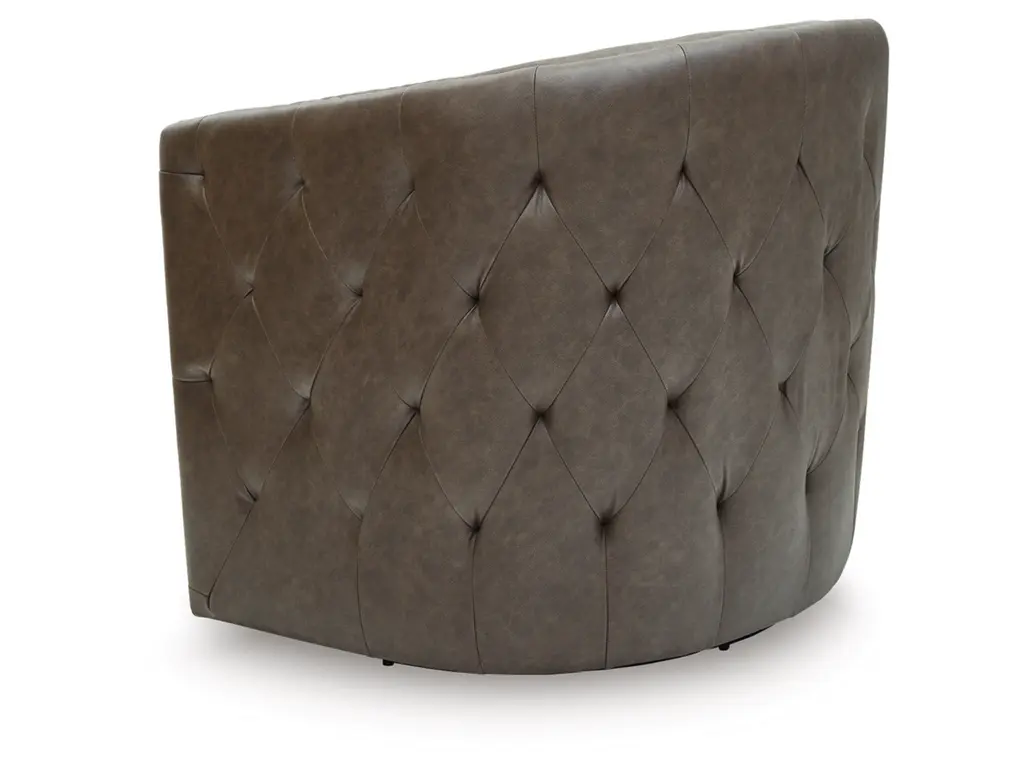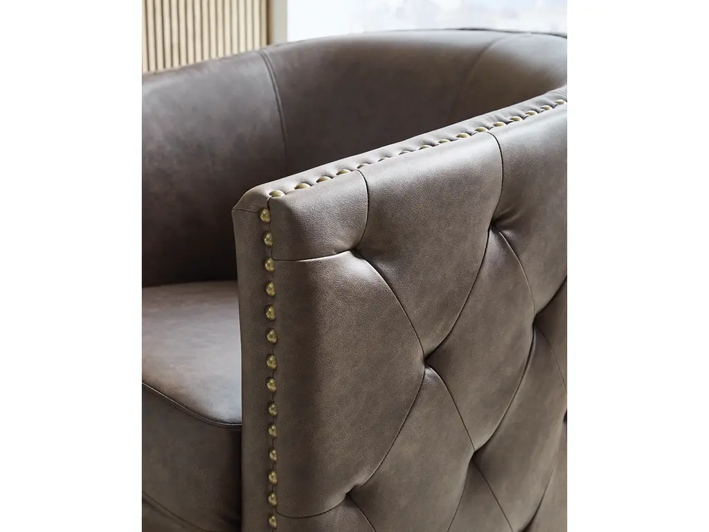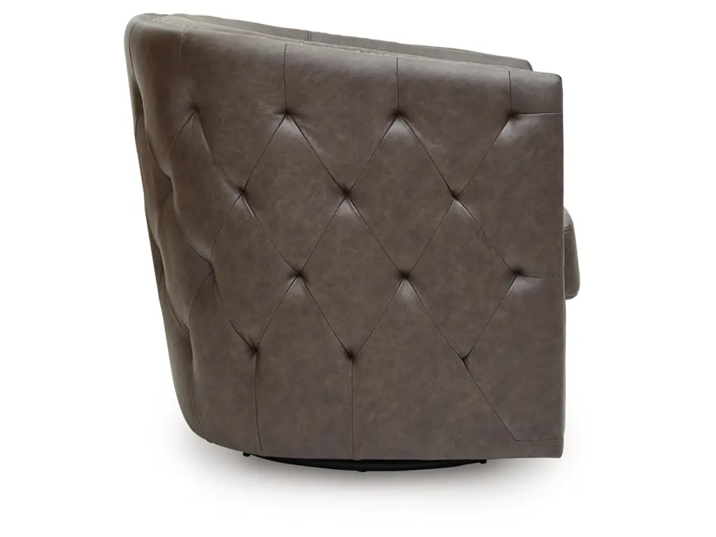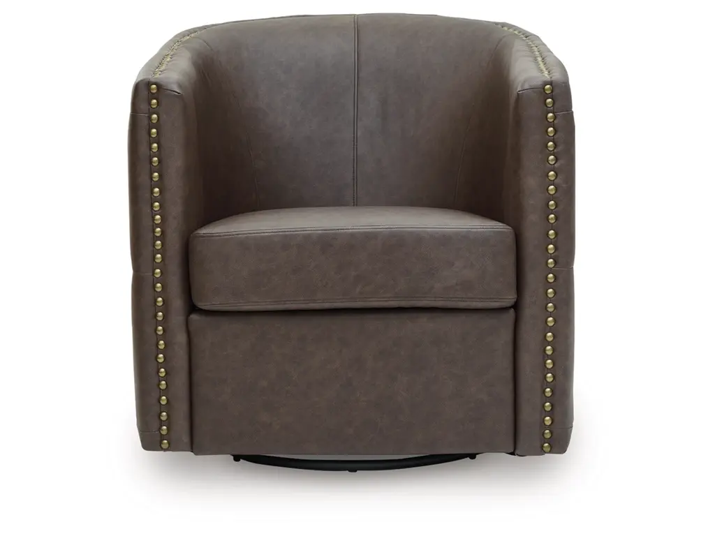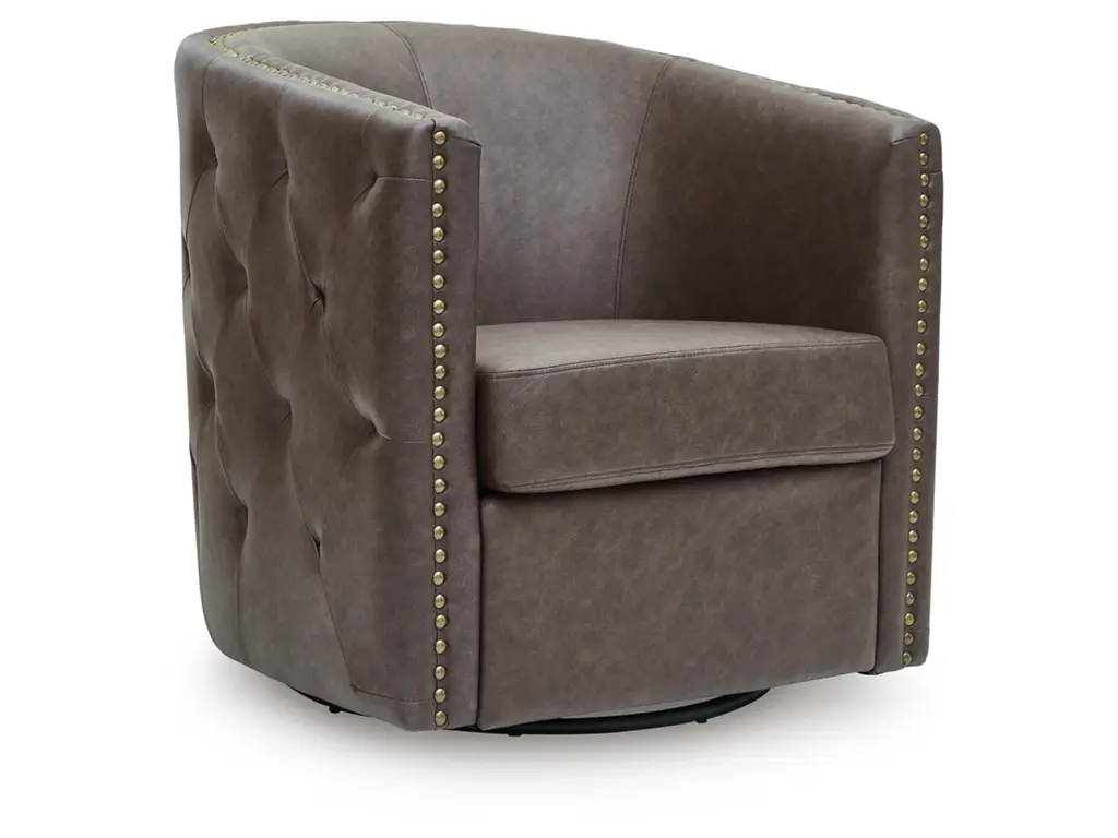 Complete your cozy reading nook or chic seating area with the Brentlow swivel accent chair. Handsome with its dark faux leather upholstery, this seating is perched on a 360-degree swivel base for the perfect blend of style and function. Design details like tufted sides and antiqued brass nailheads complete the look with added flair.