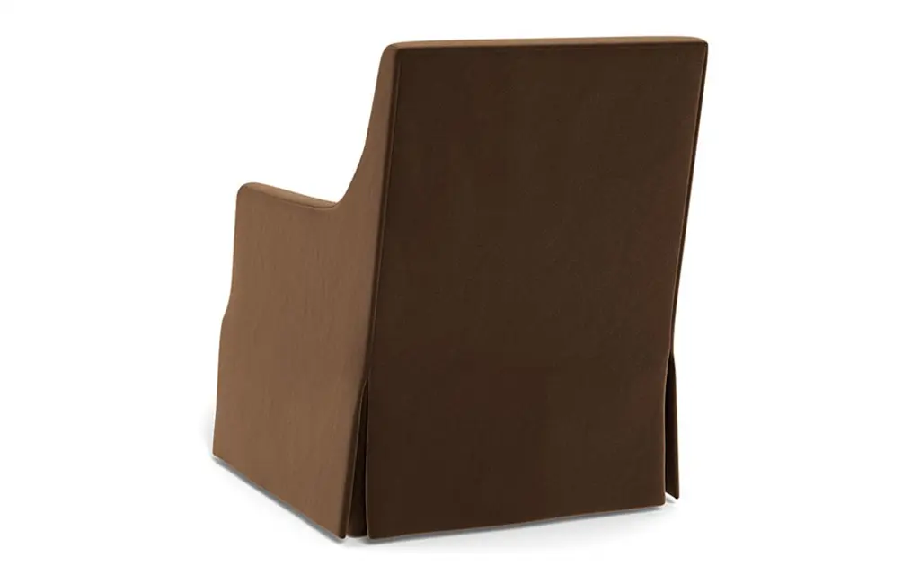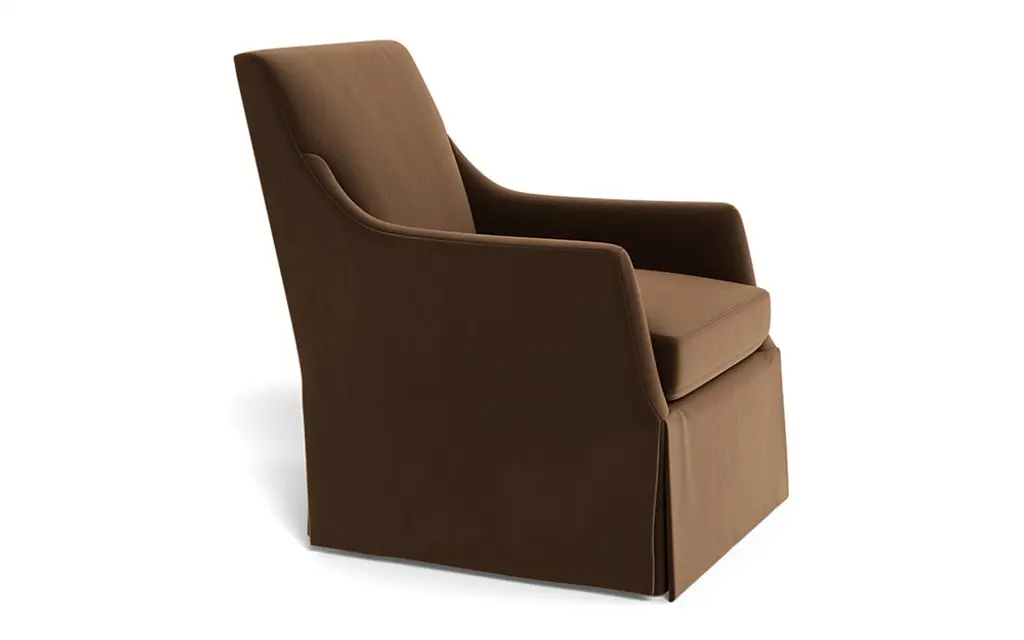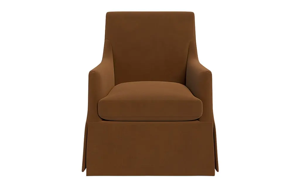 With dreamy touches like gently sloped arms and a skirted base, our Brigitte swivel chair exudes casual elegance. The comfortable seat provides a firmer sit that remains both supportive and inviting. This chair pairs a timeless design with a convenient swivel base—it’s the perfect addition to any cozy living space.