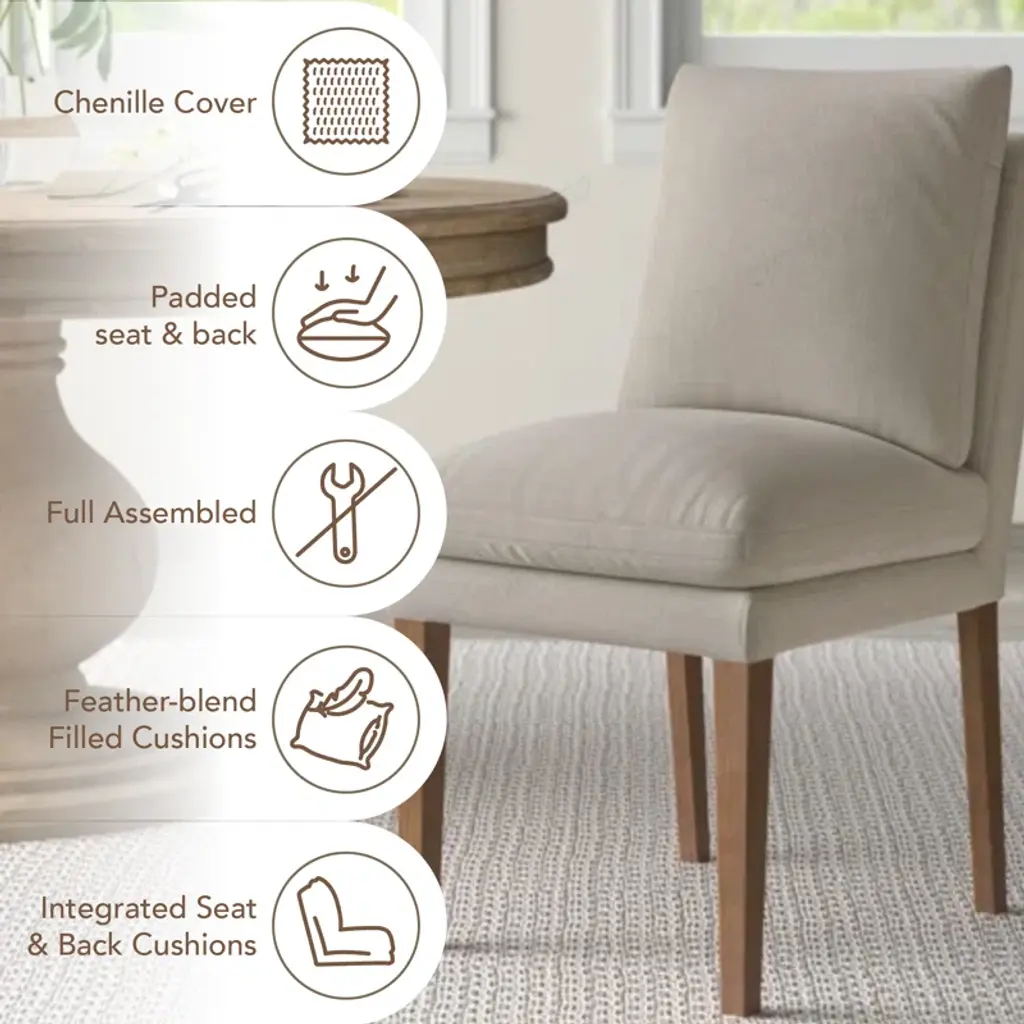 Elevate your dining experience with this elegant side chair, crafted from a blend of solid pine wood and engineered wood for a timeless look. The chenille upholstery adds a touch of sophistication while the foam and synthetic fiber filling ensures you'll dine in comfort. The chair's upholstered back and non-swivel design make it a versatile addition to any residential setting. With its tear-resistant construction and mortise and tenon joinery, this side chair is built to last, making it a perfect companion for memorable meals and conversations.