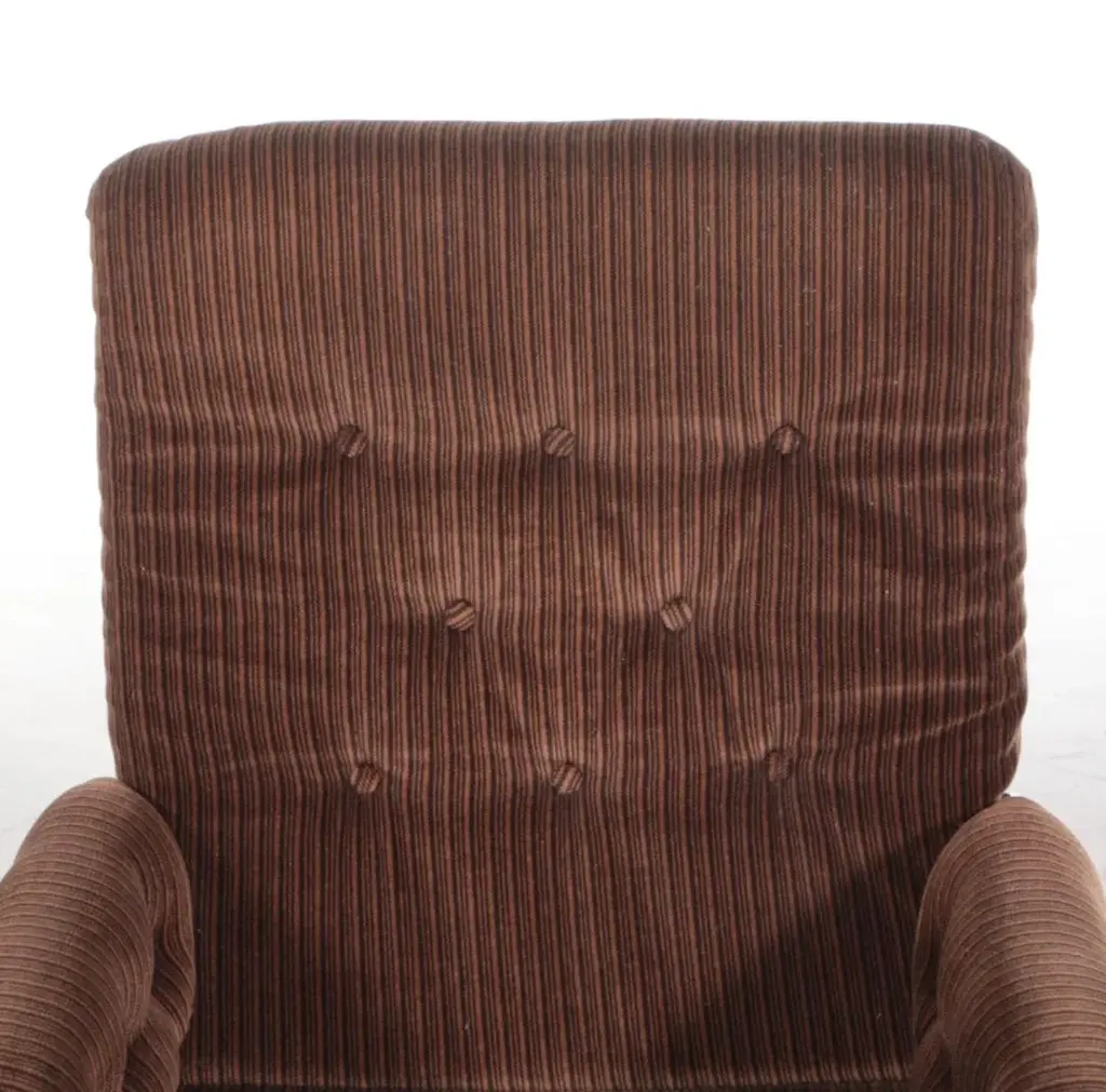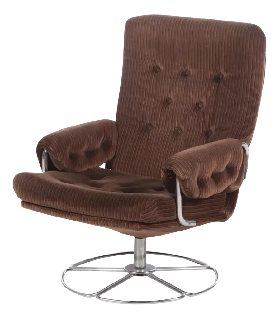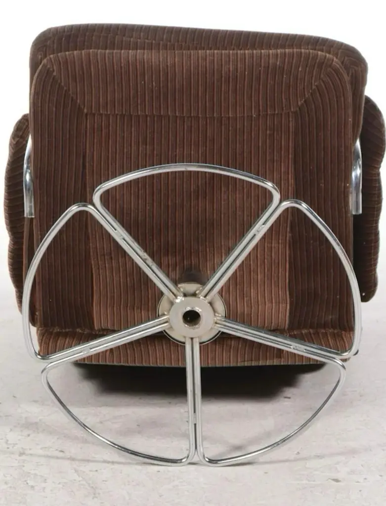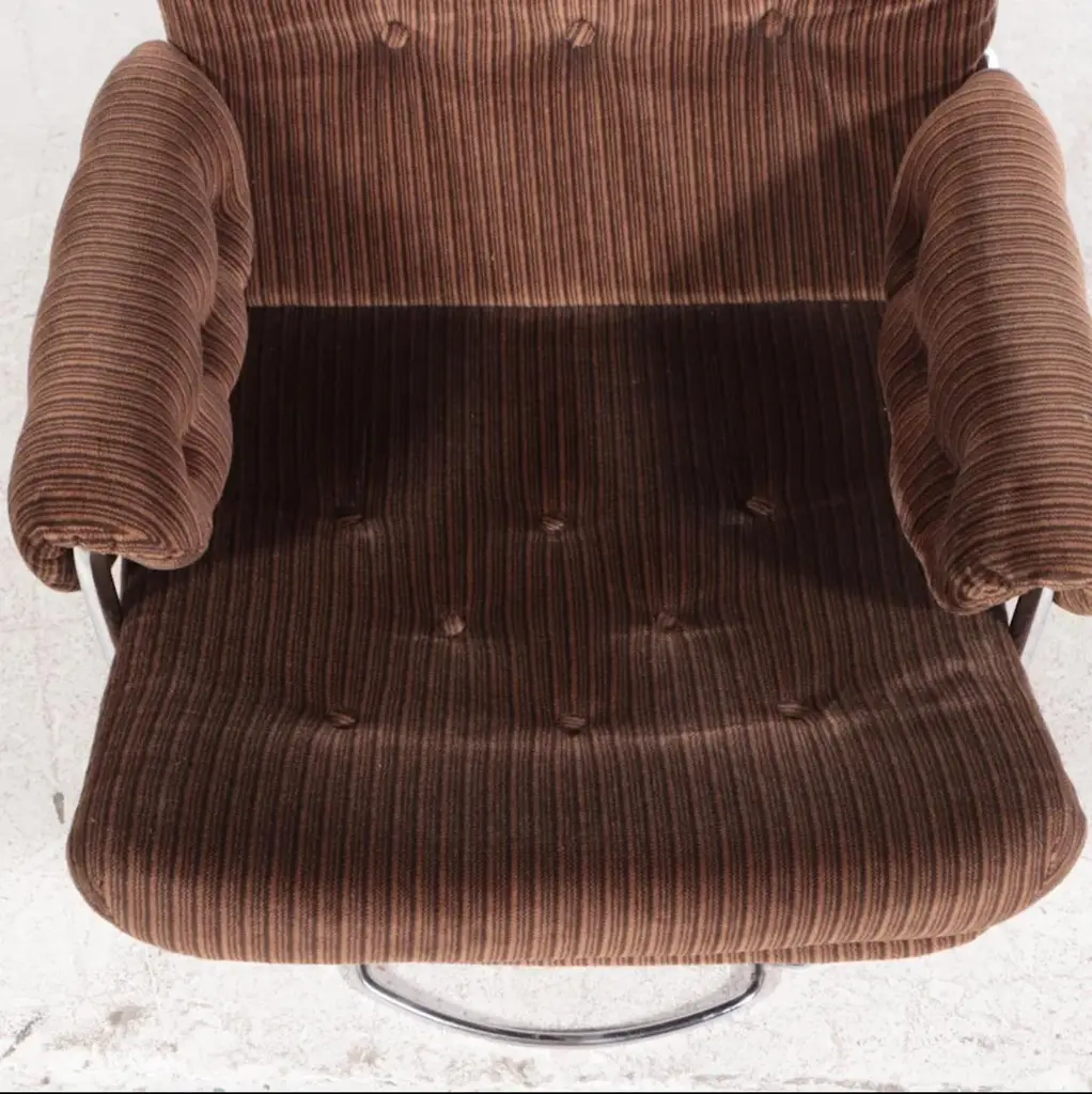 This swivelling easy chair is a cross between the famous “Jetson” lounge chair and the “Karin” lounge chair by iconic Swedish designer, Bruno Mathsson for Dux of Sweden. All three chairs feature chromed steel circular swivel pedestal based platforms. This edition has a chromed steel “pipe” base, segmented in a flower-like petal configuration that comes together in the center at the chromed steel swivel pedestal. The frame of the chair is also done in the chromed “pipe” and covered in a velvet like upholstery. At first glance, the upholstery looks to be a corduroy fabric. But when viewed more closely it is actually striped velvet. All components are in great condition with the chromed petal form base showing some slight peel and surface scratches. 1 of 2 chairs available.