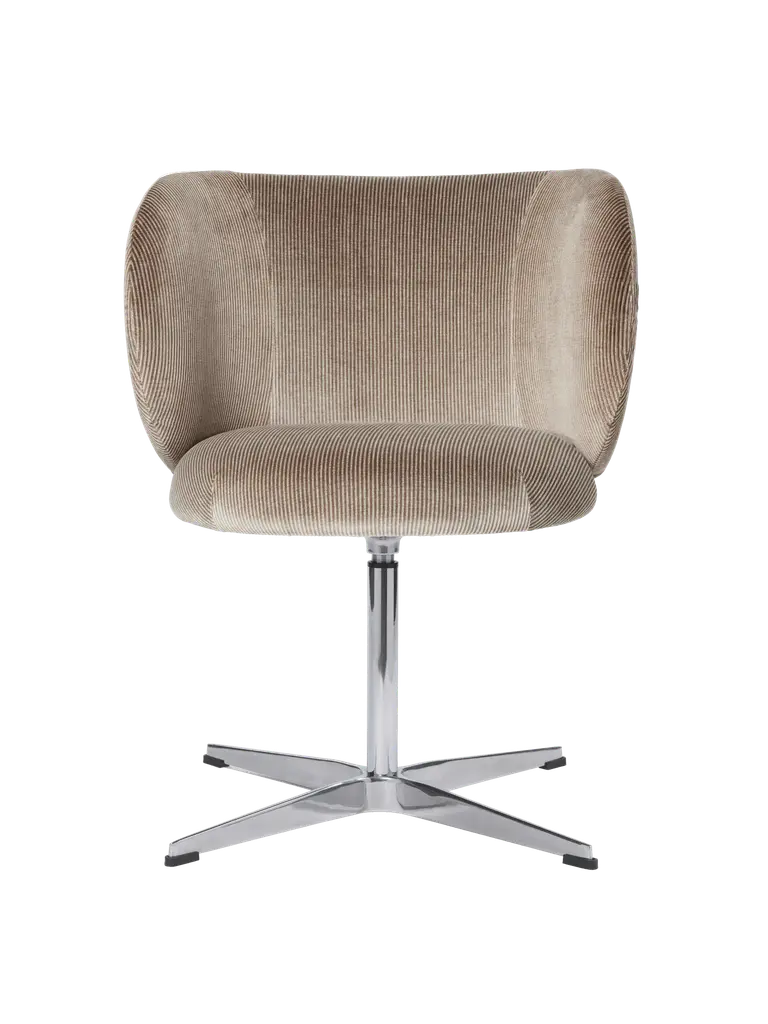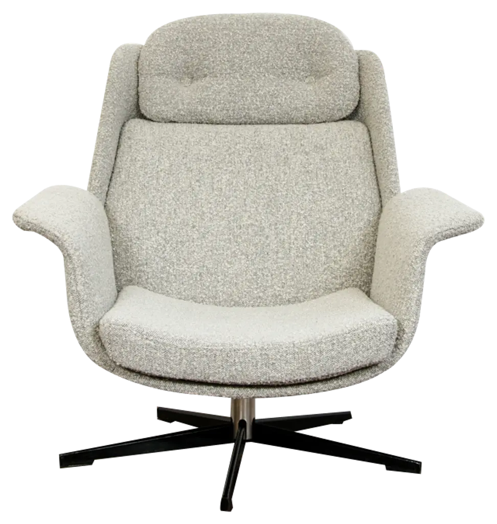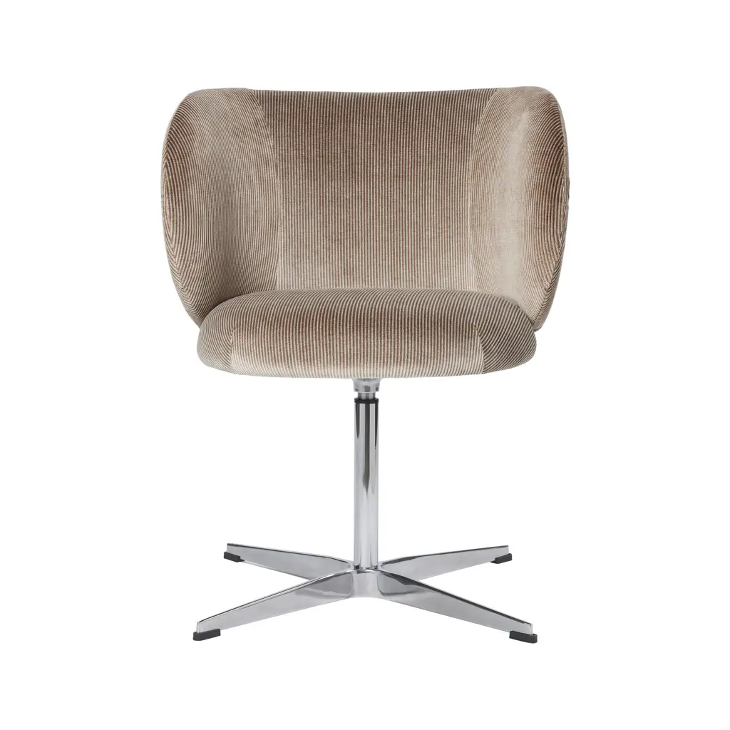 This swivelling easy chair is a cross between the famous “Jetson” lounge chair and the “Karin” lounge chair by iconic Swedish designer, Bruno Mathsson for Dux of Sweden. All three chairs feature chromed steel circular swivel pedestal based platforms. This edition has a chromed steel “pipe” base, segmented in a flower-like petal configuration that comes together in the center at the chromed steel swivel pedestal. The frame of the chair is also done in the chromed “pipe” and covered in a velvet like upholstery. At first glance, the upholstery looks to be a corduroy fabric. But when viewed more closely it is actually striped velvet. All components are in great condition with the chromed petal form base showing some slight peel and surface scratches. 1 of 2 chairs available.