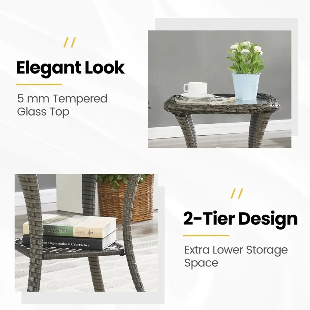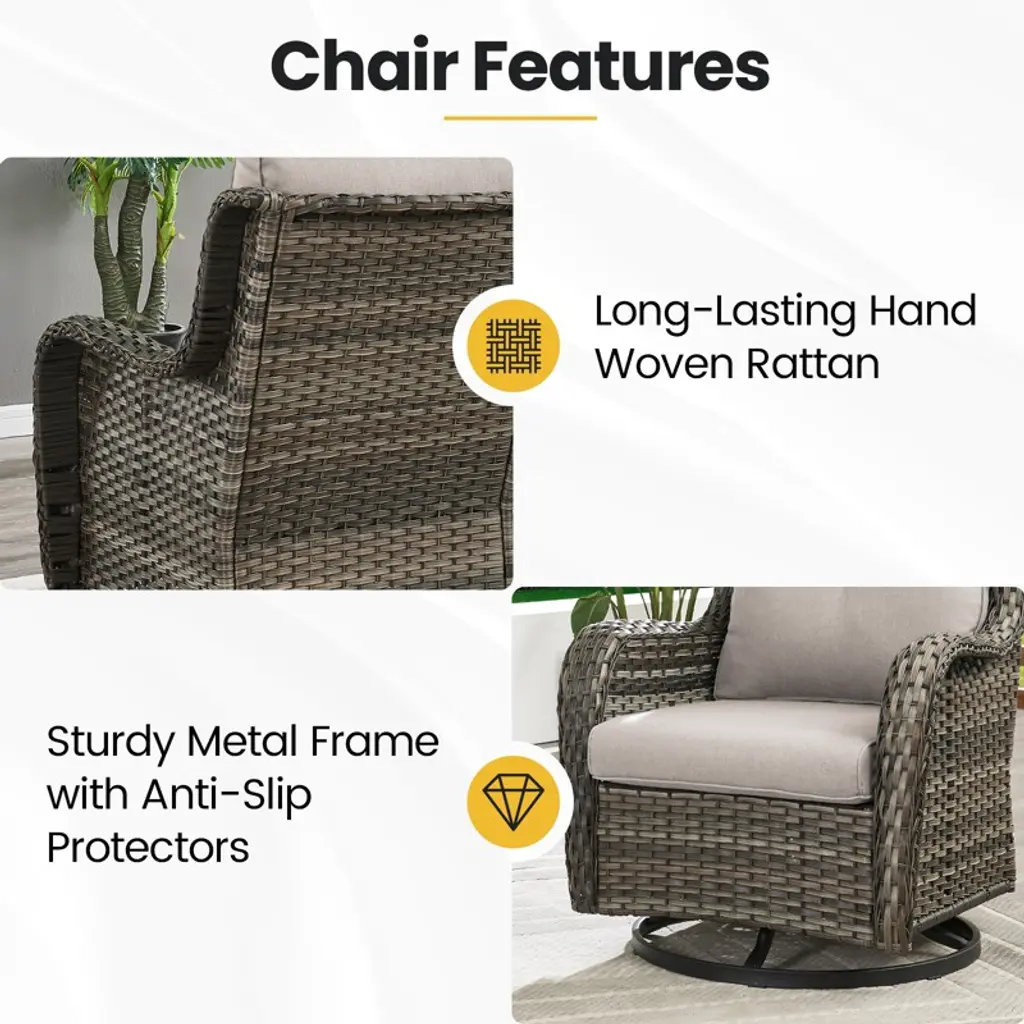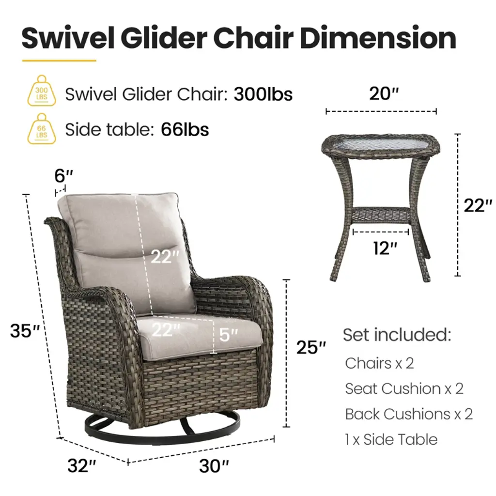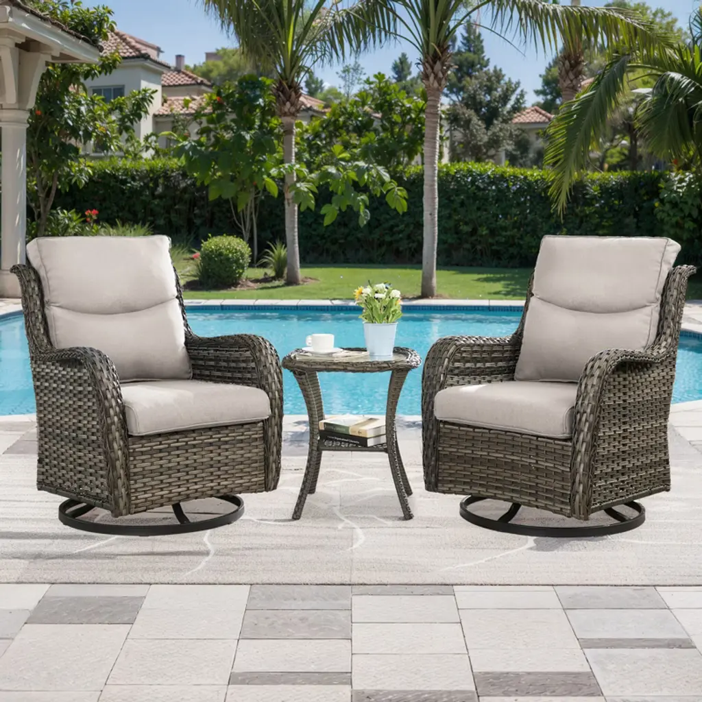 Buenhomino 3Pc Patio Furniture Set With Thick Cushion- Swivel Rocker Chair Bistro Set With Rattan Side Table, Gray Wicker/beige Cushion