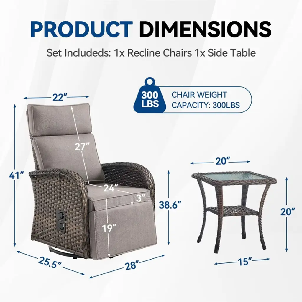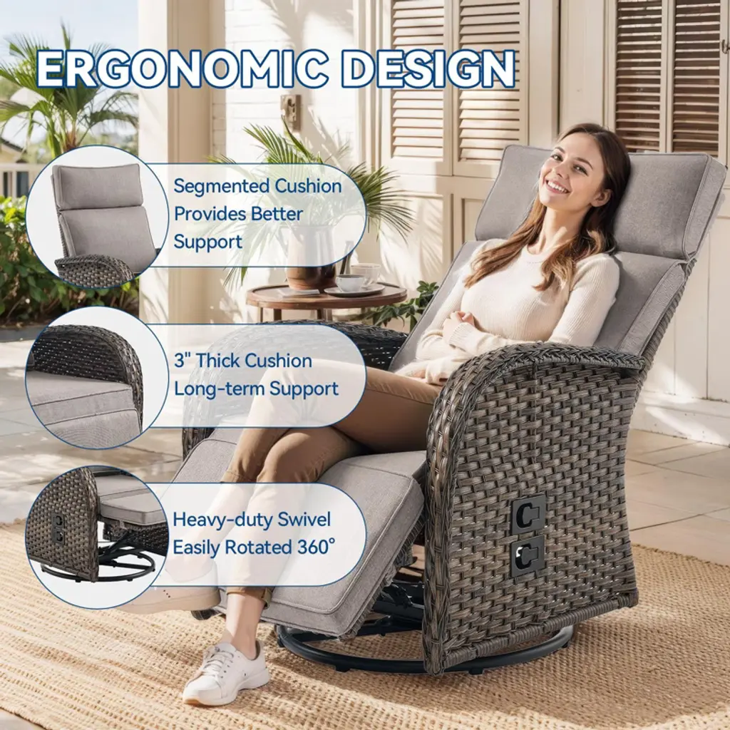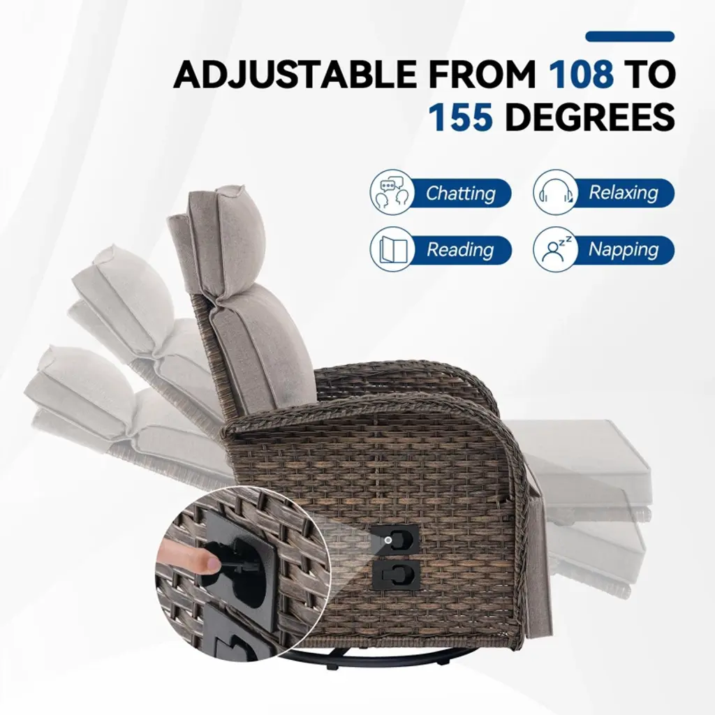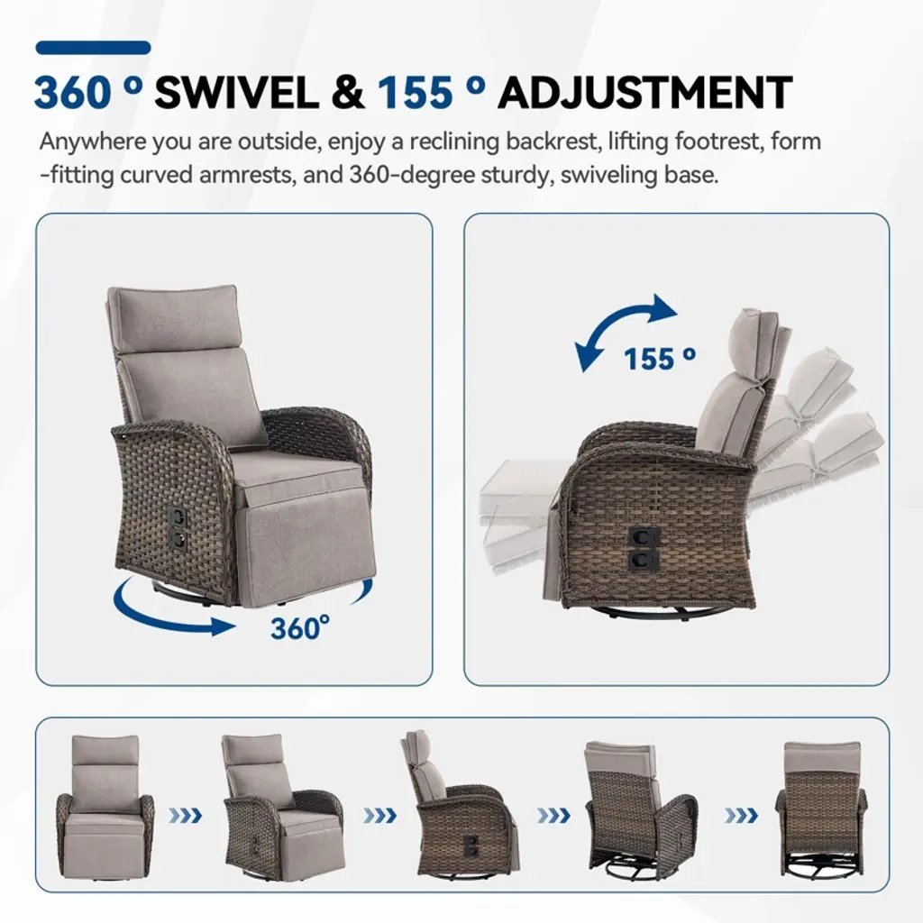 Relax in style with the Buenhomino 2-Piece Wicker Patio Set! This outdoor recliner chair with side table features a 360° swivel & adjustable reclining back (108°-155°), all-weather PE wicker, and thick cushions. Perfect for poolside lounging, garden relaxation, or backyard entertaining durable, comfortable, and easy to maintain!