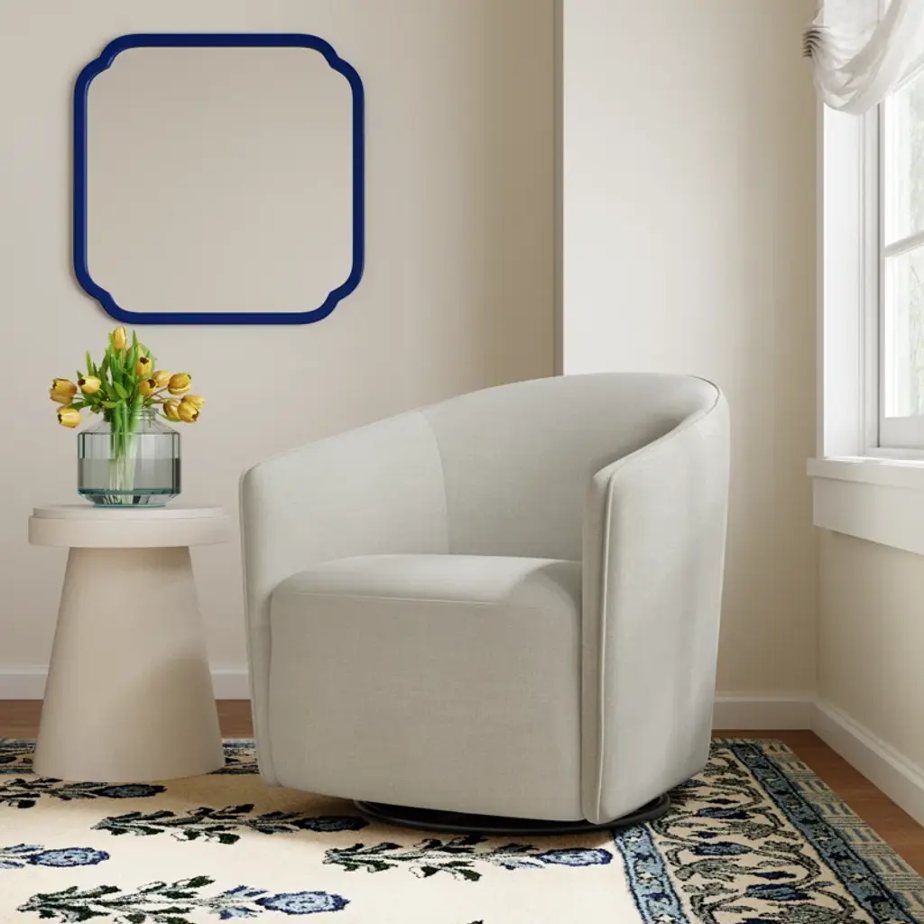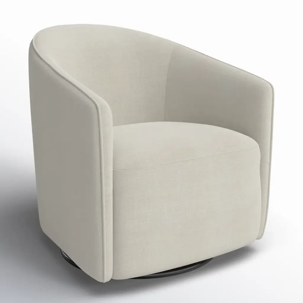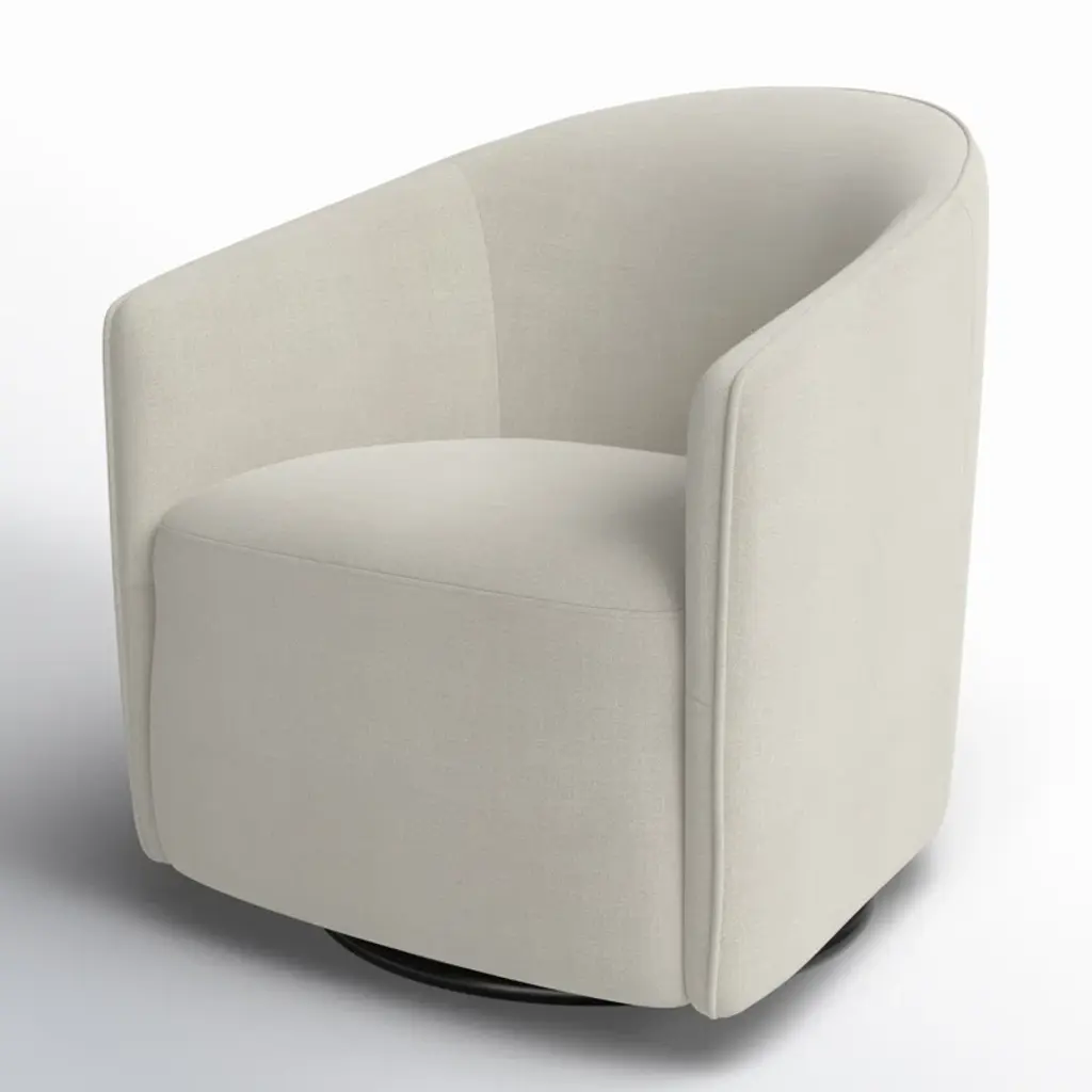 Bring traditional charm to your living room with this upholstered swivel accent chair. It has a wooden frame and strikes a classic barrel silhouette. Plus, the circular metal base makes it easy to turn to the nearest conversation (or the TV screen). Wrapped in a textured fabric, it comes in a muted tone that matches most existing color schemes. Warning: This armchair is generously padded for an extra comfortable feel that may cause daydreams.