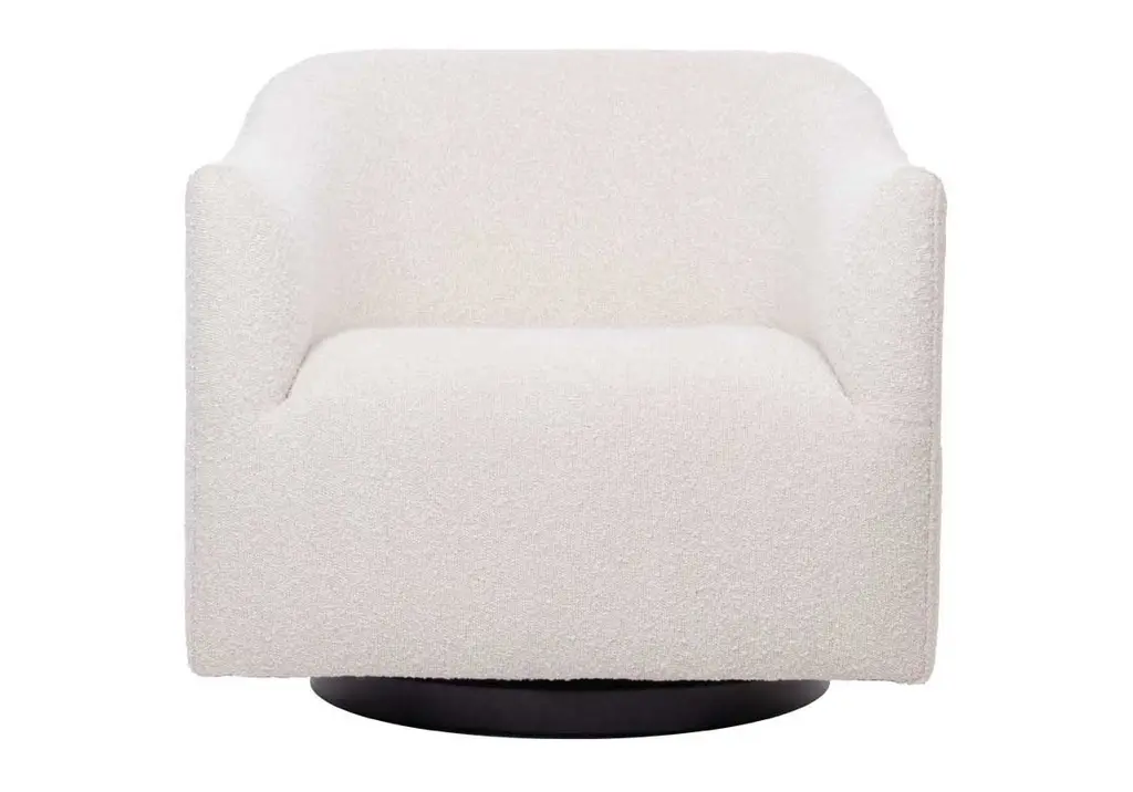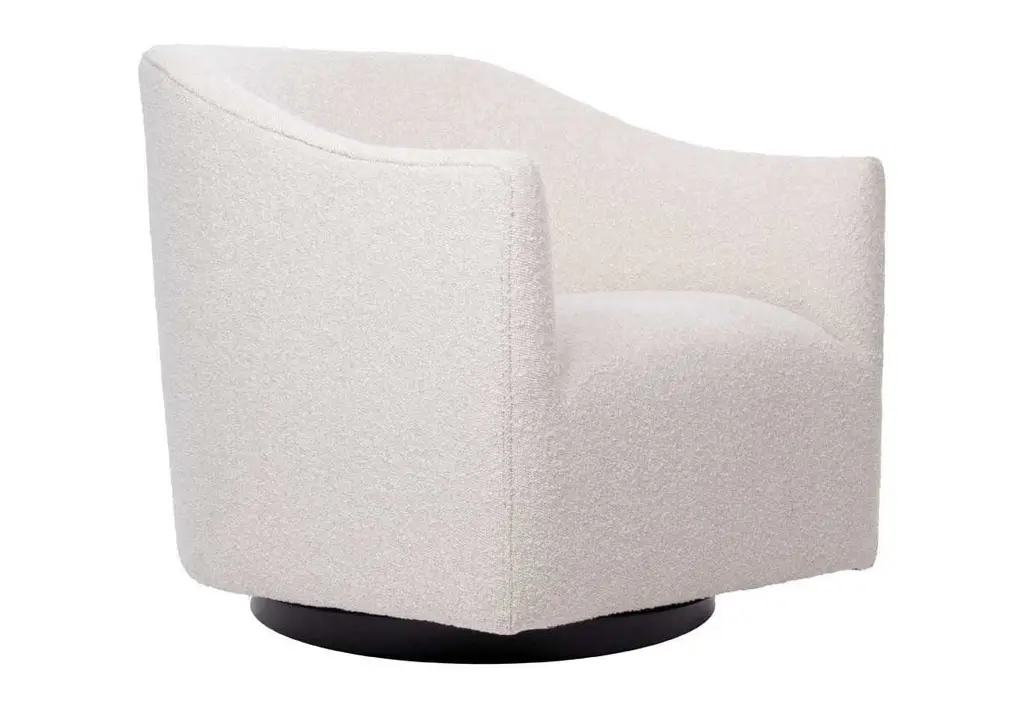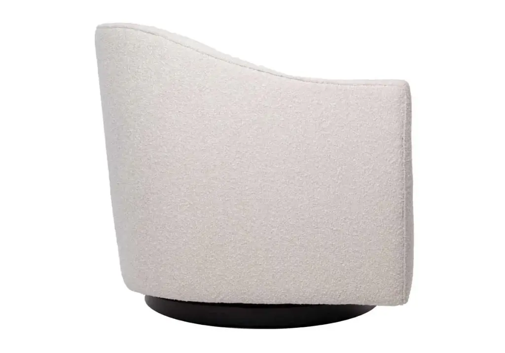 This chic swivel chair lends simple elegance with its curved silhouette and plush cushions. Its versatile cream boucle upholstery is contrasted by a wide, dark base for a sophisticated, visually textured look. Style two with a side table for a collected, attractive design.