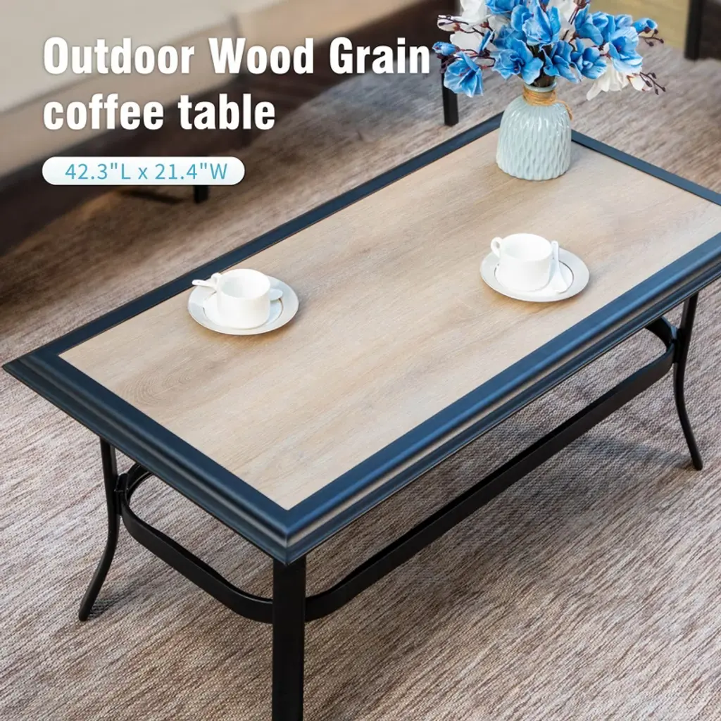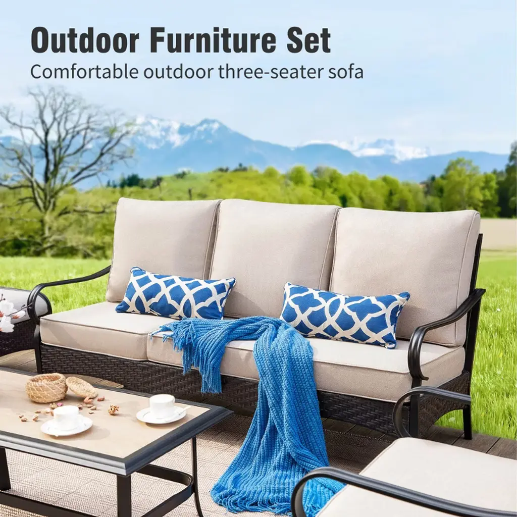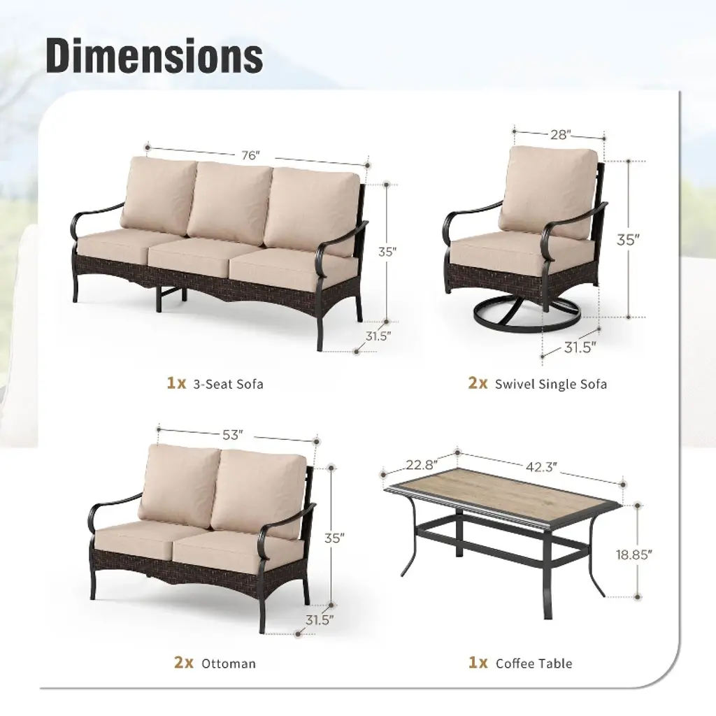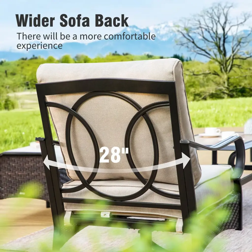 Create a stylish and inviting outdoor retreat with this modern sofa set. The sleek black metal frame features a distinctive open-back design with interlocking circular patterns, perfectly complemented by handwoven rattan for a sophisticated look. The wide and deep seats, paired with cushions that offer both support and comfort, provide an ideal space for long, relaxing outdoor moments. The 360° swivel chair adds flexibility, allowing for easy movement during social gatherings. Crafted with high-quality, weather-resistant materials, this set is designed to withstand the elements, offering lasting beauty and durability season after season.Specification:Swivel chair size: 28”W x 31.5'' D x 35'' H3-seat sofa size: 76” W x 31.5'' D x 35'' H2-sea sofa size: 51” W x 35'' D x 35'' HTable size: 42'' W x 21'' D x 18'' HWeight Capacity of Armchair: 350 lbsWeight Capacity of 3-seat Sofa: 900lbs