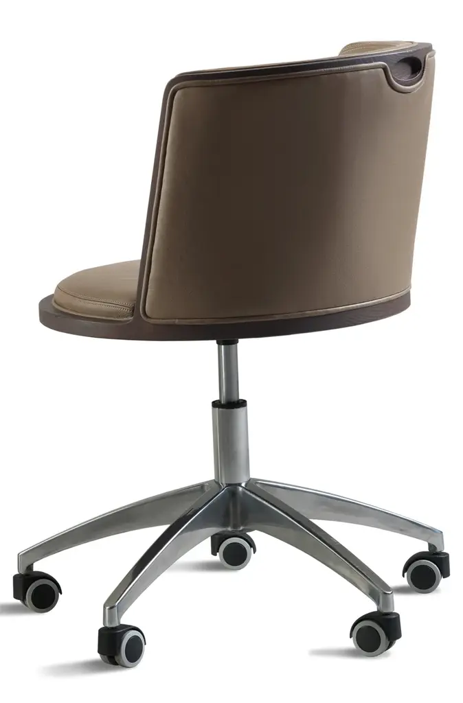 Carambola- Swivel chair made of colored ash wood with metal adjustable leg and wheels.