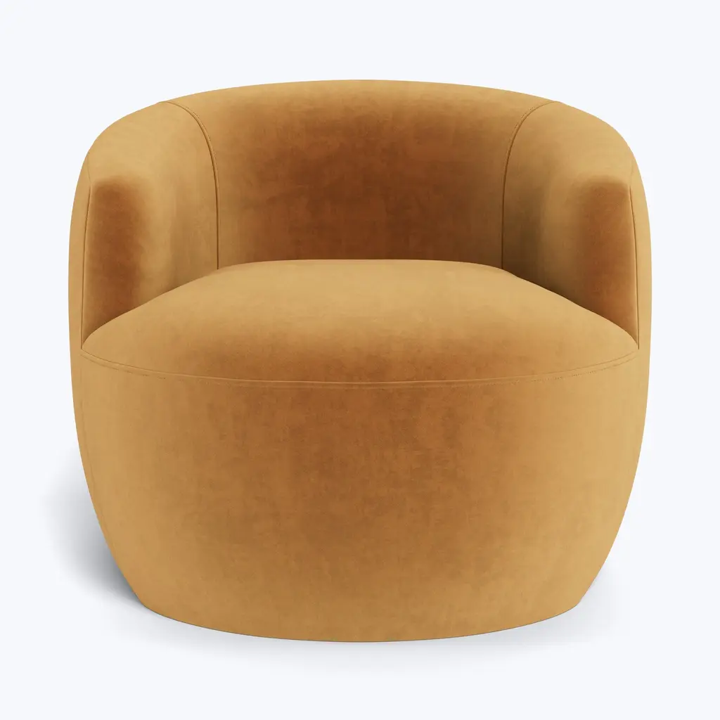 Introducing the perfect blend of bold design and luxurious comfort: the Carrie Swivel Chair. The elegance of Italian design, crafted in the USA This piece features a beautifully rounded, spherical shape that exudes modern elegance, making it a standout addition to any room. The chair's robust shoulders create a captivating silhouette, offering both visual interest and a supportive embrace.The fully upholstered seat is meticulously crafted for comfort, constructed around a sustainably-sourced Goodwood frame. The smooth swivel base adds a touch of functionality, allowing you to effortlessly rotate and engage with your surroundings. Whether you're creating a cozy reading nook or adding a statement piece to your living space, the Carrie Swivel Chair offers elevated style & functionality. abc Cobble Hill offers over 80 color and fabric combinations, empowering you to fully customize the upholstered furniture of your dreams entirely online.