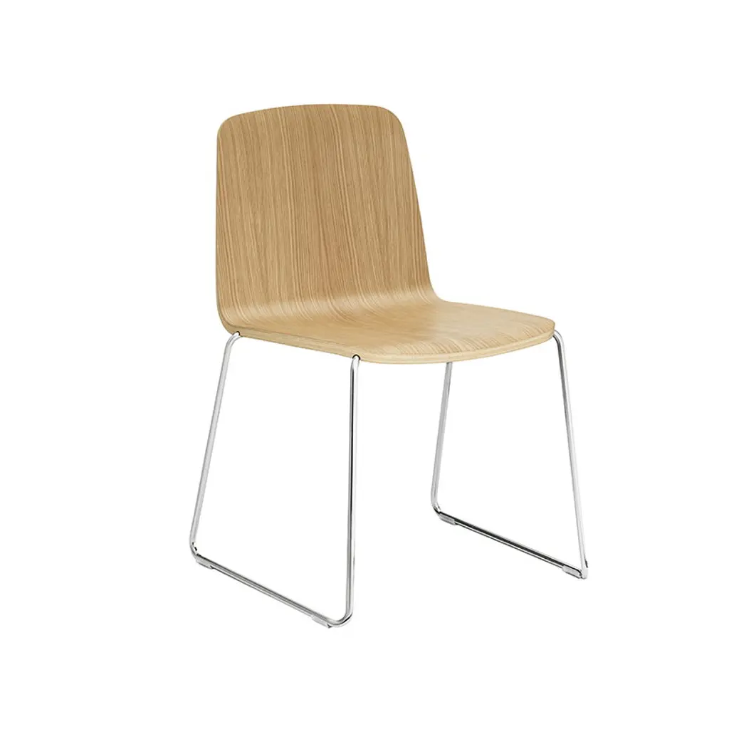 Casablanca is a sled base chair for contract and residential spaces. Versions: frame without arms, skid, plywood shell. Materials and colors: Chromed steel. Plywood oak, walnut or wenge finish. Steel soul and multilayer beech wood shell, upholstered or not. The different versions of the frame: 4 legs, sledge frame or swivel 4 stars base, with or without arms and possibility of writing tablet accessory make Casablanca a complete product. Soft touch nylon covers for the arms; seat is available in wood, completely upholstered or with cushion. Stackable for 4 legs, 4 legs with arms, 4 legs with arms and tablet and sledge frame. A timeless classic revisited in dimensions, special finishing touches and fabrics. The most suitable product for many needs and requirements, contract and home spaces, thanks to the possibility of matching up different structures and shells. Writing tablet option and perfect stackability for every version makes Casablanca the perfect chair for contract spaces. Casablanca is the classic model with unexpected modernity.