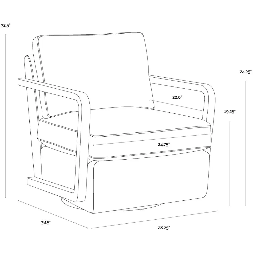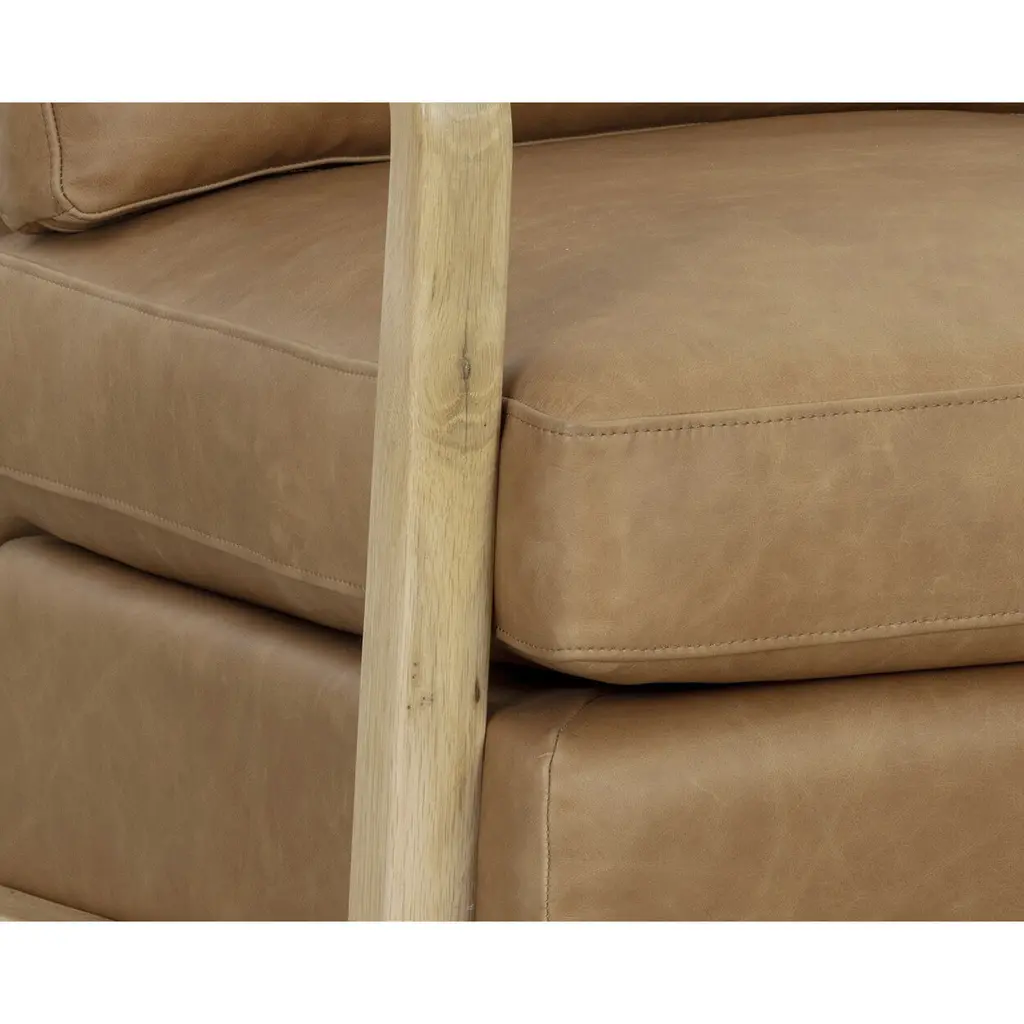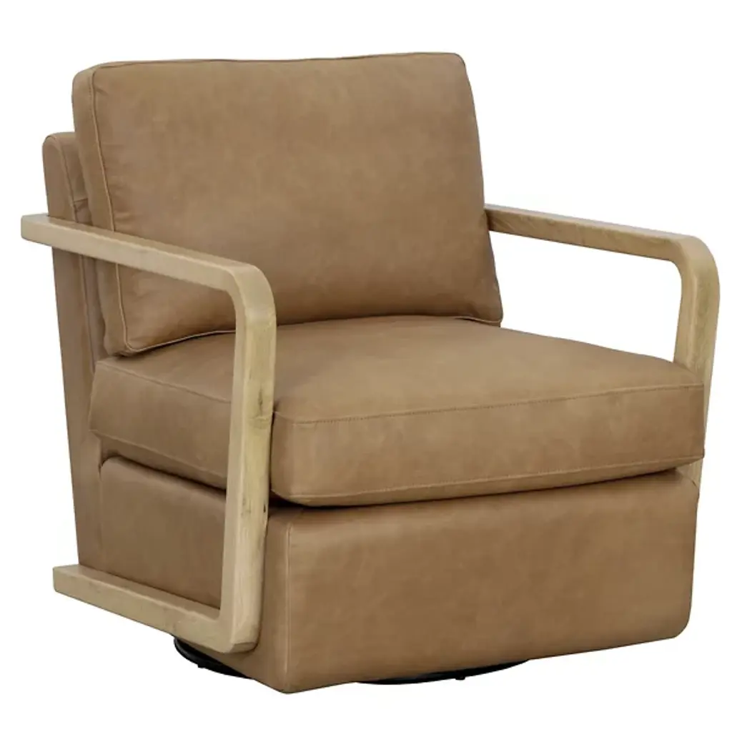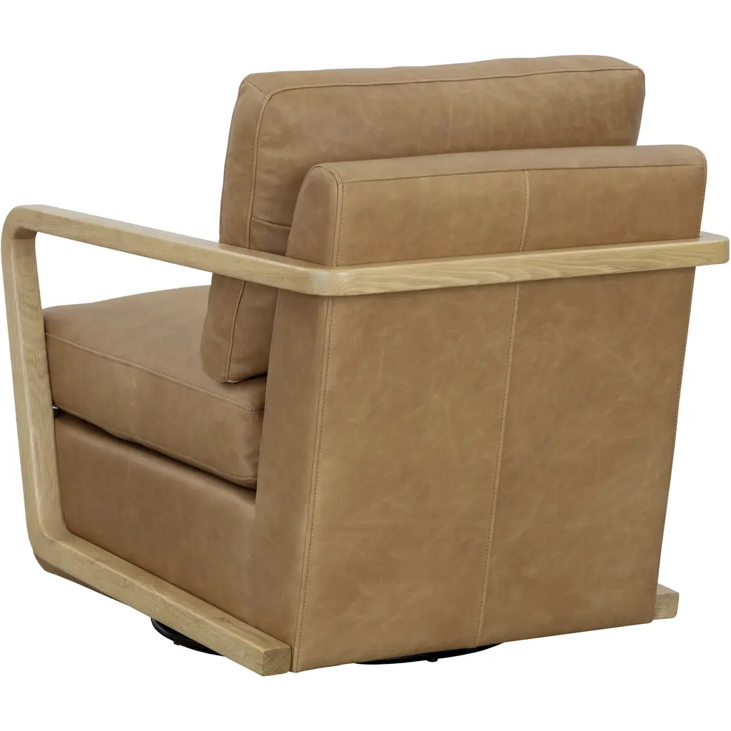 Clean lines make the distinct profile of the Castell Swivel Lounge Chair. Fully upholstered in our ludlow sesame leather for maximum comfort. Rustic oak wood arms complete the look. Handle with Care: This design has been crafted with 100% leather. Leather is a natural material as such, colour variations, markings, wrinkles, grooves and light scratches are acceptable and appreciated characteristics. No two pieces are alike. Visit our Product Care page for more information on how to ensure the lasting beauty of this piece. As wood is an organic, porous material, these pieces will contain natural variation of texture and may also exhibit fine indentations and cracks. Wood pieces will also display a disparity of colour and grain, and visible knots and burls that add to the character of each piece.
