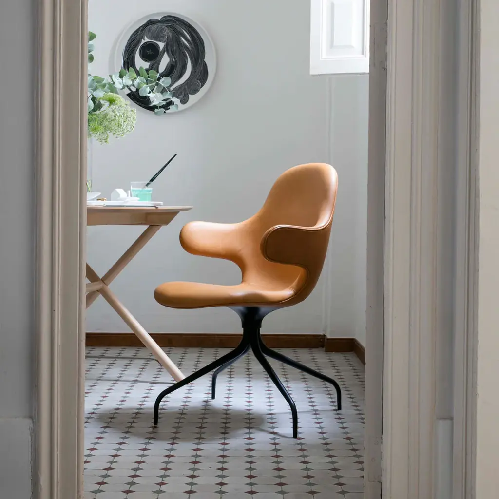 CATCH, Jaime Hayon's first contribution to &Tradition's collection, is a chair that welcomes you with open arms. Its armrests extend from the shell like literal limbs, ready to embrace you as you sit down. The Chair has already proven to be a great success. It won the prestigious Best of the Year Award 2013 in the category of Seating: Contract/Conference from the American magazine Interior Design and it starred in exhibitions such as the Jaime Hayon retrospective Funtastico at the Groninger Museum, showcasing some of the celebrated designer's finest pieces. Now &Tradition is introducing CATCH CHAIR in a new swivel base edition, making the comfortable chair even more flexible and suited for the contract and conference market. The new swivel base enhances the chair's light and playful expression and serpentine lines and acts as the perfect base for the high quality shell. The swivel base is in cast aluminum and the shell is made from molded polyurethane foam with a metal frame and glass fiber reinforcements. Covered in cold cured foam, and finally, leather or textile upholstery, the shell offers comfort and great variability.