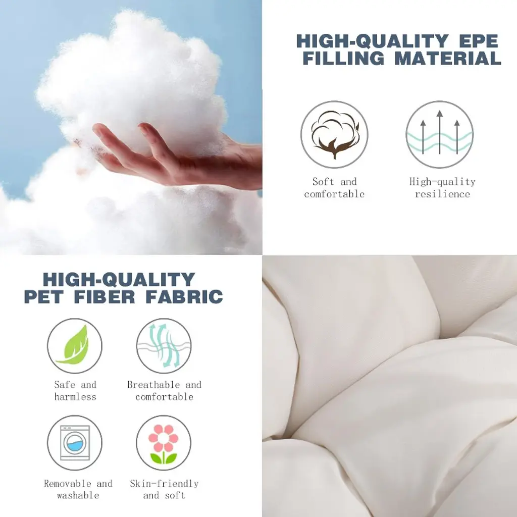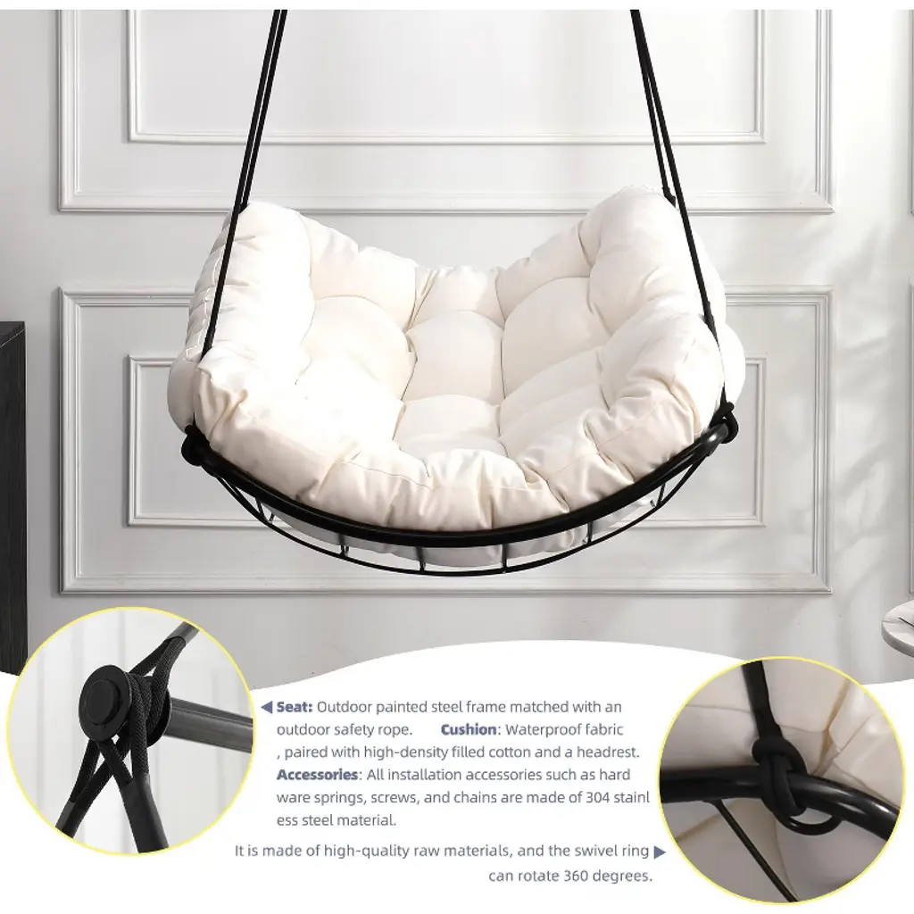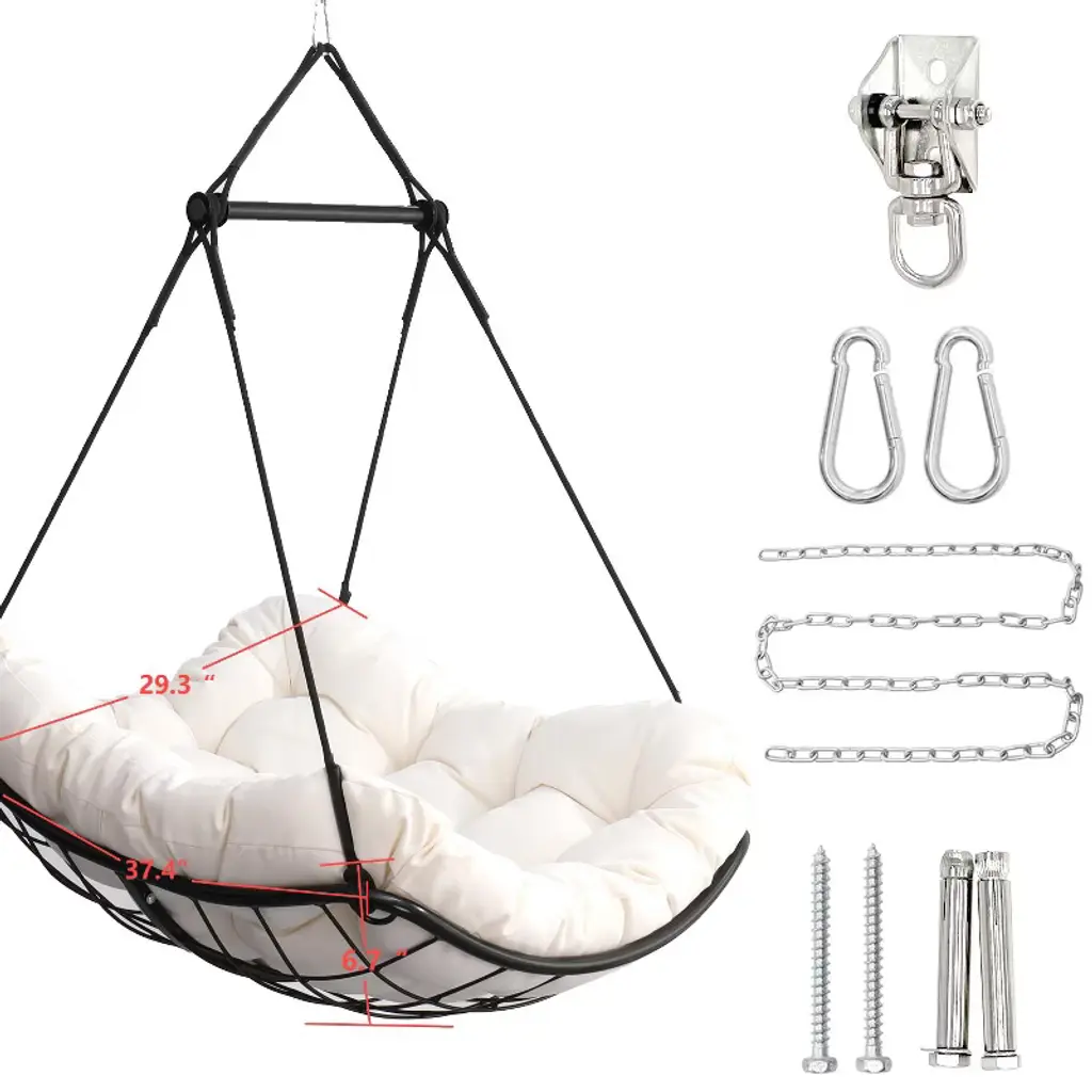 Sink into comfort with this deluxe hanging swing chair, featuring an oversized upper cushion upholstered in breathable cotton and polyester fabric for superior support of your hips, thighs, and legs. Designed for durability, the powder-coated frame and waterproof cushion ensure long-lasting performance in any environment. The 1.2-meter chain allows adjustable height, while the 360° swivel ring adds a dynamic range of motion. Easy to install with a detachable design that takes just minutes, this versatile chair can be mounted indoors or outdoors—from the ceiling, a stand, or even a sturdy tree branch—offering the perfect retreat wherever you need it.Product Notes:Safety weight test required before useIncludes installation tools and hanging kitEasy 3-minute assembly