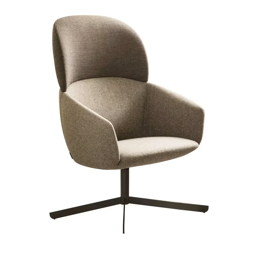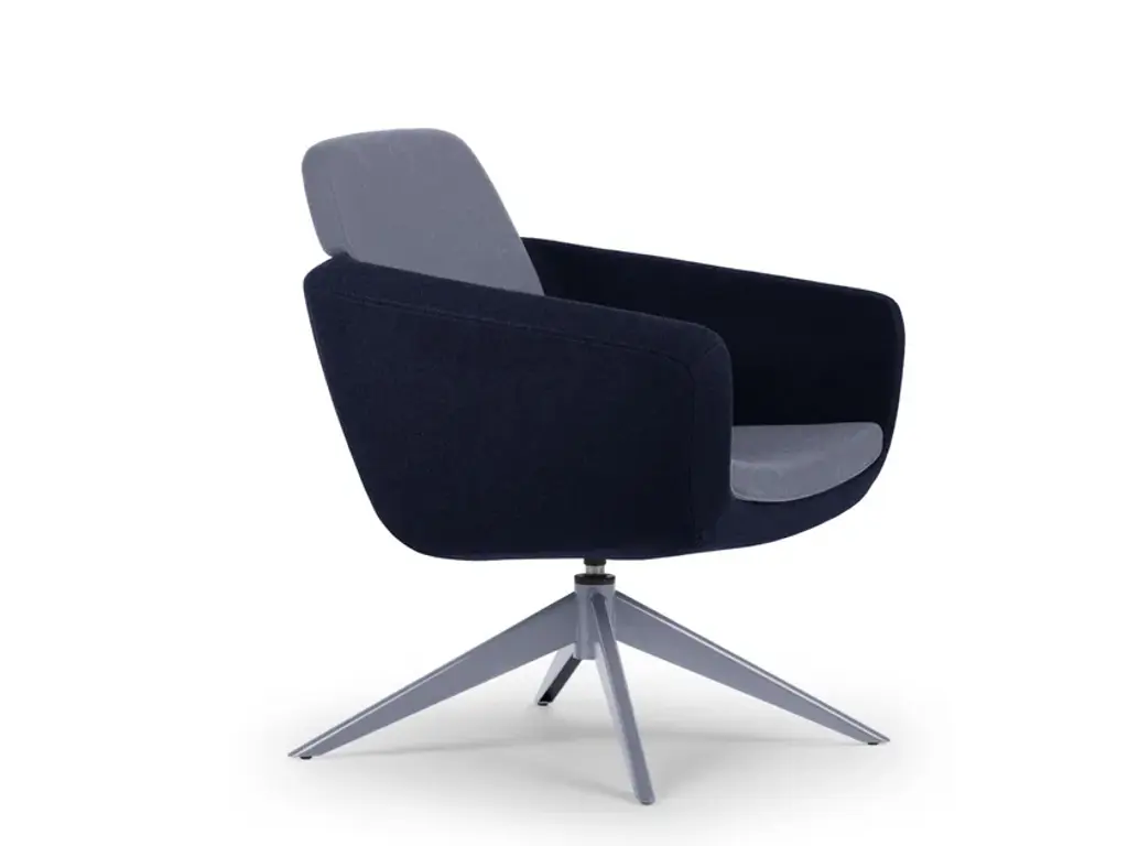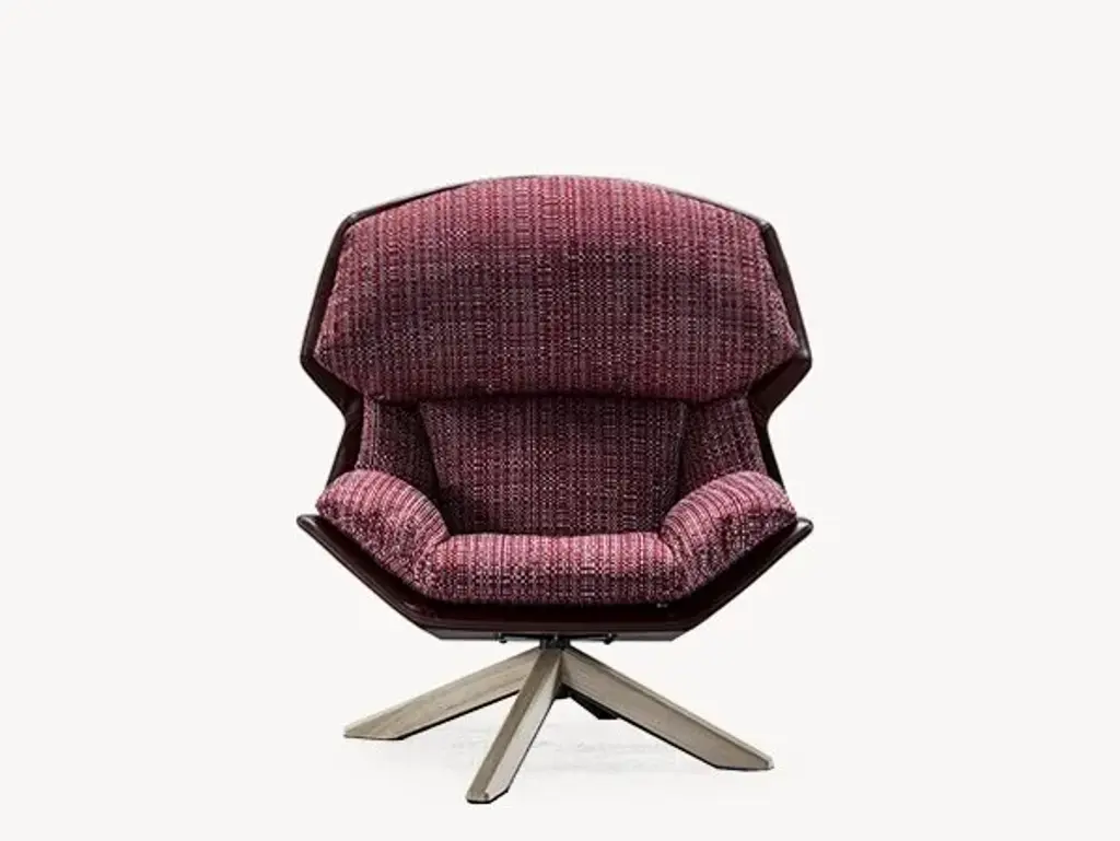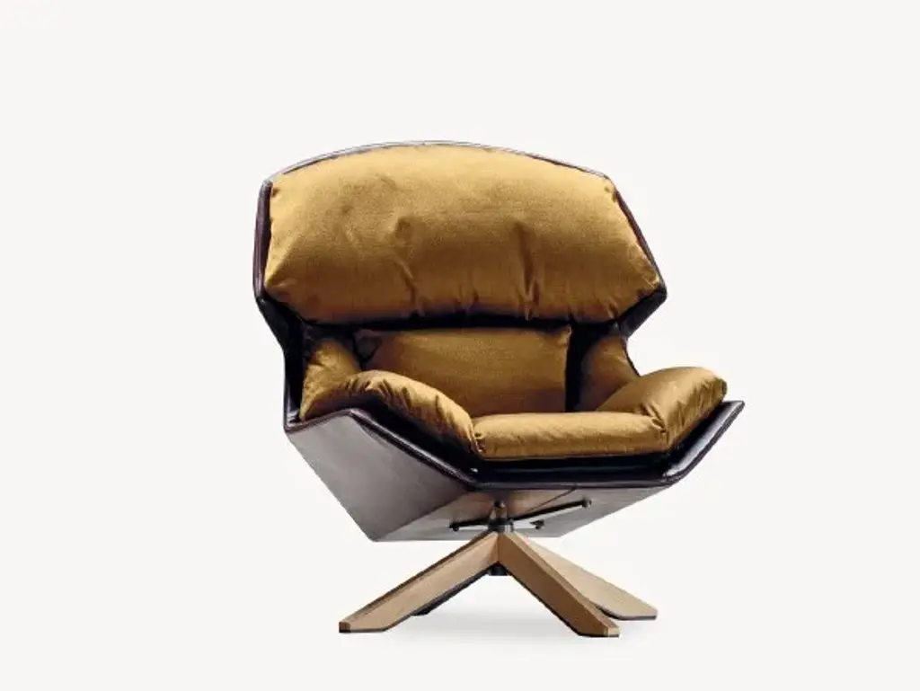 Clarissa is a dynamic easy chair,ready for action but open to relaxation, the temporary suspension of activity. A combination of competition and collaboration, provocation and aesthetics.Injected flame-retardant foam on steel frame. Swivel base in varnished steel or with oak cover. Clarissa cover is not removable; removable quilt is fixed with zipper.