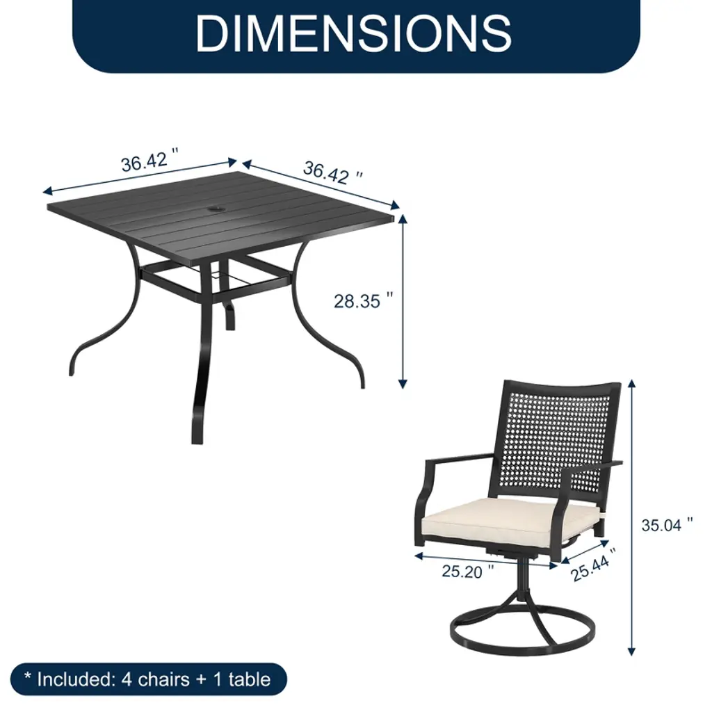 Upgrade your outdoor space with this 5-piece patio dining set, featuring a square table and 4 swivel chairs. The durable, rust-resistant frame and breathable fabric offer year-round comfort, while the umbrella hole adds shade-ready convenience for relaxed entertaining.