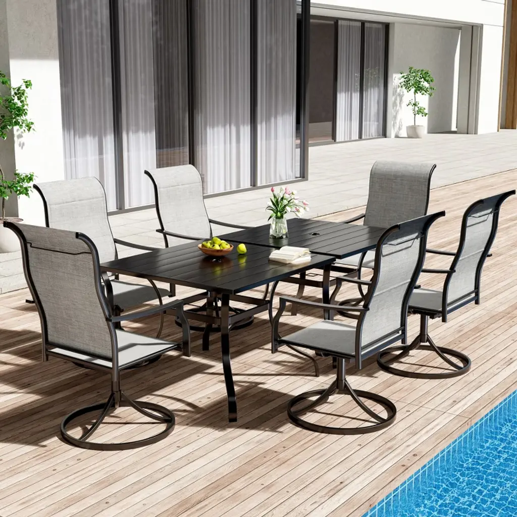 Enjoy stylish outdoor dining with this 8-piece patio set featuring 2 tables that combine into a rectangular table for 4-8 people. Durable powder-coated steel frames and breathable Textilene fabric offer rust resistance. Includes swivel chairs with ergonomic high backs and an umbrella-ready table.
