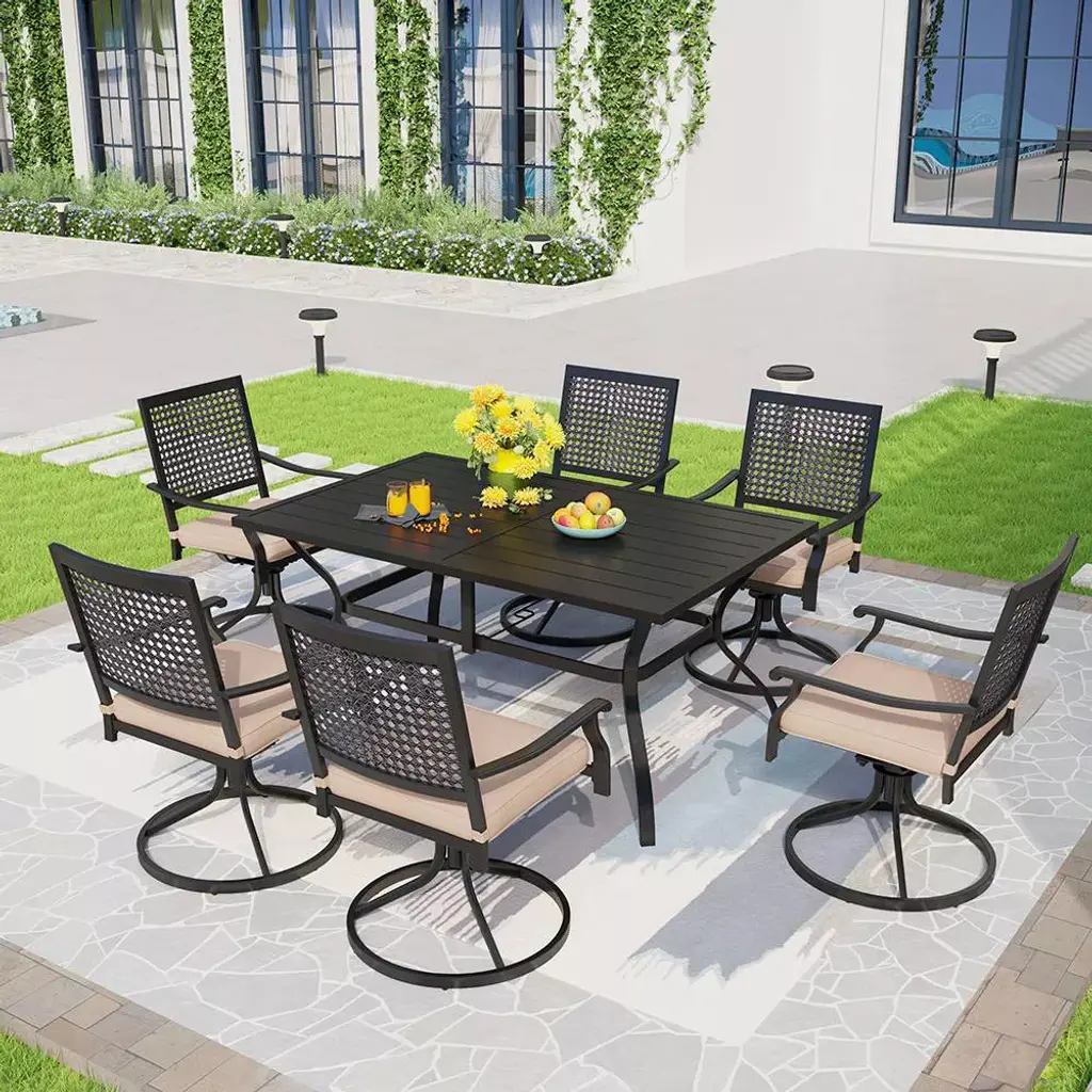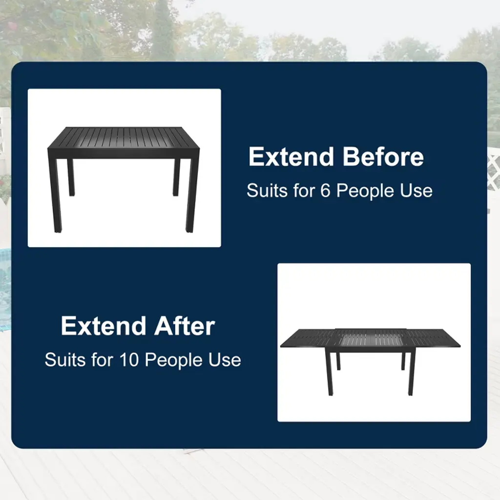 Dine in style with this 9-piece patio set featuring 8 swivel chairs and a rust-resistant extendable dining table. From casual family dinners to lively gatherings, its weatherproof build, ergonomic comfort, and flexible seating make it perfect for any outdoor space.