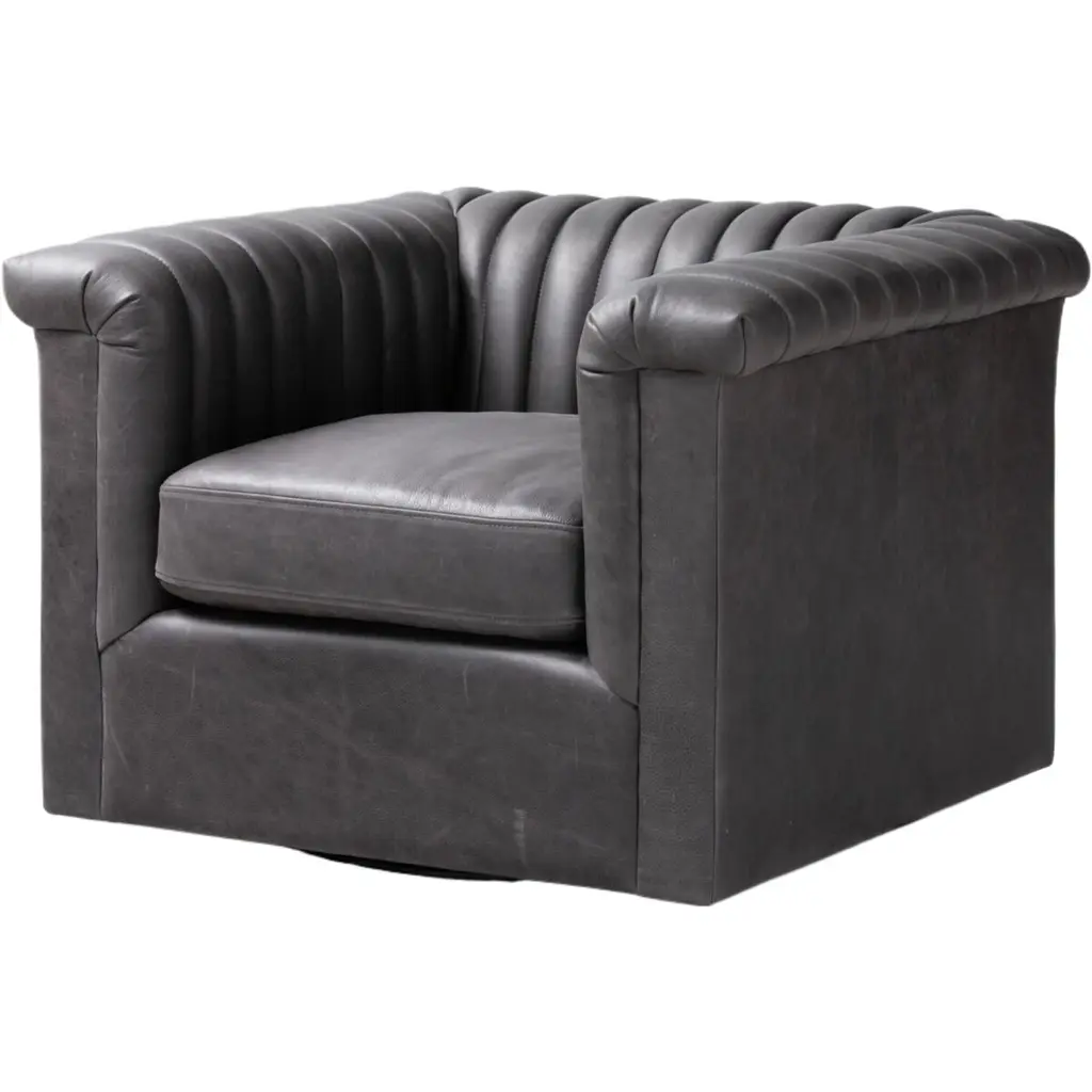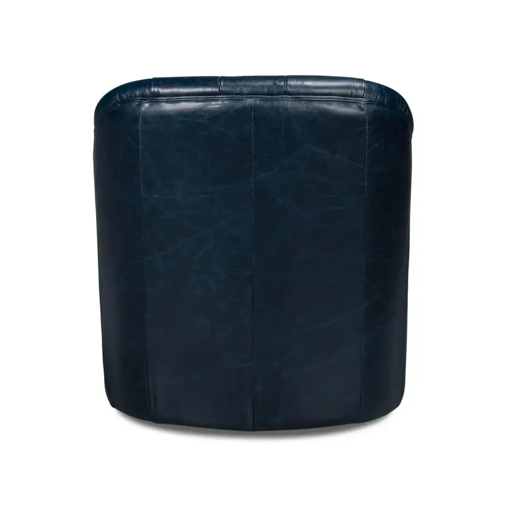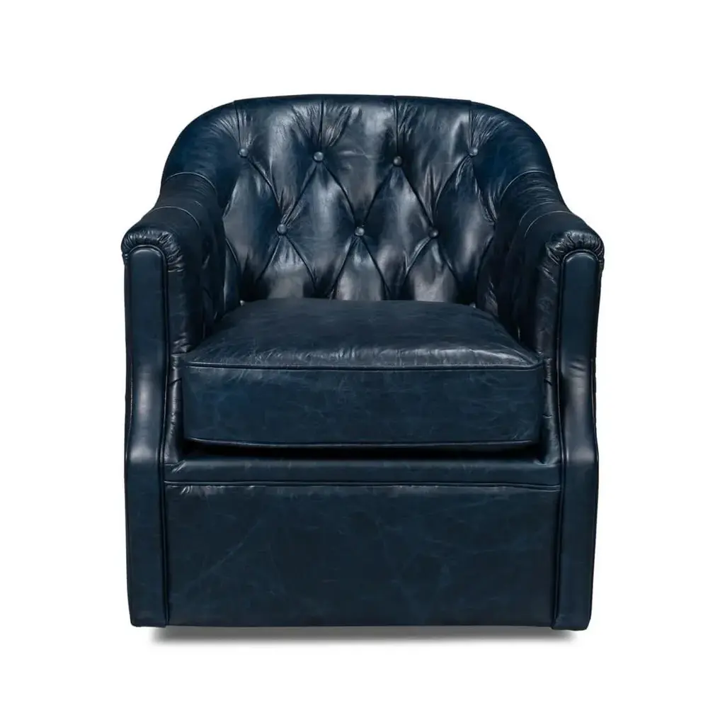 A classic leather upholstered tub back armchair. In our Chateau Blue leather with button tufted backrest and a cushioned seat, raised on a swivel base. Dimensions: 30" W x 28" D x 31" H Seat - 20" W x 22" D x 18" H Arm - 25" H Some color variation is common and acceptable on vintage-style leather.