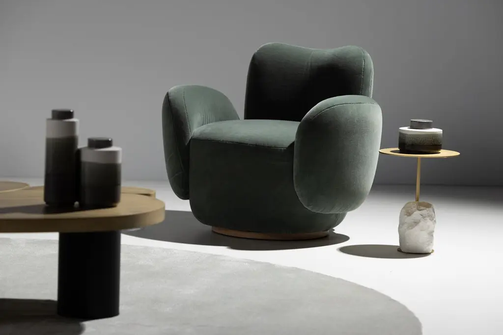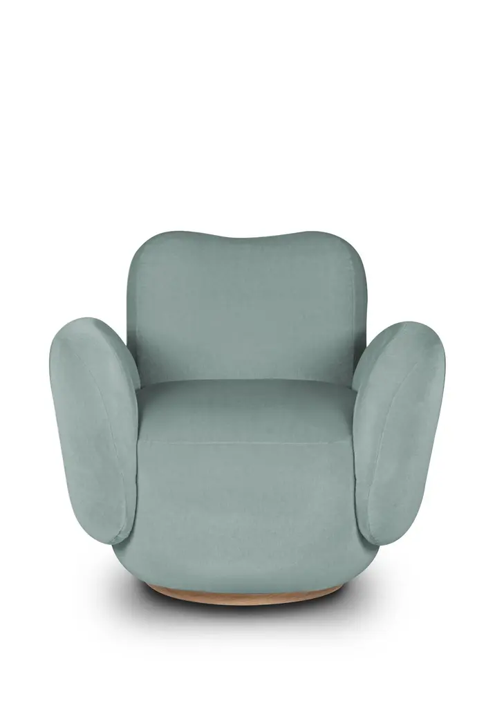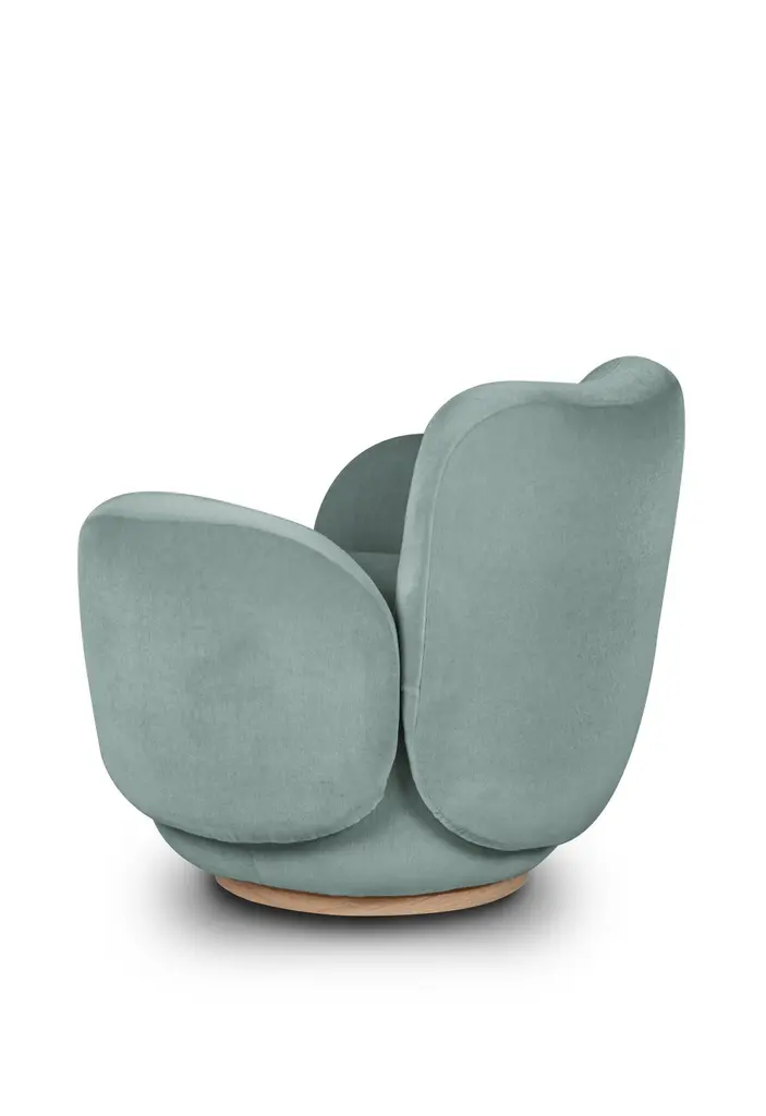 Mid-Century Modern Conchula Swivel Armchair, Contemporary Collection, Handcrafted in Portugal - Europe by Greenapple.The Conchula swivel lounge chair is a room-defining furniture piece, distinguished by its eye-catching silhouette. Designed to provide ultimate comfort for moments of relaxation, Conchula seamlessly combines timeless craftsmanship with modern sophistication. Whether paired with the Conchula curved sofa or daybed, this lounge chair enhances any contemporary interior, elevating the space with its refined presence.The Conchula armchair is upholstered in light green mohair velvet fabric. The fabric can be treated with a stain-resistant finish for added durability.Its structure is crafted from birch plywood, providing stability and strength. The base features an anti-fungal and vermin-free American oak veneer with open-pore and matte varnish.For outdoor use, the armchair can be customized with weather-resistant upholstery and high-performance outdoor foam. The internal structure will receive a protective sealing treatment, while the base will be finished with a highly resistant exterior-grade varnish to ensure durability in outdoor conditions.The Conchula lounge chair can be customized in terms of dimensions, materials and finishes.Conchula Armchair Material CodesWD027 American Oak, Stained Open-pore, Varnished, Natural White Oak, MatteMohair Velvet, Light GreenHandcrafted in Portugal - Europe by GreenappleUnique by design, Crafted by peopleGreenapple transforms contemporary spaces into exclusive narratives of design and craftsmanship. From custom-made furniture to bespoke interiors, each creation is a timeless work of art, shaped by master artisans who honor centuries-old techniques.Founded in 2005 by Sérgio Rebola and Rute Martins, Greenapple has earned global recognition among high-end clientele and leading design firms. While Rute designs each unique piece, Sérgio ensures uncompromising quality from design to production and from production to your home. We provide a seamless experience, offering short production lead times, worldwide delivery within 7 to 10 days, and white-glove service upon request.For U.S. clients, we can handle all customs clearance, cover duties, and offer white-glove service as well upon request.Armchair, Accent Chair, Easy Chair, Wing Chair, Club Chair