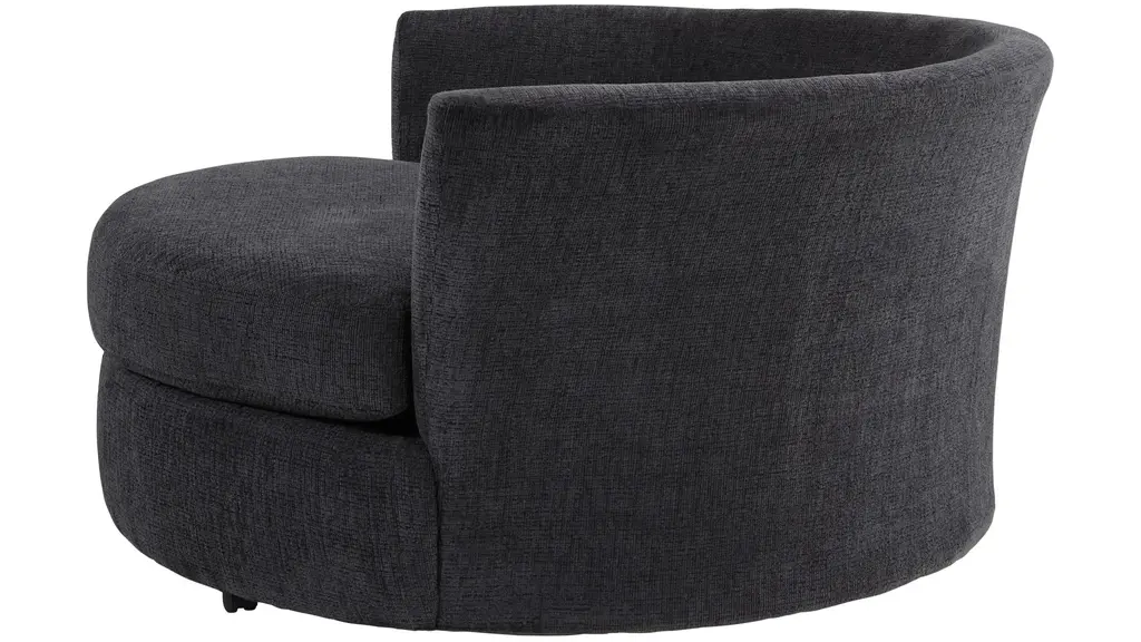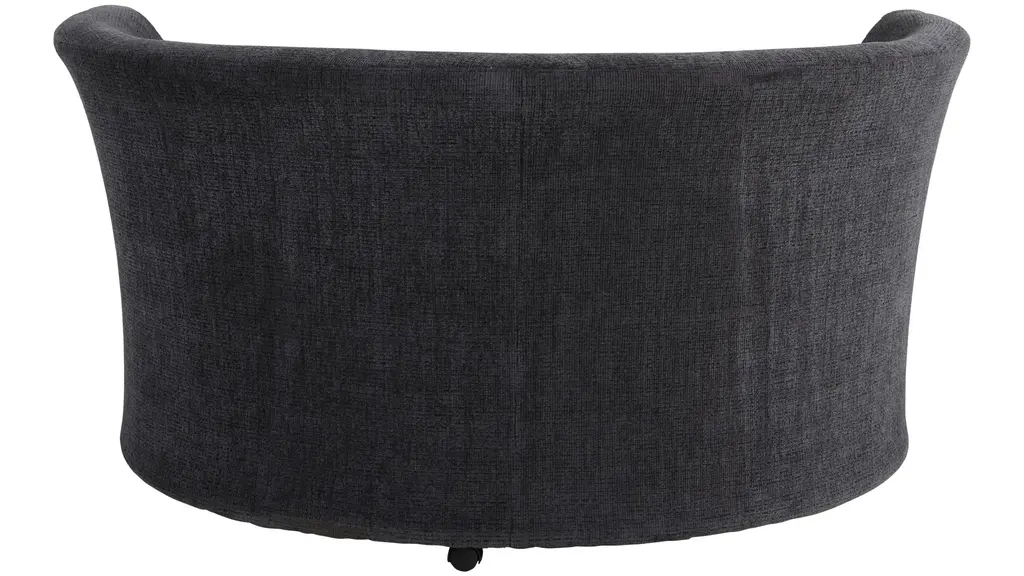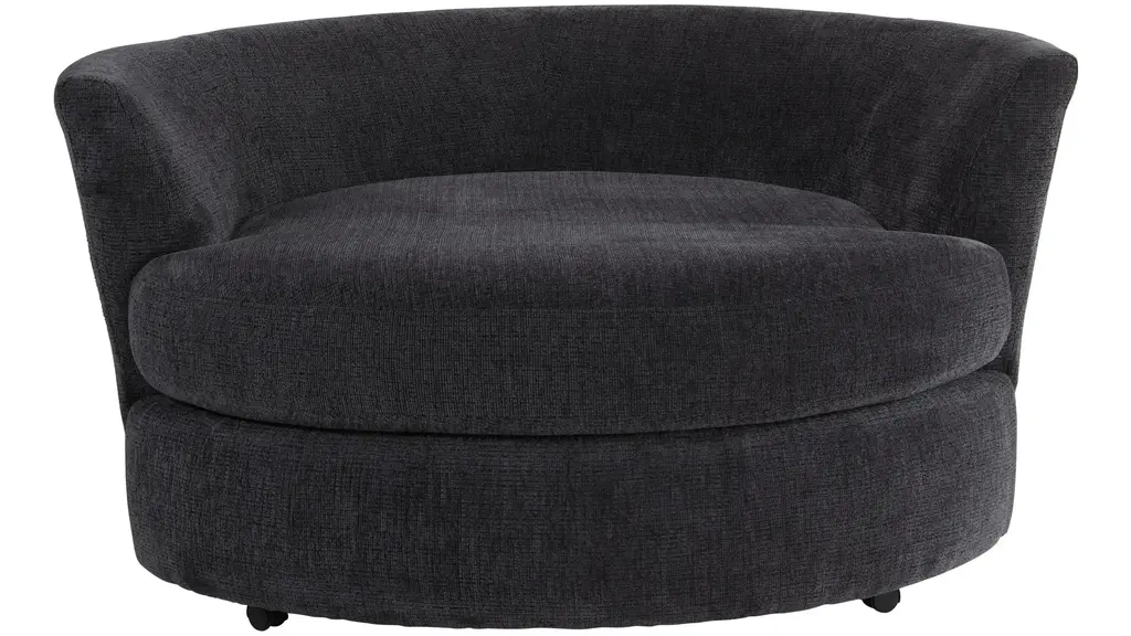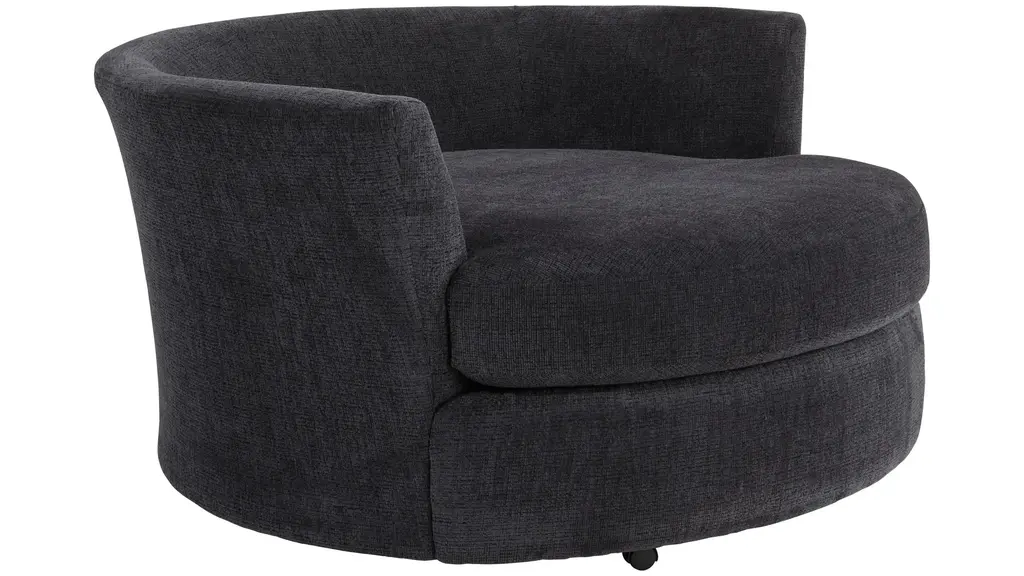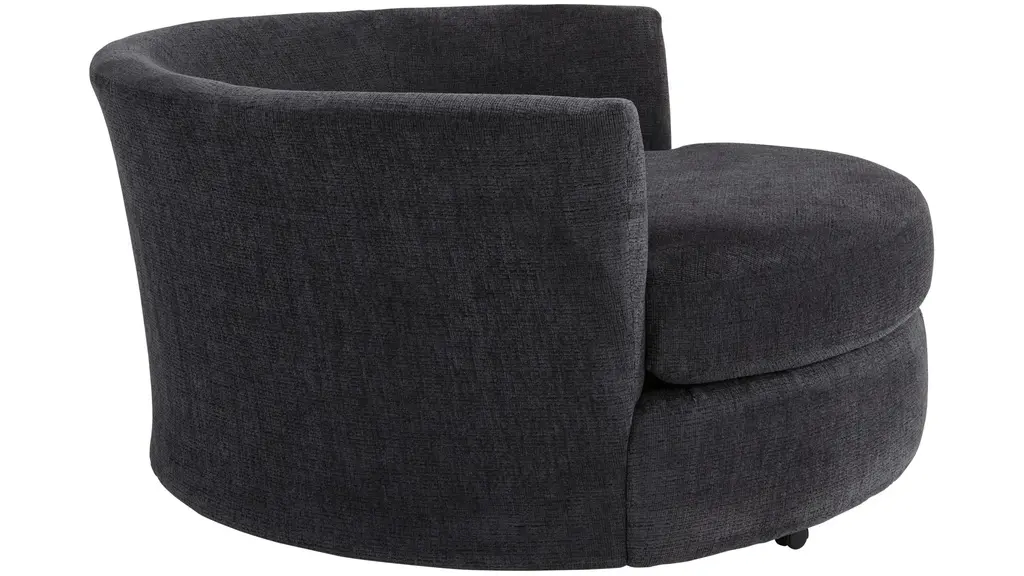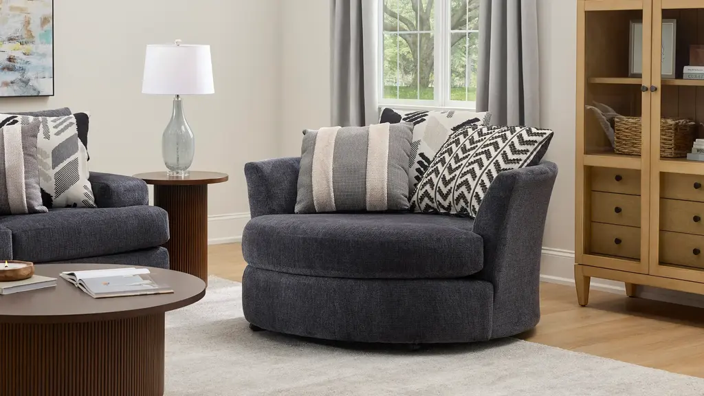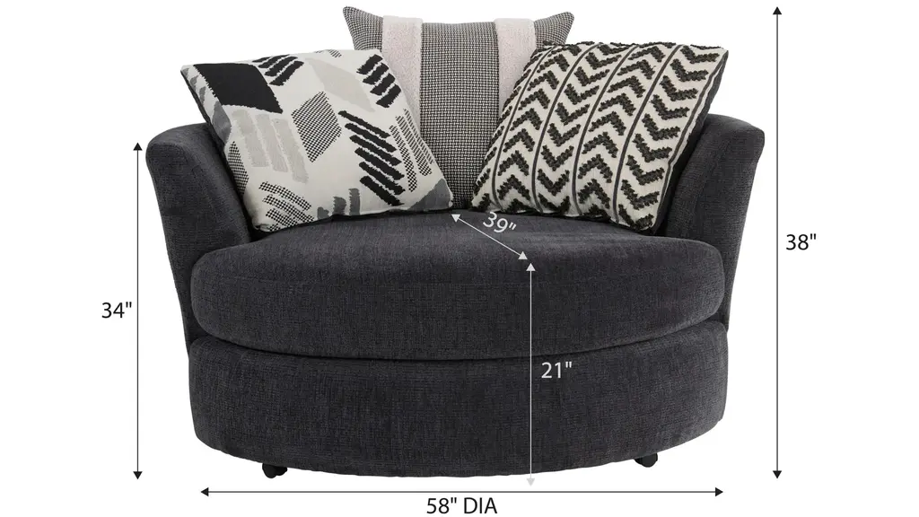 Let the curved lines and generous seating space of the Cooper swivel chair welcome your family and friends to sit back, curl up, and stay a while. The charcoal color, ebony feet, and 3 complementary accent pillows give this chair a bit of modern rustic flair that easily updates your style quotient.