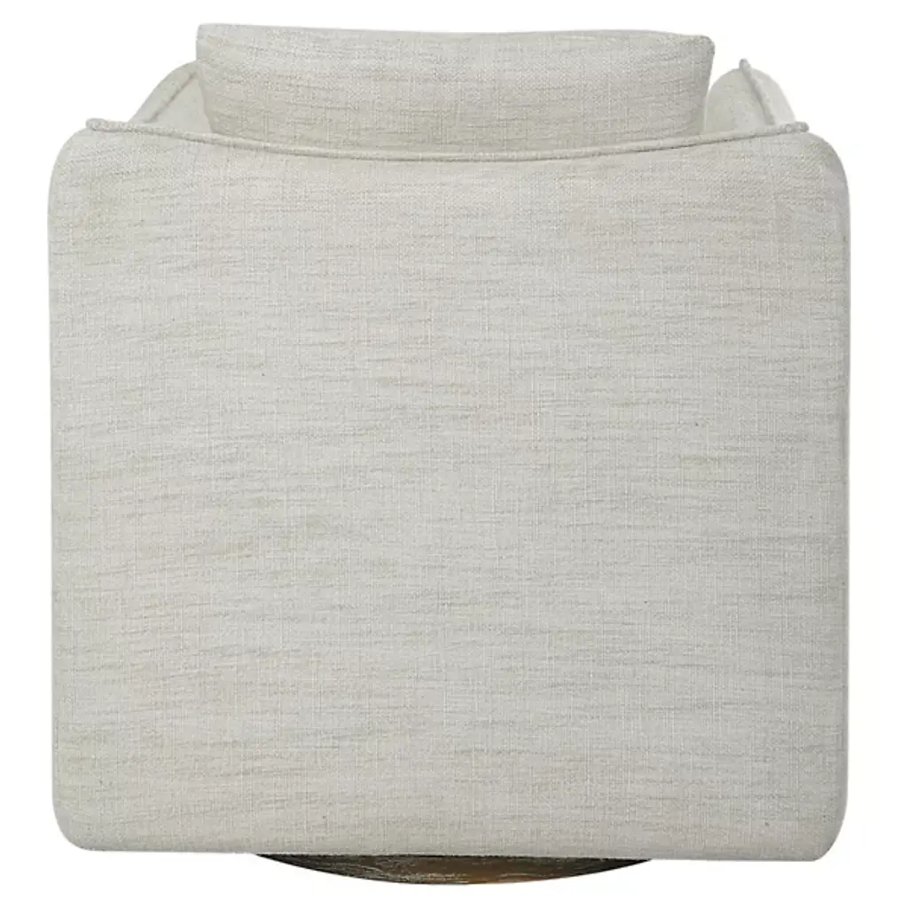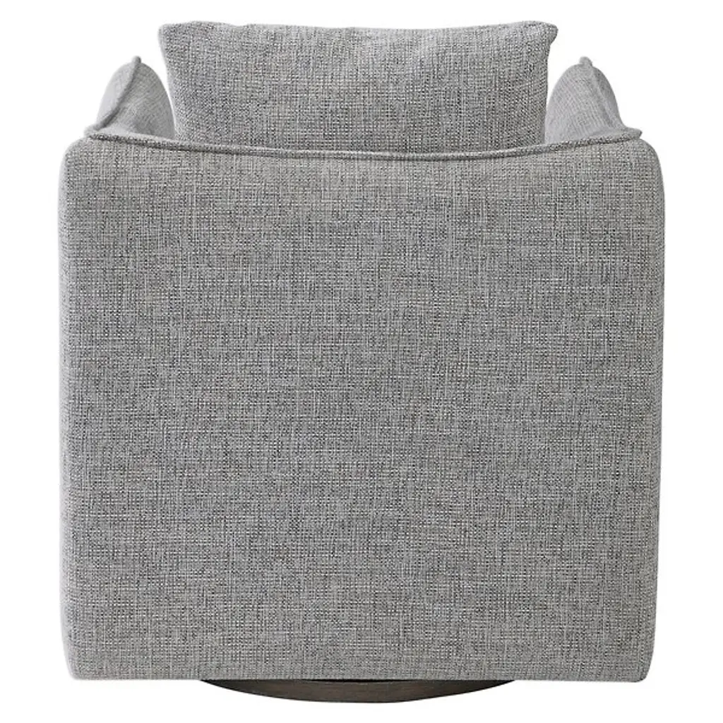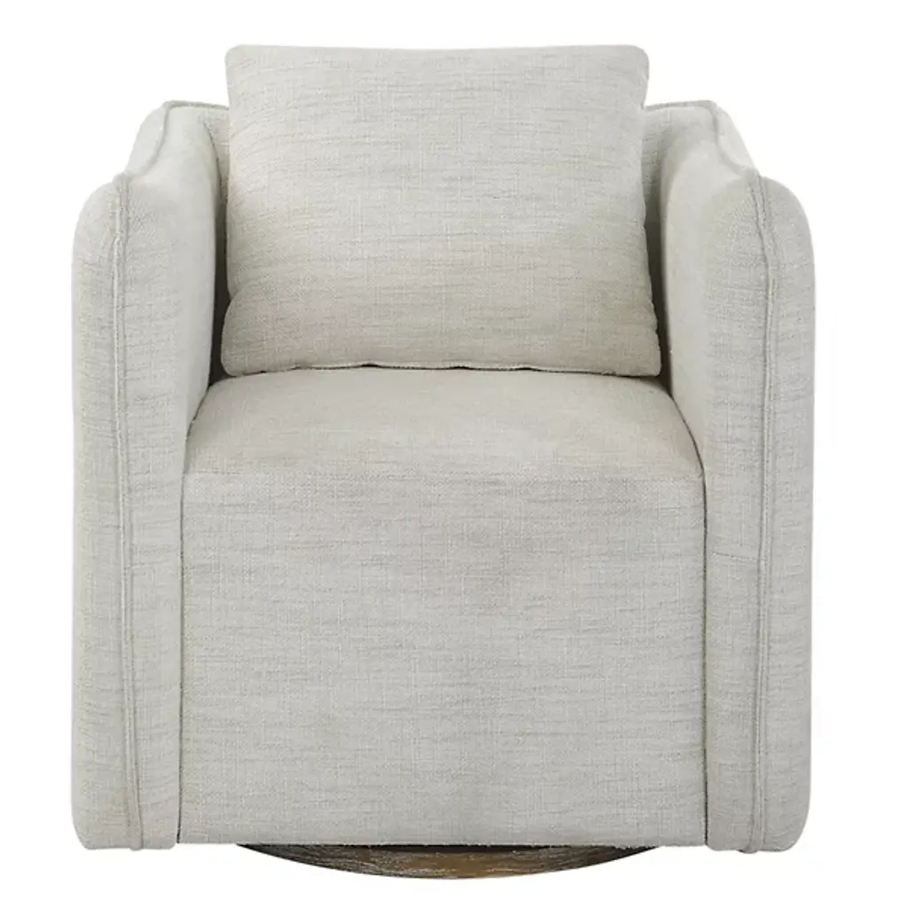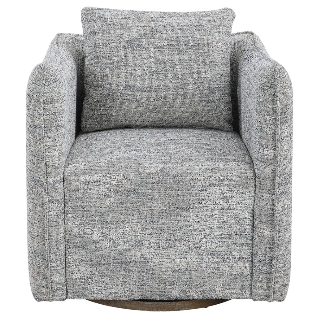 Provide casual sophistication to your living space with the Corben Swivel Armchair by Uttermost. Designed by Matthew Williams, this accent chair boasts a casual shelter arm silhouette, upholstered in a relaxed fabric for a laid-back vibe. Its flanged edge trim and loose back pillow offer subtle detailing and added comfort. Supported by a solid birch wood swivel base with a weathered exterior finish for a note of contrast, this chair effortlessly combines contemporary style with functional design. The seat's blend of comfort and modern aesthetics enhances any contemporary interior.