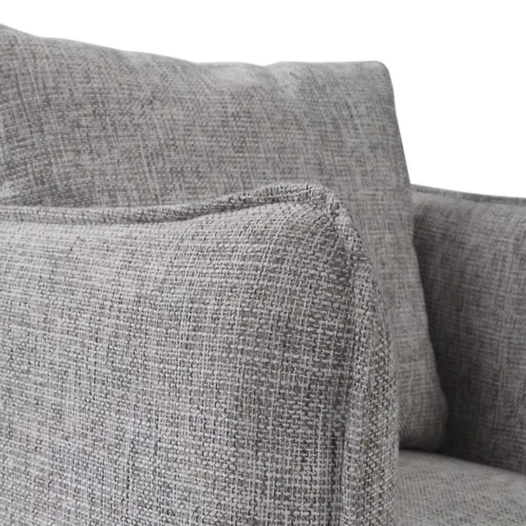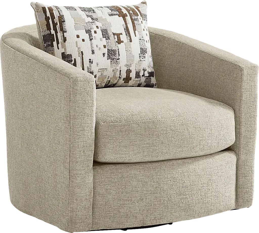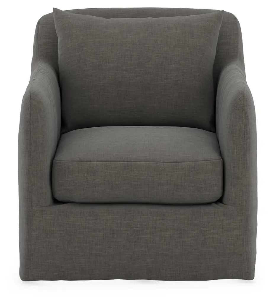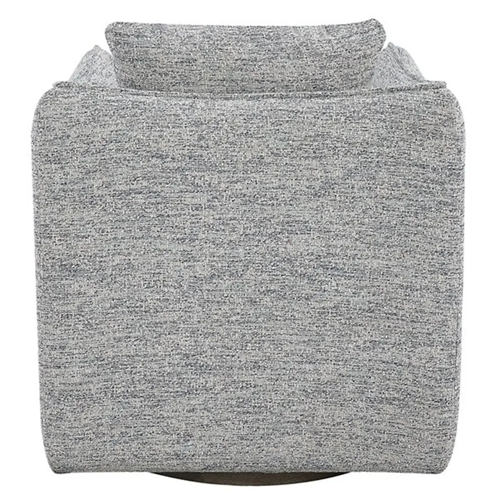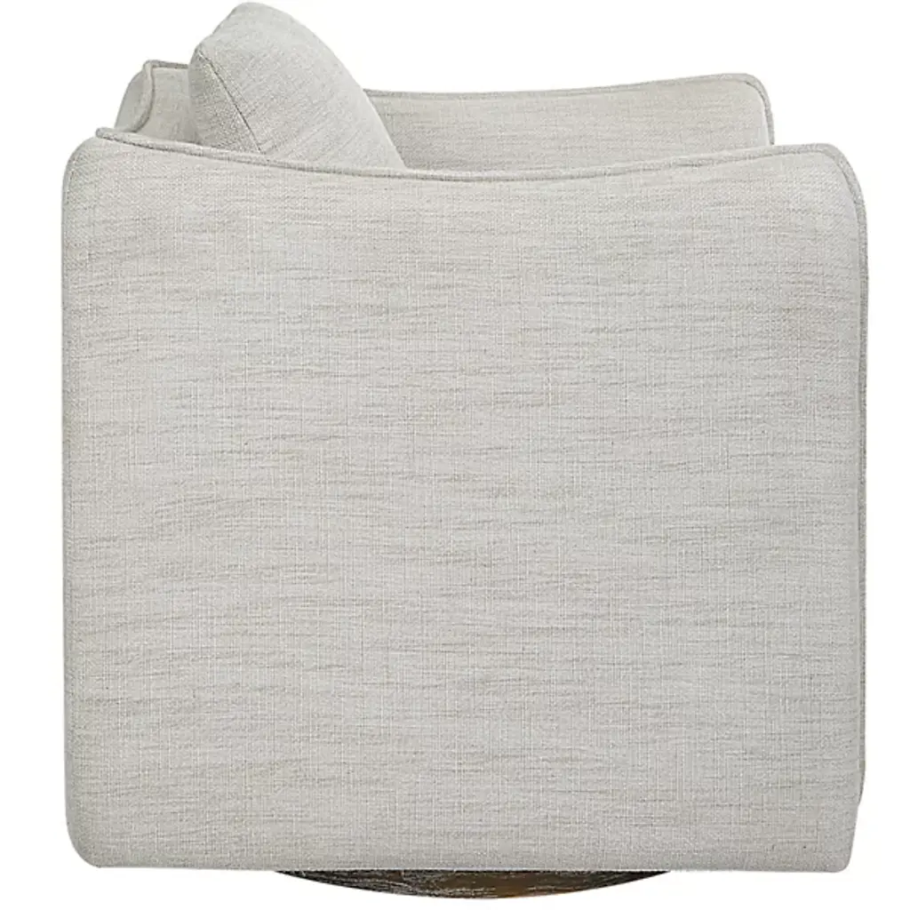 Provide casual sophistication to your living space with the Corben Swivel Armchair by Uttermost. Designed by Matthew Williams, this accent chair boasts a casual shelter arm silhouette, upholstered in a relaxed fabric for a laid-back vibe. Its flanged edge trim and loose back pillow offer subtle detailing and added comfort. Supported by a solid birch wood swivel base with a weathered exterior finish for a note of contrast, this chair effortlessly combines contemporary style with functional design. The seat's blend of comfort and modern aesthetics enhances any contemporary interior.