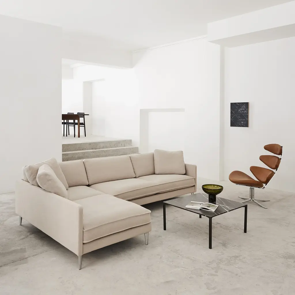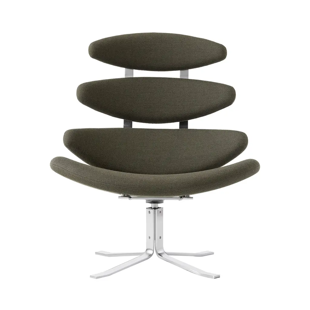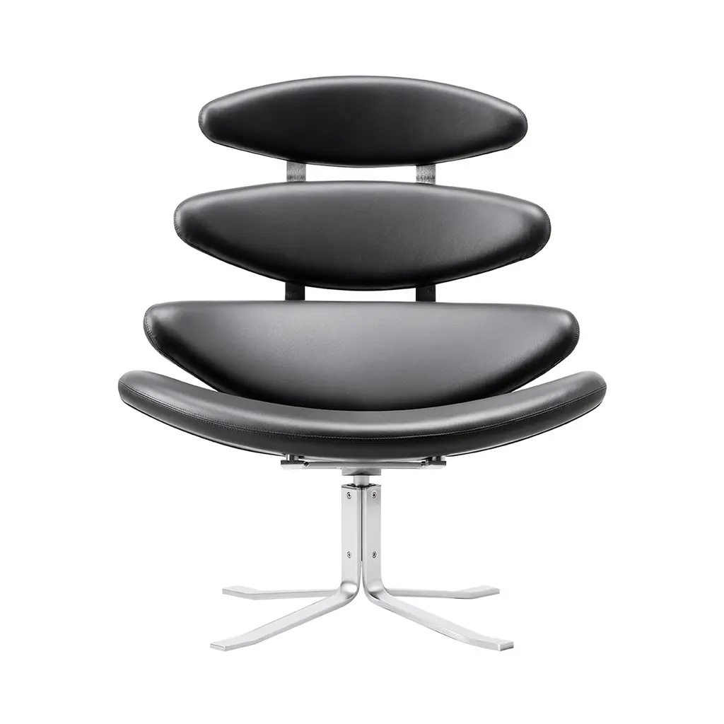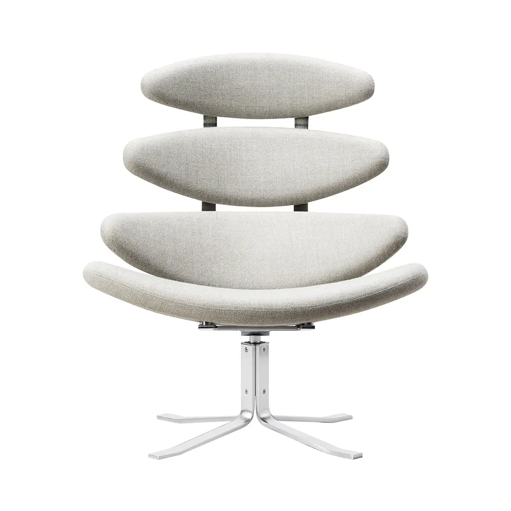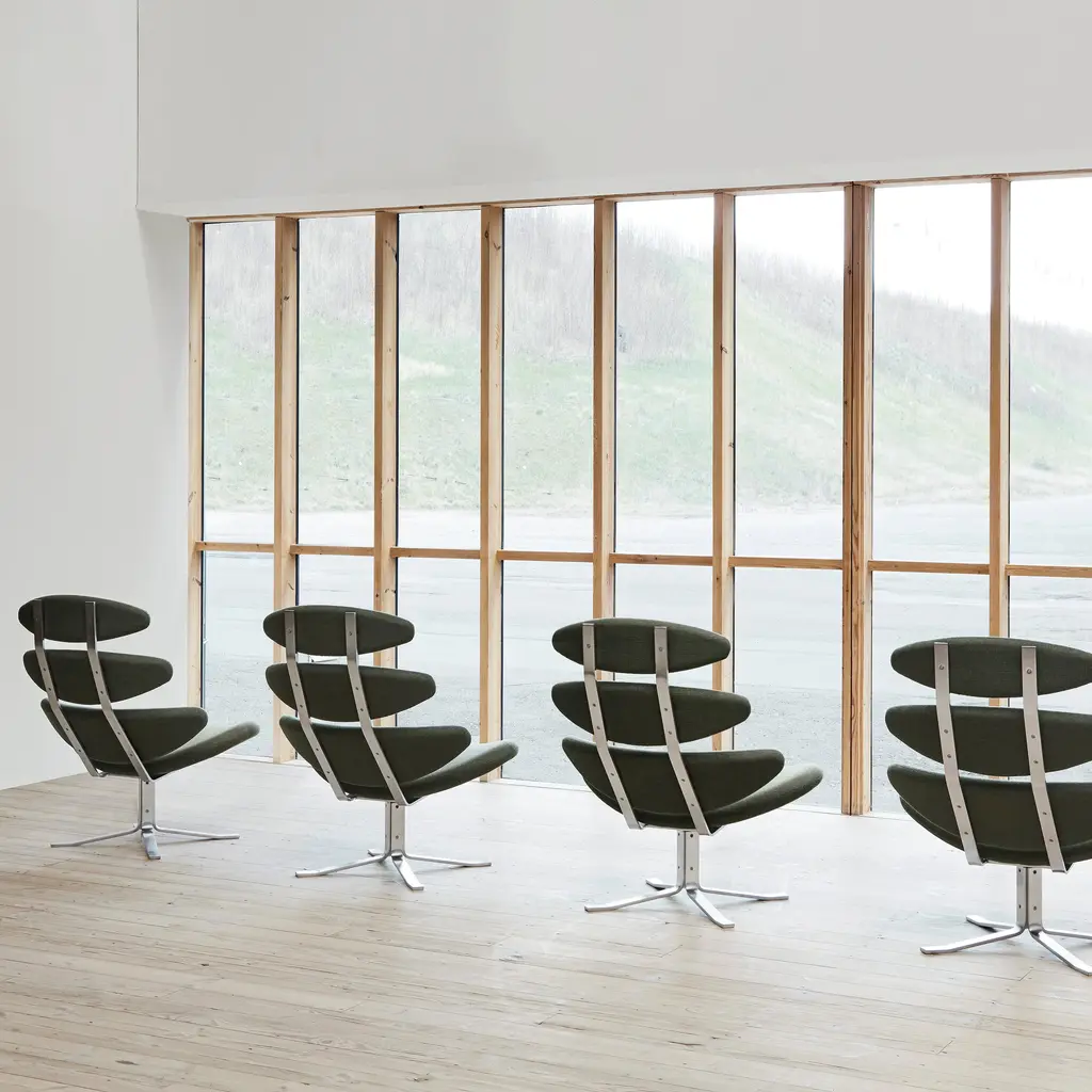 Four elliptical seat pads, each decreasing in size, give the Corona Chair its distinctive, sculptural profile—balancing visual intrigue with ergonomic support. Designed by Danish designer Poul M. Volther in 1964, the chair reflects his commitment to functionalism and innovative material use. Influenced by the Bauhaus movement and trained as a cabinetmaker, Volther aimed to create furniture that was both practical and striking. The frame is crafted from spring steel with a swivel base, while the seat pads are molded from cold-cured foam and upholstered in fabric or leather.