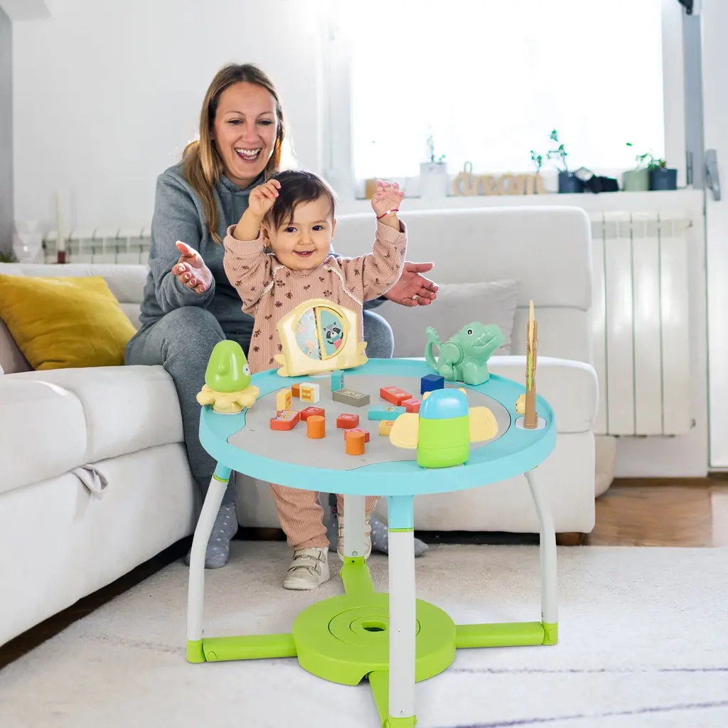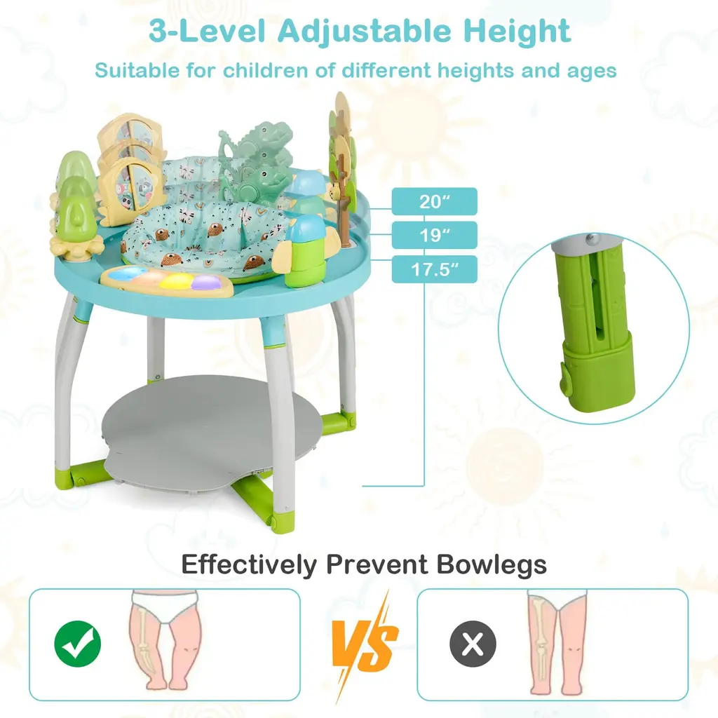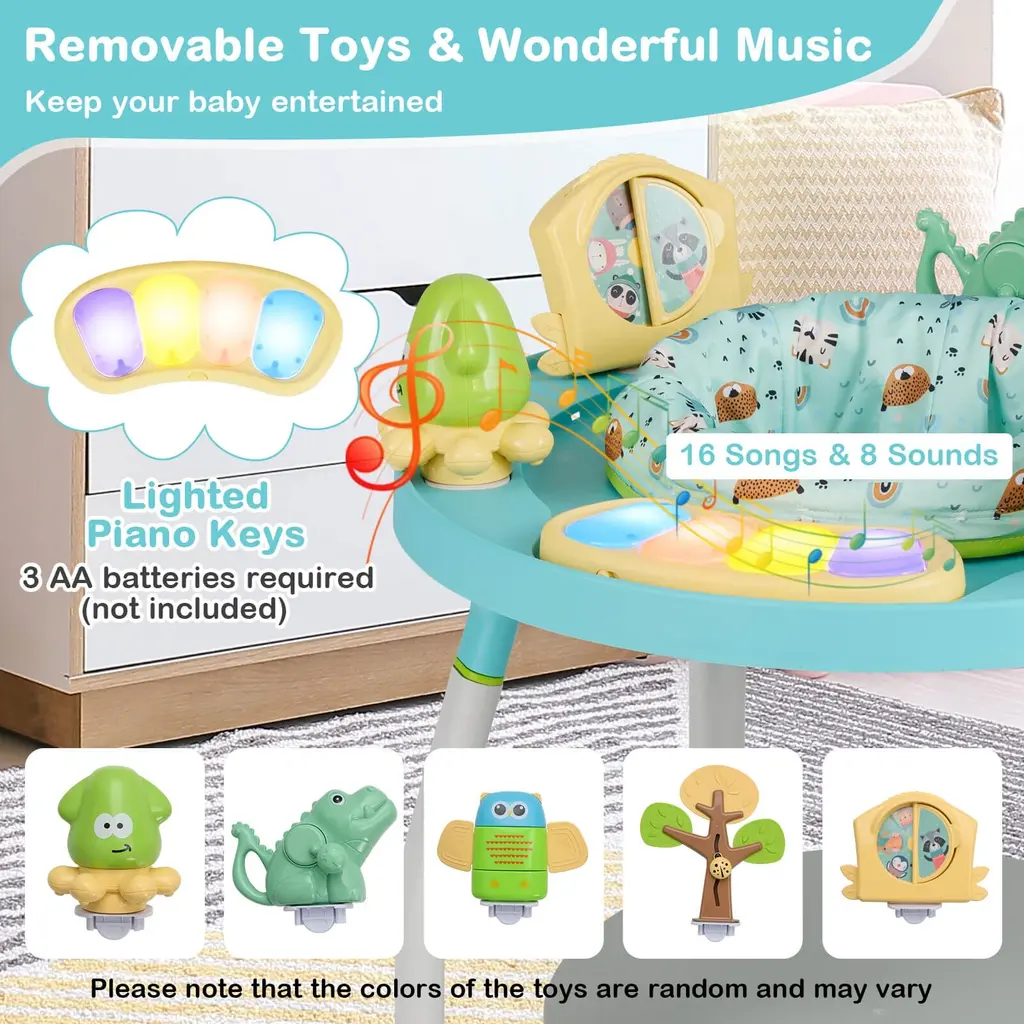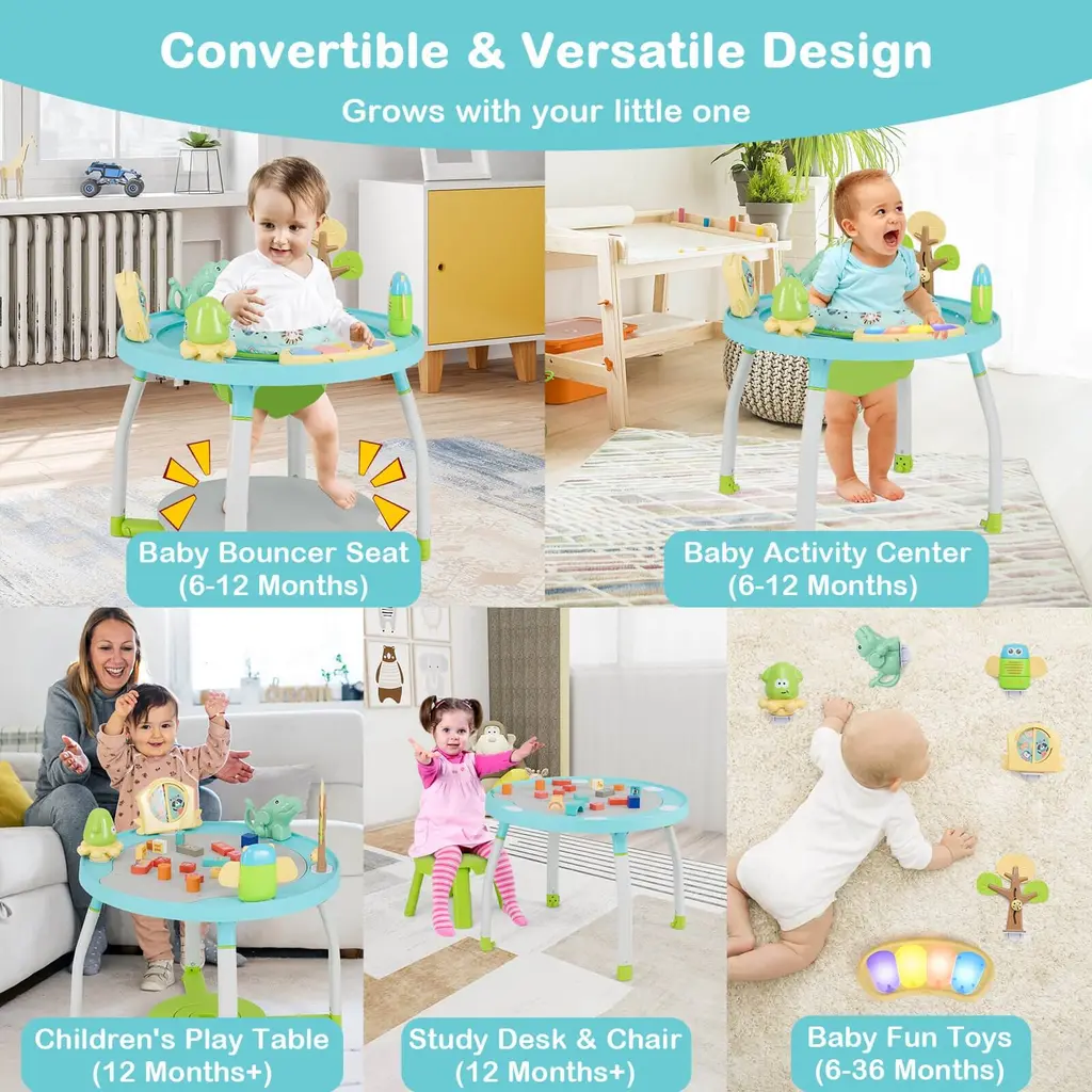 Introducing our 5-in-1 baby activity center, a must-have for children aged 6-36 months. This convertible design effortlessly transforms into a bouncer seat, baby activity center, play table, or study desk & chair set, providing endless fun and functionality. All the interactive toys can be removed separately to play. With 3 adjustable height settings, this seat grows with your child to promote proper posture and prevent bowlegs. The 360° swivel seat allows for free movement, while the interactive toys keep little ones engaged and promote intellectual development. Don't miss out on this treasure trove of developmental benefits for your little one!FeatureGrows with your little one with 5-in-1 multi-functional design 360° rotating seat allows your baby to play all toys with ease Removable toys & wonderful music keep your baby entertained Lighted piano keys with 16 songs & 8 sounds for added fun 3 AA batteries required (not included) for the lighted piano keys level adjustable height suitable for children of different heights and ages 3-Removable & washable seat cushion is ultra-soft, breathable and skin-friendly Perfect gift to promote your baby's development in a fun and engaging way Please note that the colors of the toys are random and may varySpecificationColor: Blue/White/Pink Material: ABS, PP, TPR, Metal, Fabric Product Dimensions of Bounce Activity Saucer: 23.5" x 23.5" x 25"/27"/27.5"(L x W x H) Size of Study Desk: 17.5"/19"/20" Size of Bounce Platform: 20" x 17.5"(L x W) Size of Foldable Chair: 11" x 11" x 8.5"(L x W x H) Suitable Age: 6-36 Months Old Weight Capacity: 25 lbs Net Weight: 21 lbs Package Includes: 1 x Bouncing Activity Center 1 x User Manual