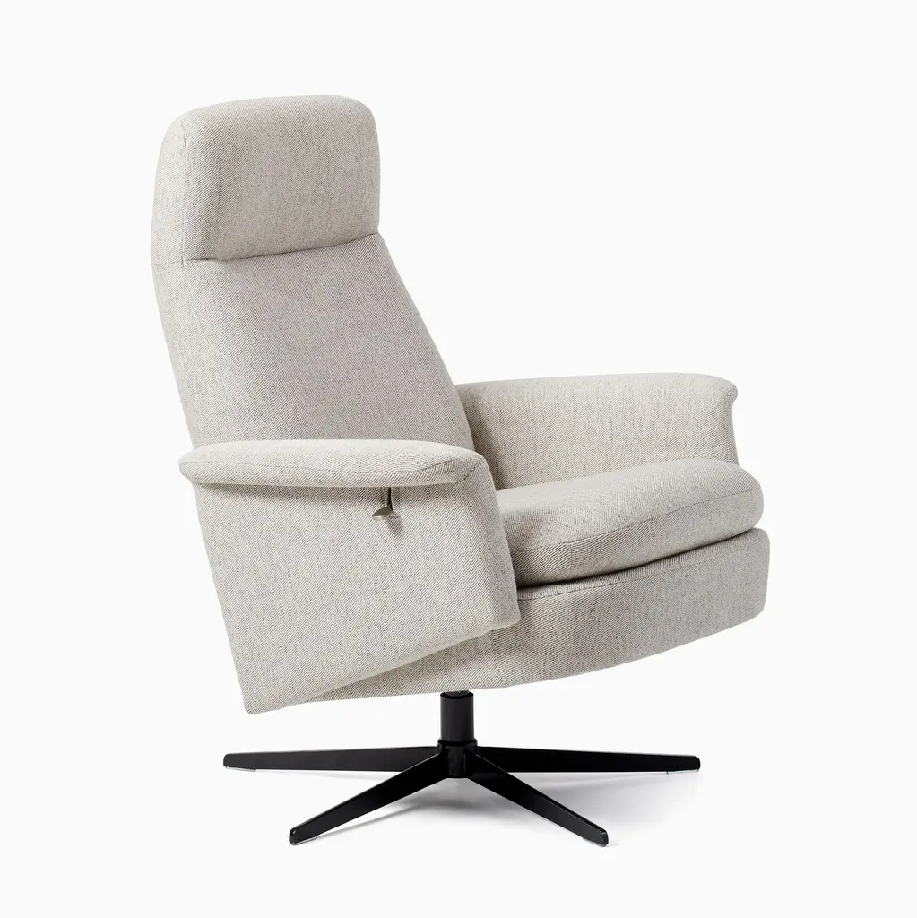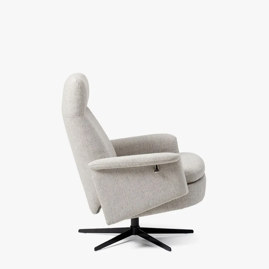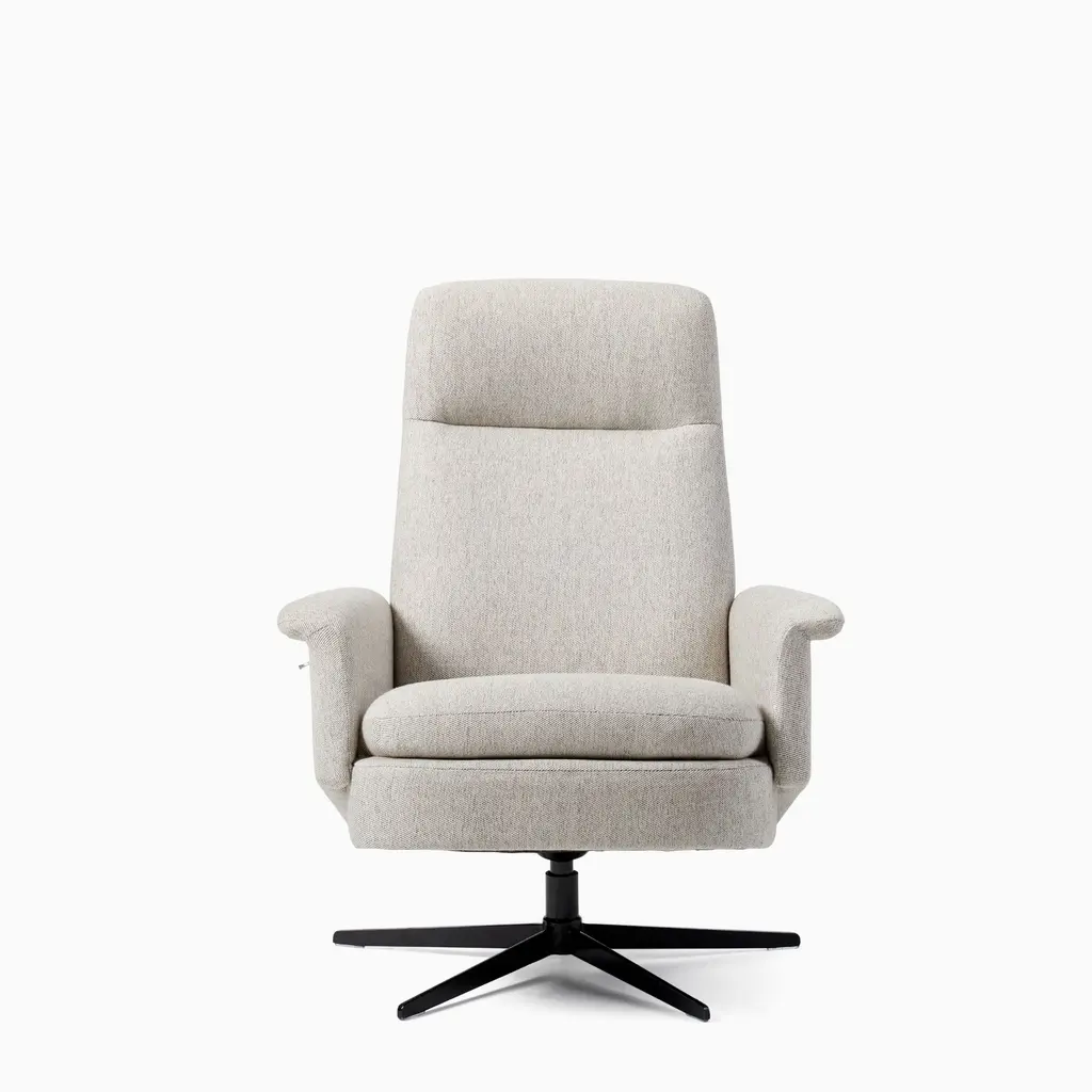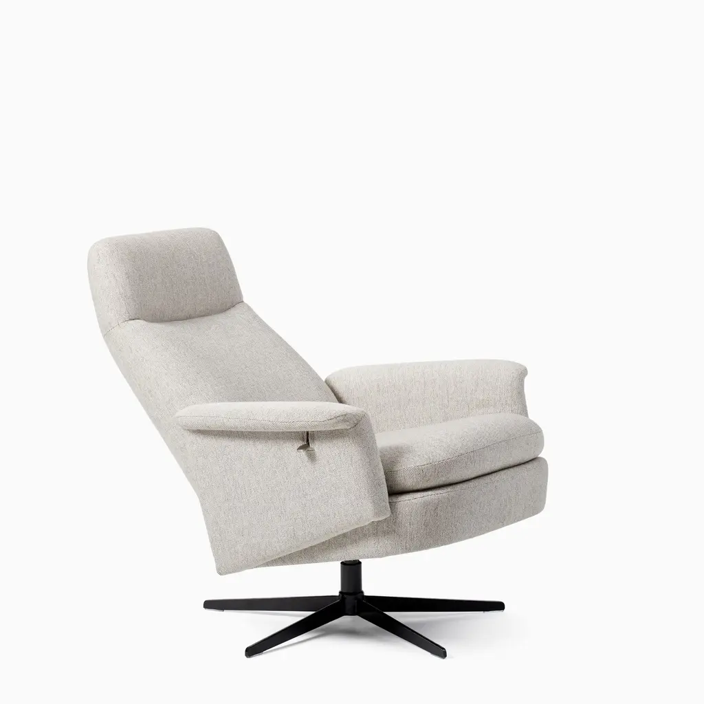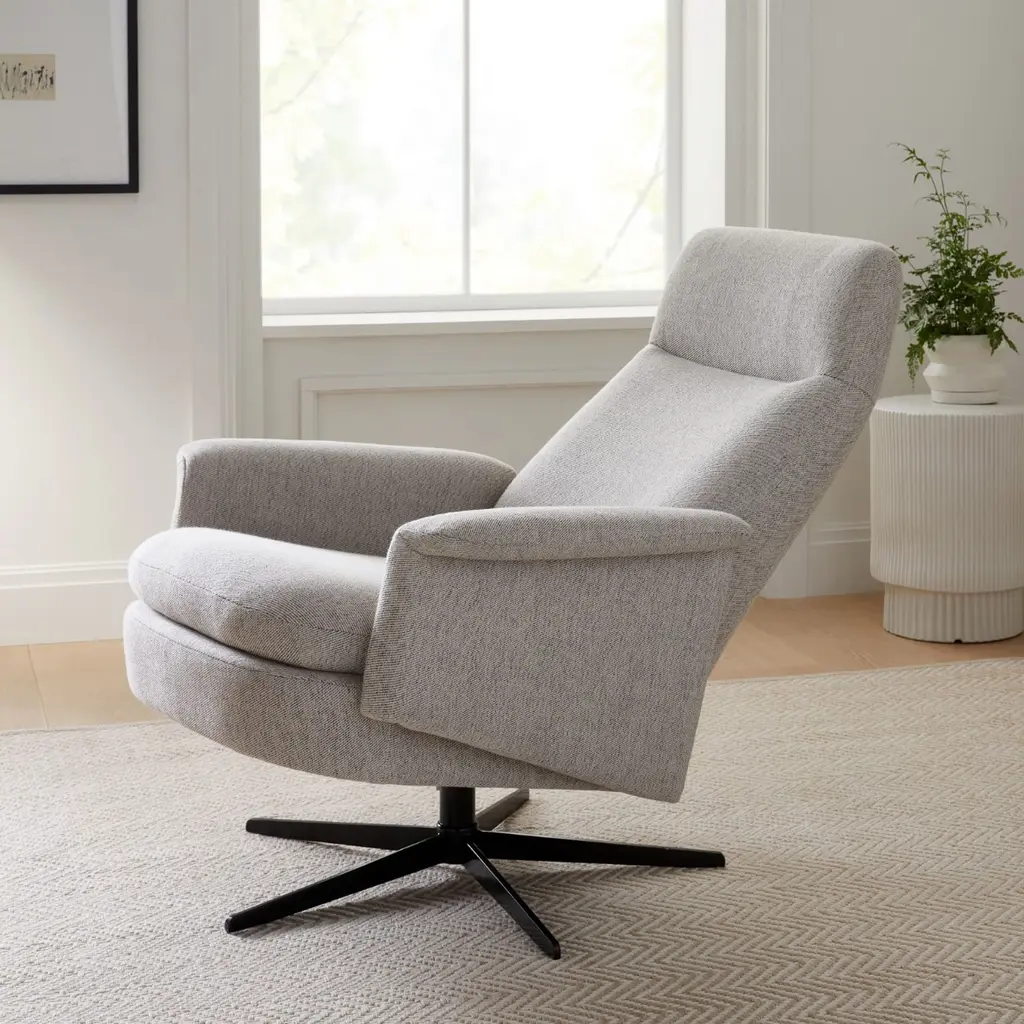 This contemporary chair lets you recline in comfort. Slightly flared arms add a unique design detail. It has a sleek metal swivel base for easy turning. Contract Grade for unmatched durability.