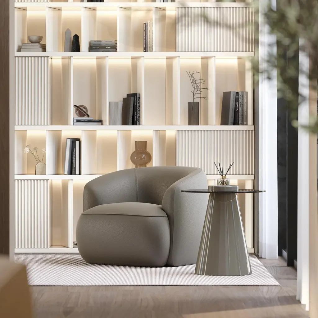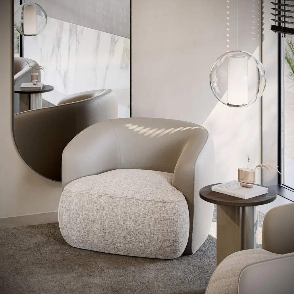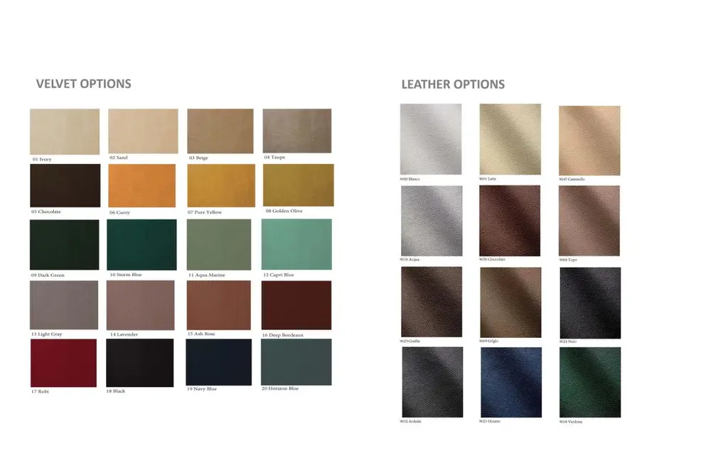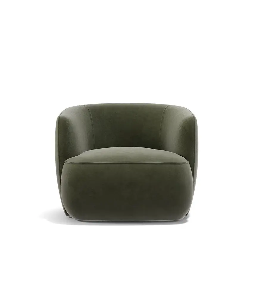 A sculptural statement in tone-on-tone green, this custom-made swivel armchair features a smooth matte leather shell enveloping a plush velvet seat. The silhouette is soft yet structured, with a rounded, embracing backrest and an oversized cushion that gently protrudes for comfort and visual balance. Perfect for refined interiors that seek character, comfort, and elevated materiality in a monochromatic palette.We do our best to expedite production and to ship and deliver product within the listed lead time, however current lead times might be longer due to global shipping backlog and delays. These delays are out of our control and cannot be a reason to cancel an order.