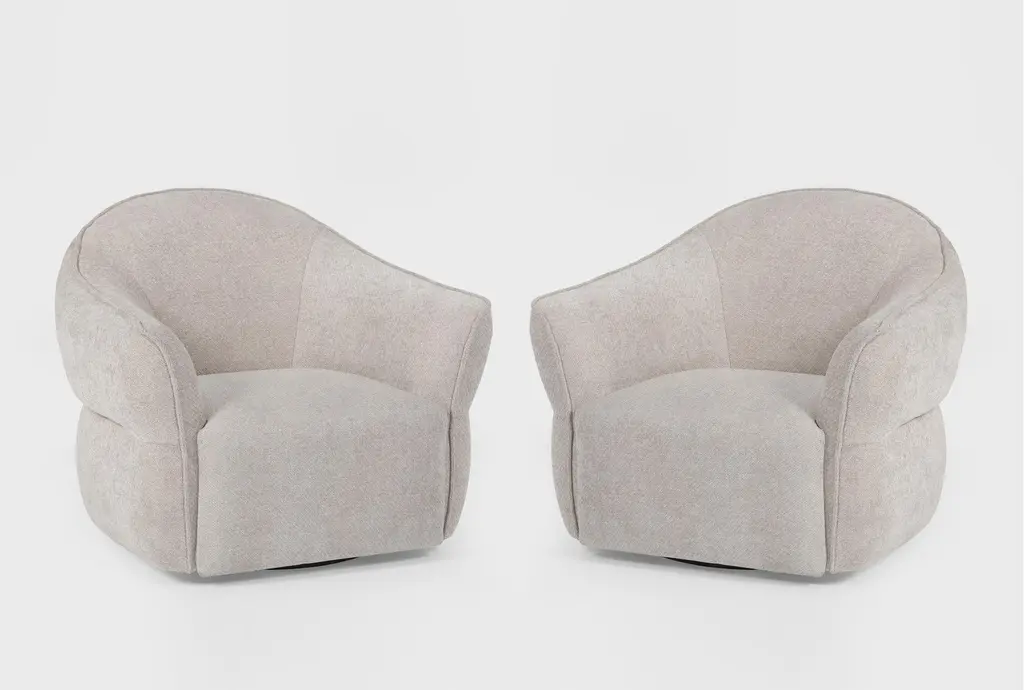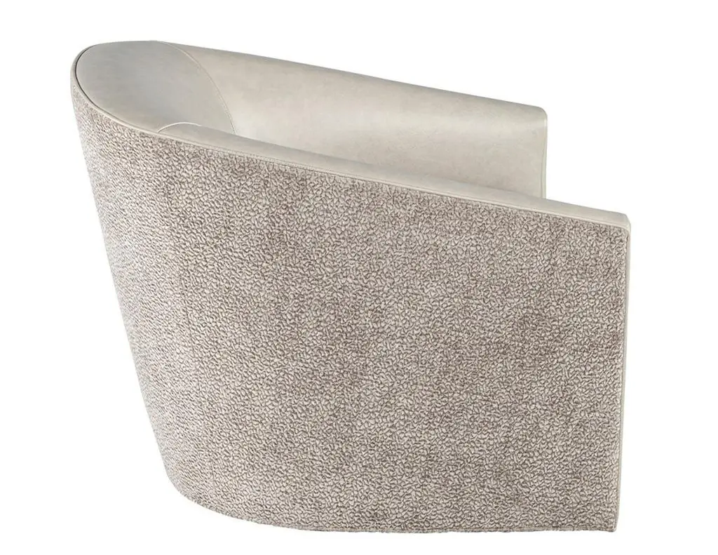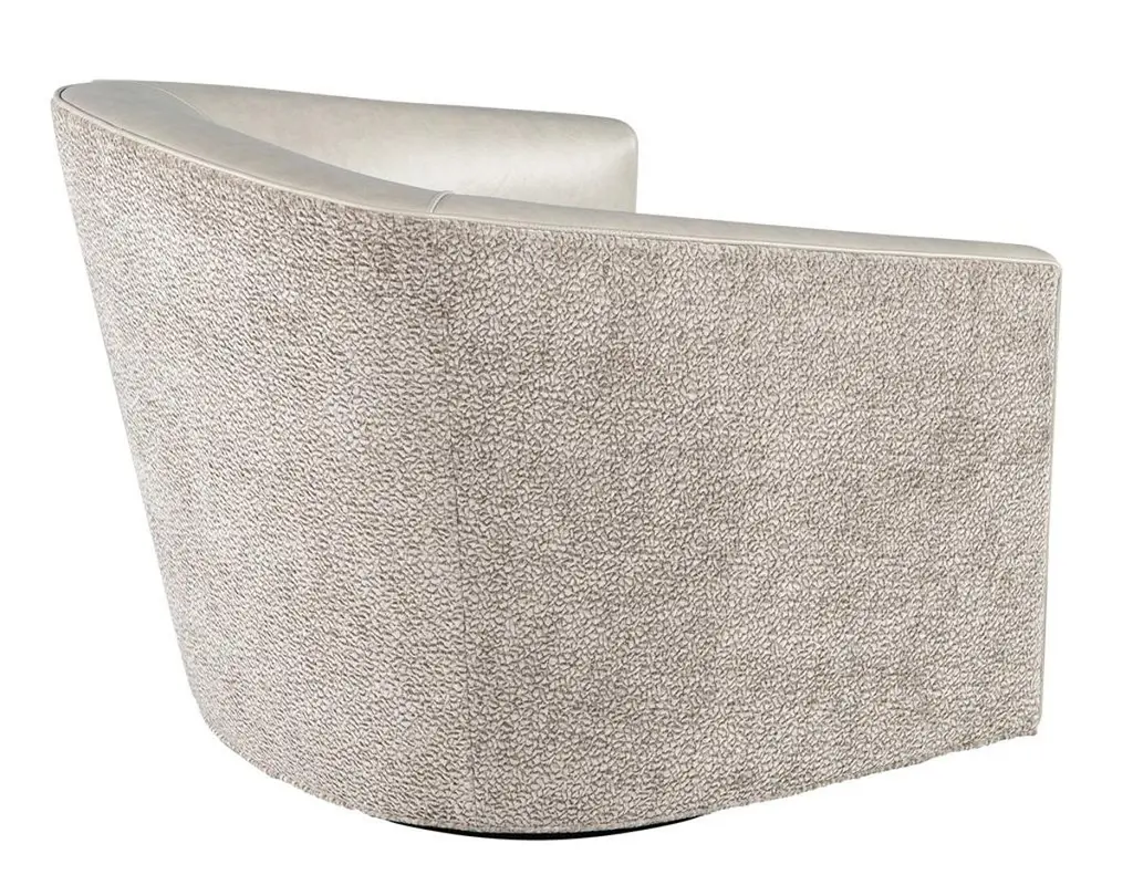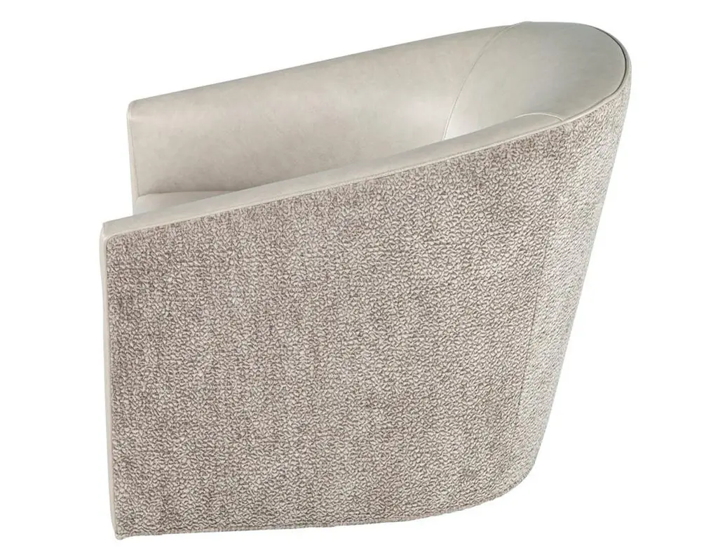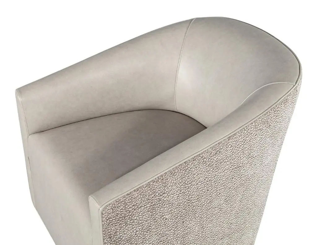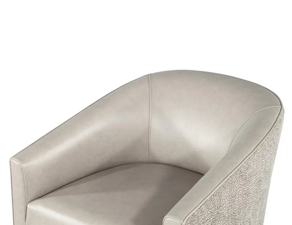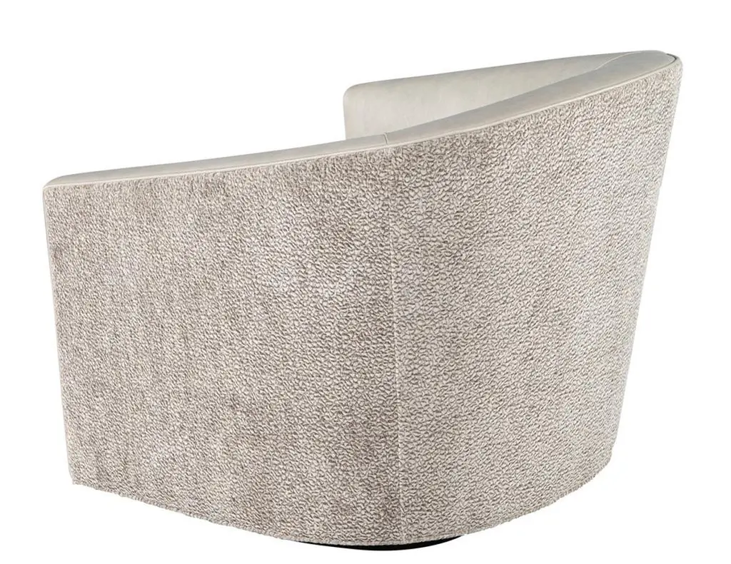 Elevate your living space with this exquisite pair of custom modern swivel chairs, meticulously handcrafted by the artisans at Carrocel. Boasting a unique curved design, these chairs are an elegant fusion of form and function, designed to invite comfort and style into your home. The sloped armrests offer a sophisticated touch, allowing you to sink into relaxation while maintaining a chic silhouette. Featuring a smooth swivel mechanism, you can effortlessly turn to engage in conversation or enjoy your surroundings without the hassle of getting up. The chairs stand out with a striking two-tone combination that gracefully marries warm grey leather with a contrasting textured fabric exterior, creating a dynamic visual appeal that enlivens any room. Each piece is customizable, allowing you to select from a vast array of materials to perfectly match your decor and personal taste. Whether you desire a sleek modern look or wish to inject a pop of color, these chairs can be tailored to suit your unique vision, making them a distinctive and functional addition to your home. With the embodiment of craftsmanship and design finesse, these swivel chairs are not just furniture—they are artful statements of style and comfort.Price includes curb side shipping within the continental USA.