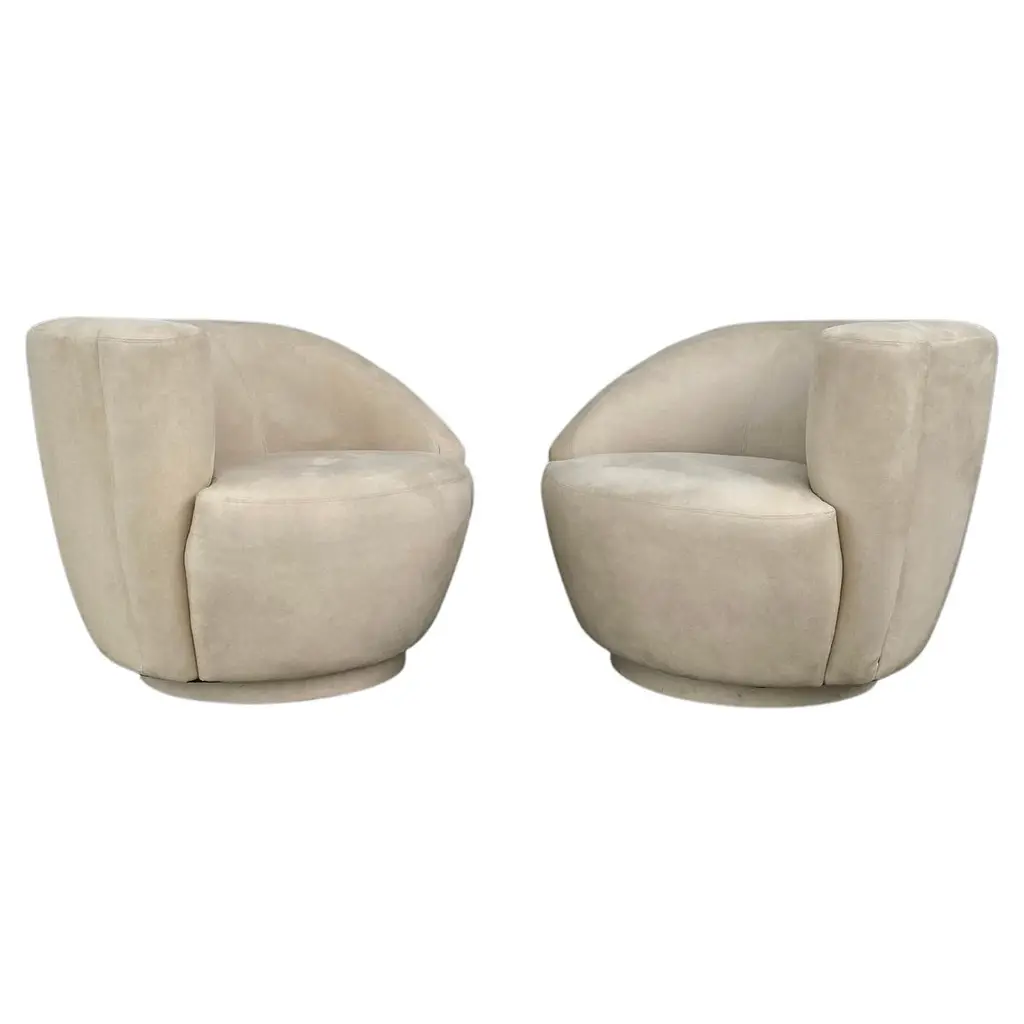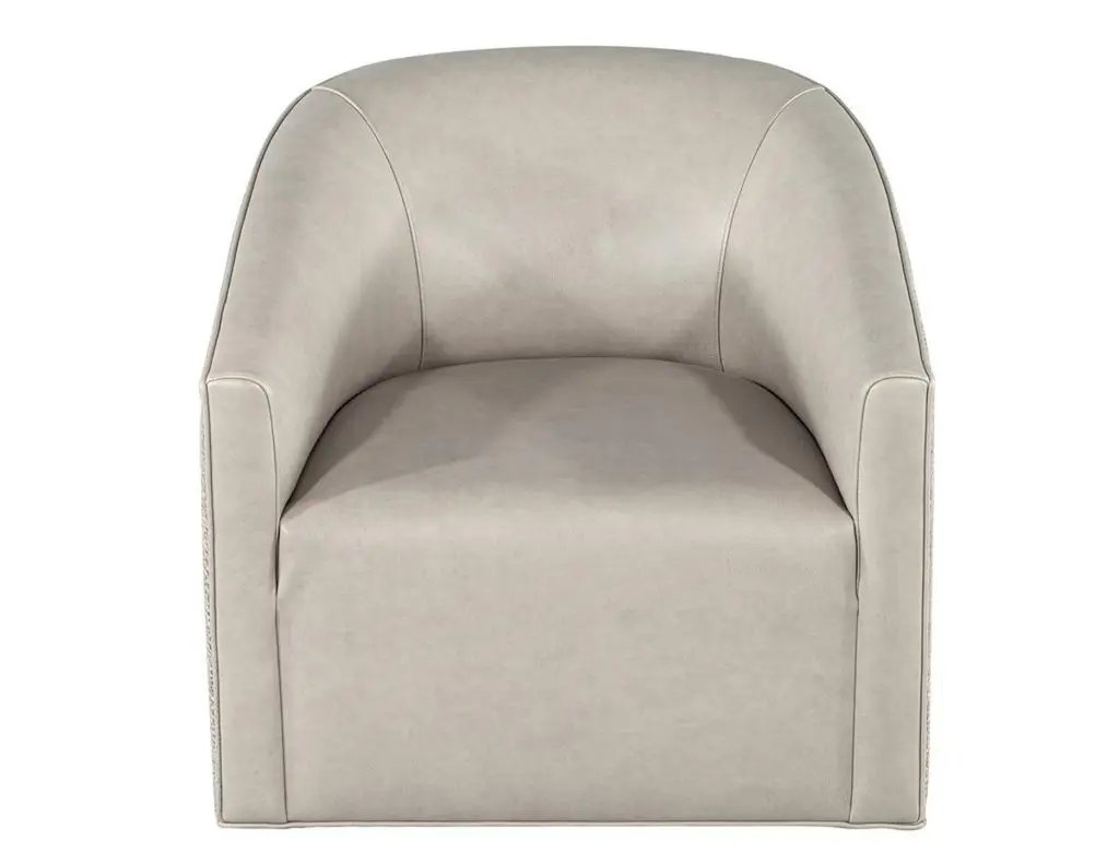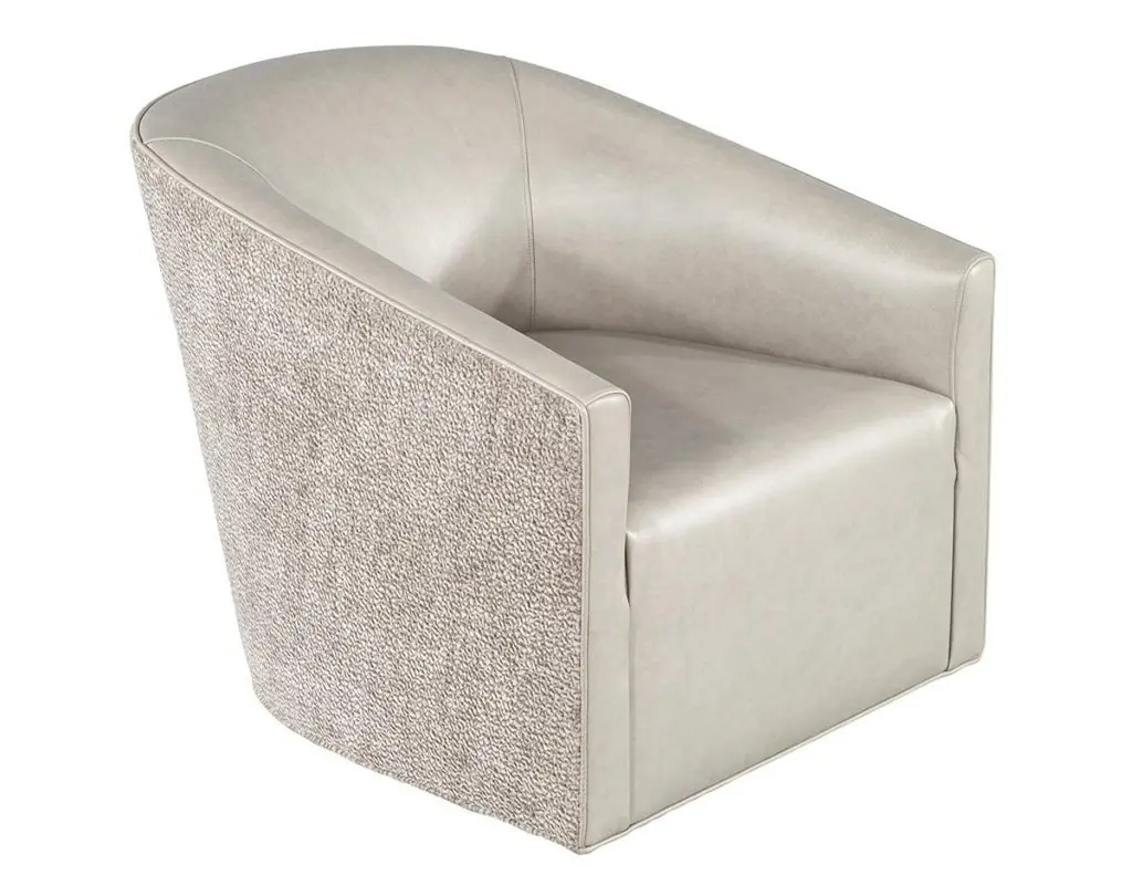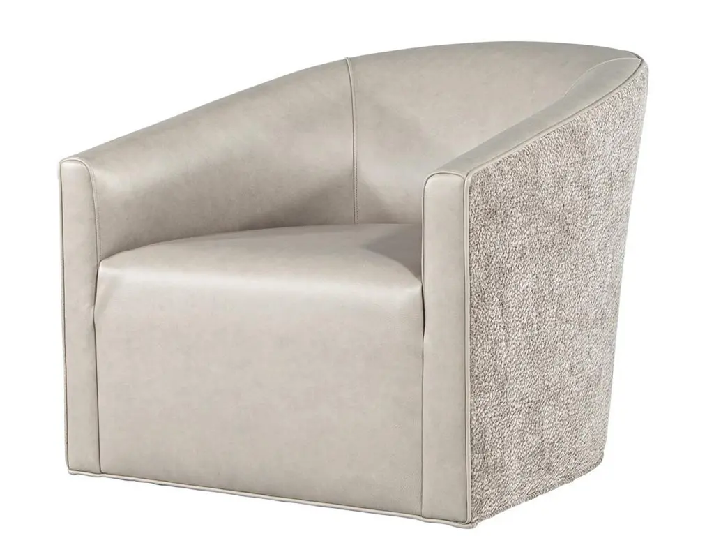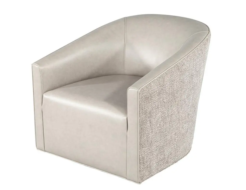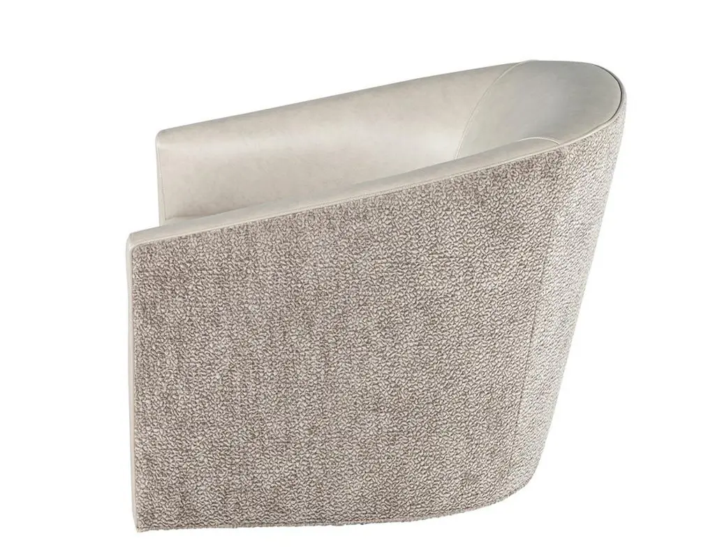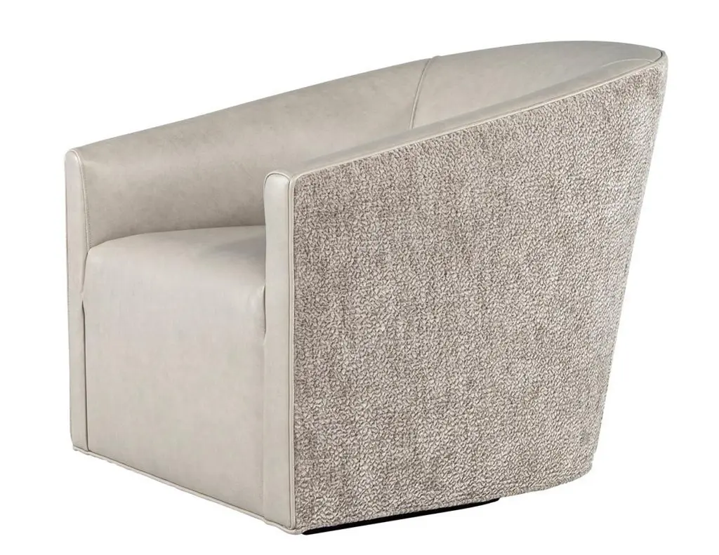 Elevate your living space with this exquisite pair of custom modern swivel chairs, meticulously handcrafted by the artisans at Carrocel. Boasting a unique curved design, these chairs are an elegant fusion of form and function, designed to invite comfort and style into your home. The sloped armrests offer a sophisticated touch, allowing you to sink into relaxation while maintaining a chic silhouette. Featuring a smooth swivel mechanism, you can effortlessly turn to engage in conversation or enjoy your surroundings without the hassle of getting up. The chairs stand out with a striking two-tone combination that gracefully marries warm grey leather with a contrasting textured fabric exterior, creating a dynamic visual appeal that enlivens any room. Each piece is customizable, allowing you to select from a vast array of materials to perfectly match your decor and personal taste. Whether you desire a sleek modern look or wish to inject a pop of color, these chairs can be tailored to suit your unique vision, making them a distinctive and functional addition to your home. With the embodiment of craftsmanship and design finesse, these swivel chairs are not just furniture—they are artful statements of style and comfort.Price includes curb side shipping within the continental USA.