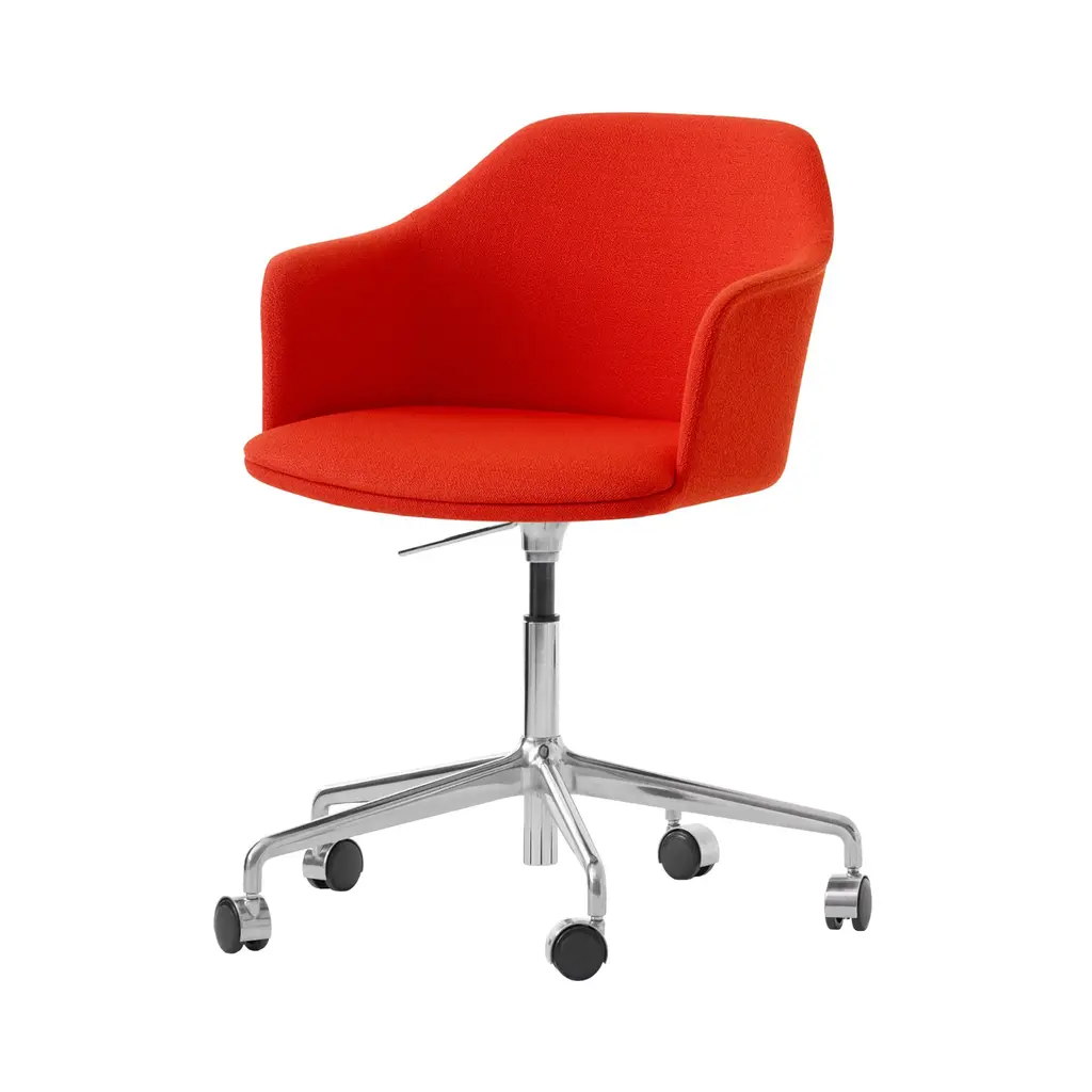This elegant upholstered visitor armchair is characterized by a low backrest and a 5-star base, that can swivel and move up and down.